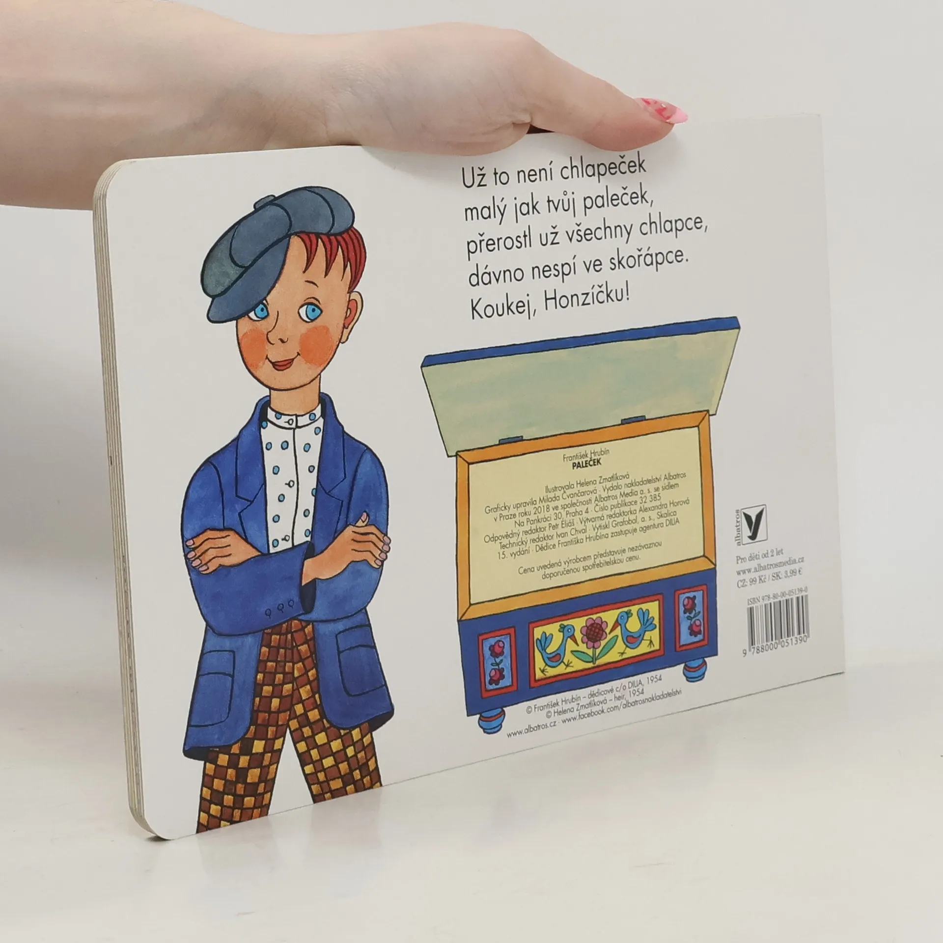 Pohádka přebásněná Františkem Hrubínem, klasikem české poezie, je doprovázena půvabnými obrázky Heleny Zmatlíkové. Hezké vyprávění je o chlapečkovi, který byl tak malinký, že se koupal v náprstku, spal v ořechové skořápce a snídal tři máčky. Zkrátka byl to Paleček!