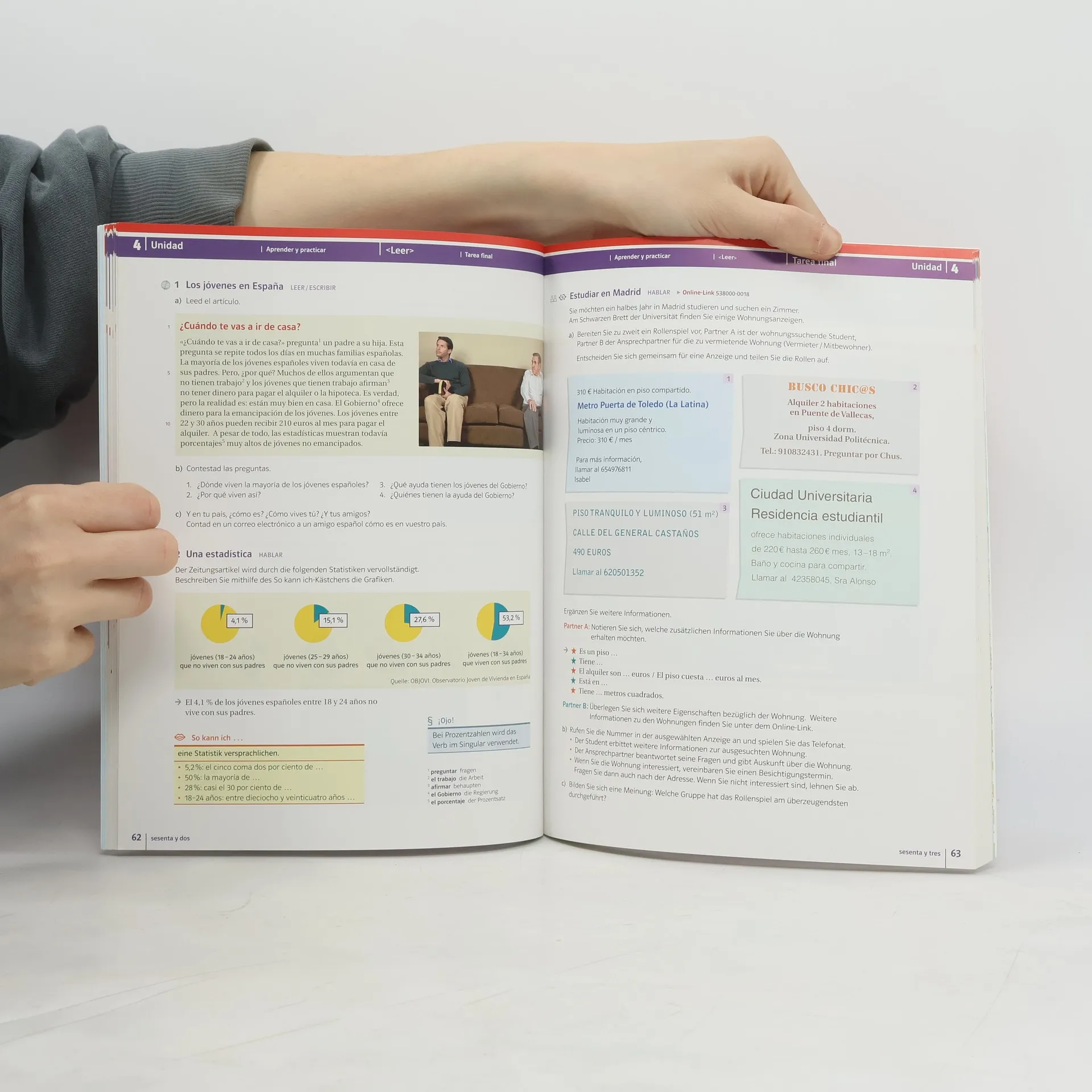 9 Unidades, linearer Buchaufbau mit 3 Plateauphasen. Die Protagonisten sind sympathische Jugendliche aus Madrid mit unterschiedlichen schulischen und beruflichen Laufbahnen. Am Ende jeder Unidad steht die Tarea final – eine komplexe Lernaufgabe, in der die erworbenen Kompetenzen eingesetzt werden können.Die Themen- ¡Hola! ¿Qué tal?- ¿Qué te gusta? - En el instituto- Anuncios de piso- La fiesta- Un viaje a Málaga- Mandar un currículum- El mundo del trabajo- ArgentinaHinweis zur Grammatik: Als zusätzliches Angebot zur im Schülerbuch enthaltenen Gramática (Seite 142–176) steht Ihnen eine lektionsbegleitende Grammatik als Online-Link 538000-0050 zur Verfügung. Zur lektionsbegleitenden Grammatik