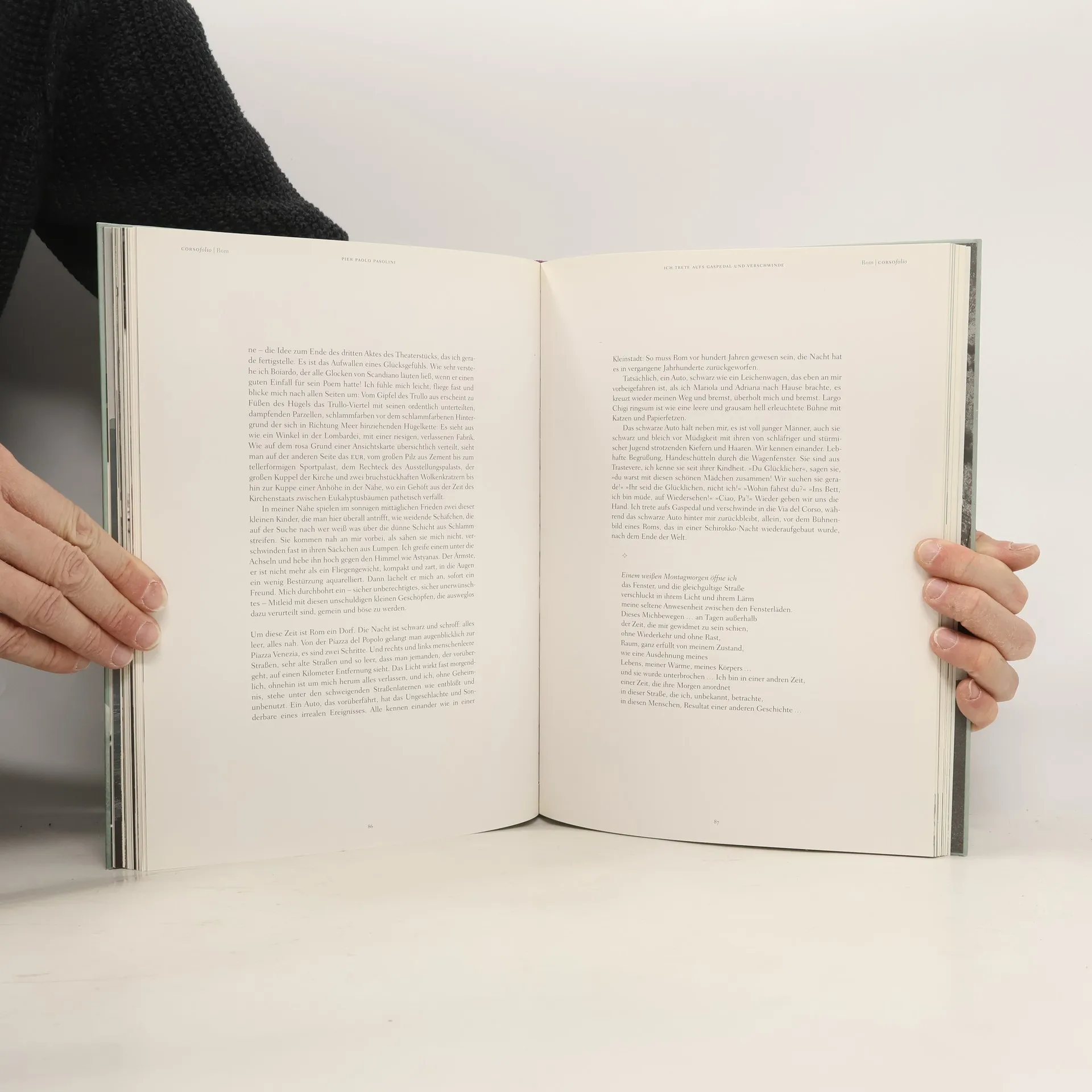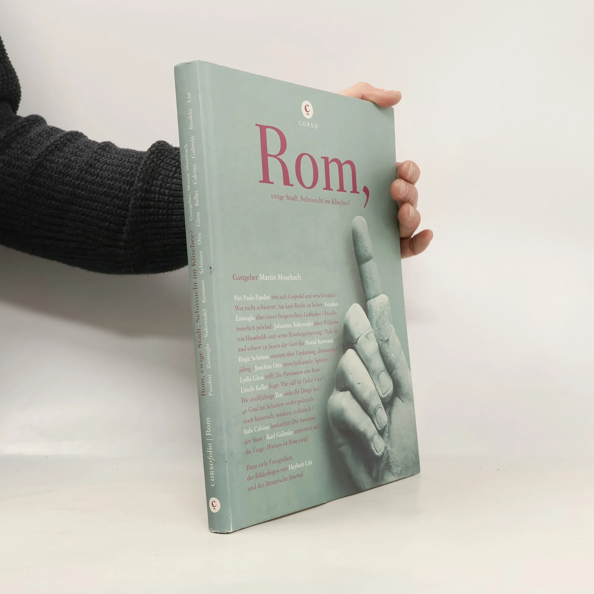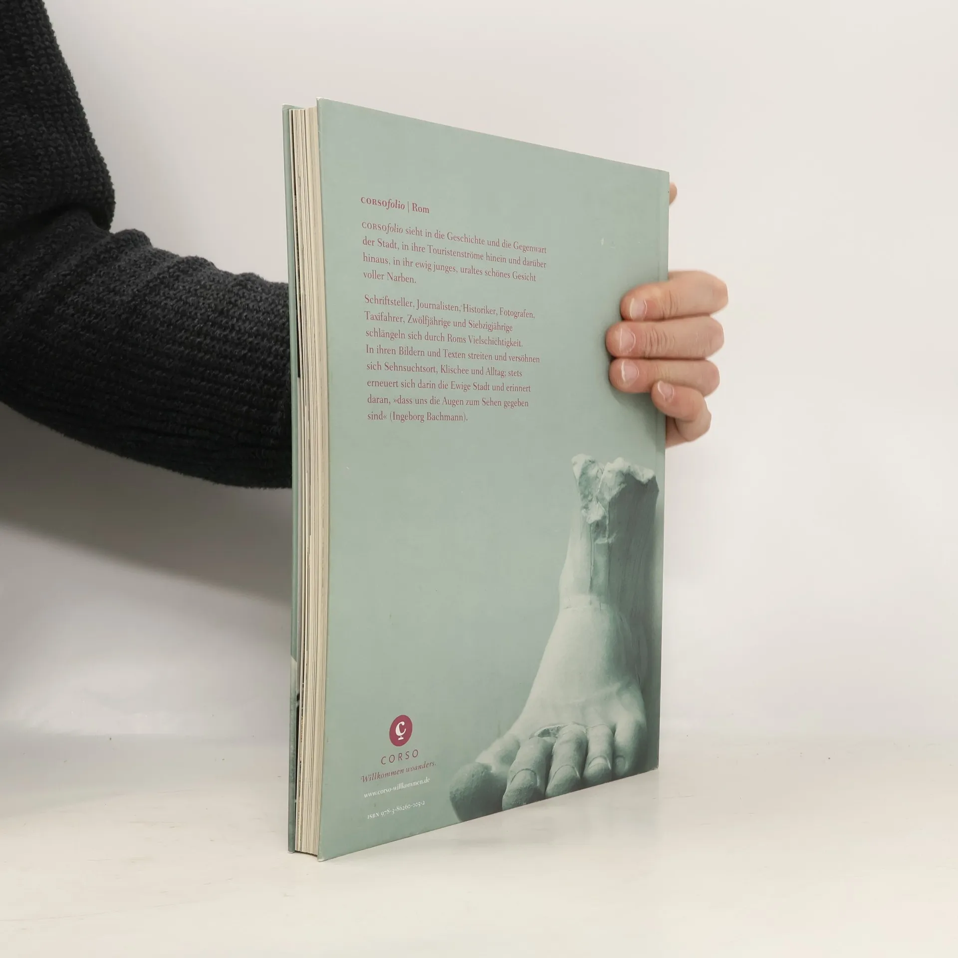 Corsofolio sieht in die Geschichte und die Gegenwart der Stadt, in ihre Touristenströme hinein und darüber hinaus, in ihr ewig junges, uraltes schönes Gesicht voller Narben. Schriftsteller, Journalisten, Historiker, Fotografen, Taxifahrer, Zwölfjährige und Siebzigjährige schlängeln sich durch Roms Vielschichtigkeit. In ihren Bildern und Texten streiten und versöhnen sich Sehnsuchtsort, Klischee und Alltag; stets erneuert sich darin die Ewige Stadt und erinnert daran, »dass uns die Augen zum Sehen gegeben sind« (Ingeborg Bachmann)