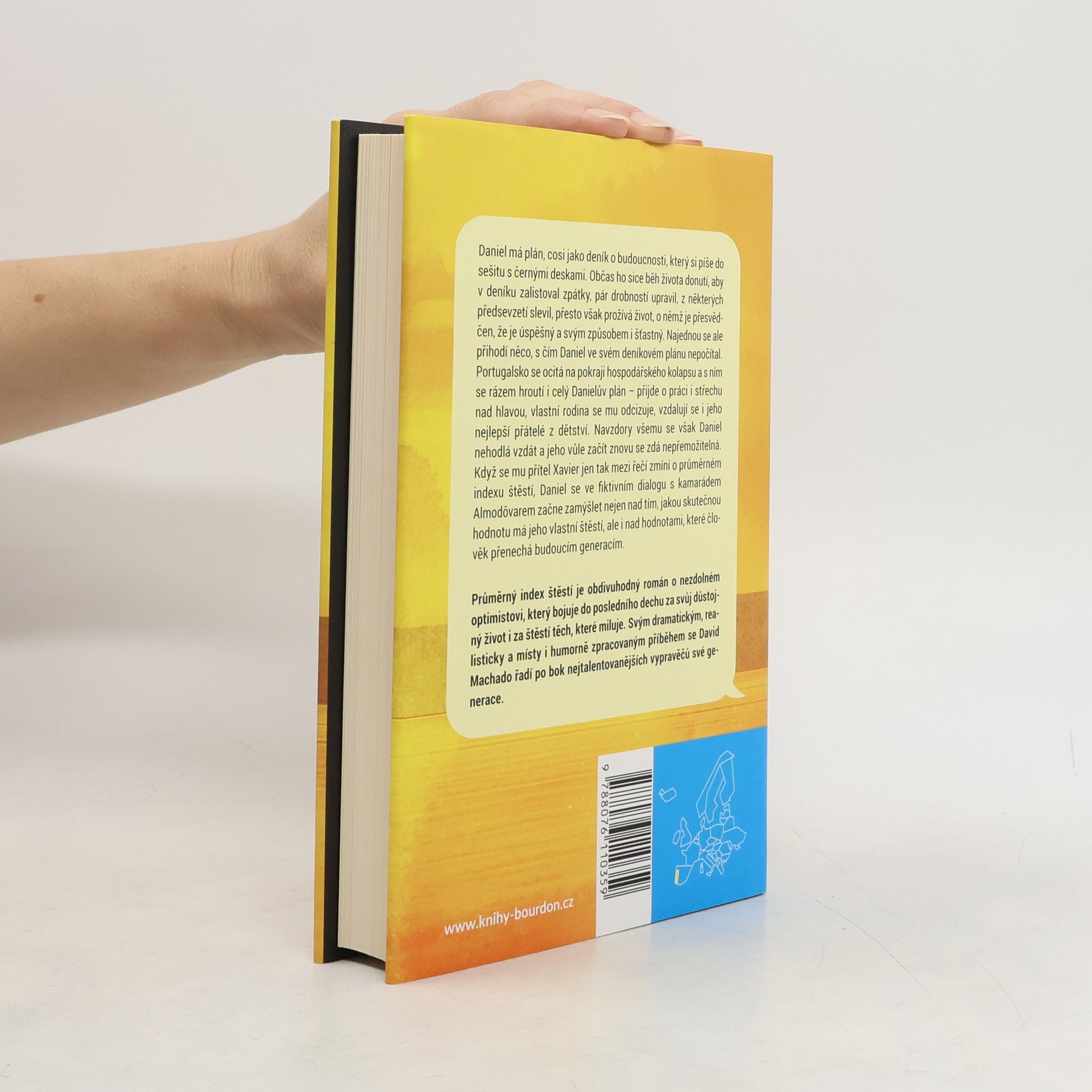 Daniel má plán, cosi jako deník o budoucnosti, který si píše do sešitu s černými deskami. Občas ho sice běh života donutí, aby v deníku zalistoval zpátky, pár drobností upravil, z některých předsevzetí slevil, presto však prožívá život, o němž je přesvědčen, že je úspěšný a svým způsobem i šťastný. Najednou se ale přihodí něco, s čím Daniel ve svém deníkovém plánu nepočítal. Portugalsko se ocitá na pokraji hospodářského kolapsu a s ním se rázem hroutí i celý Danielův plán – přijde o práci i střechu nad hlavou, vlastní rodina se mu odcizuje, vzdalují se i jeho nejlepší přátelé z dětství. Navzdory všemu se však Daniel nehodlá vzdát a jeho vůle začít znovu se zdá nepřemožitelná. Když se mu přítel Xavier jen tak mezi řečí zmíní o průměrném indexu štěstí, Daniel se ve fiktivním dialogu s kamarádem Almodôvarem začne zamýšlet nejen nad tím, jakou skutečnou hodnotu má jeho vlastní štěstí, ale i nad hodnotami, které člověk přenechá budoucím generacím. Průměrný index štěstí je obdivuhodný román o nezdolném optimistovi, který bojuje do posledního dechu za svůj důstojný život i za štěstí těch, které miluje. Svým dramatickým, realisticky a místy i humorně zpracovaným příběhem se David Machado řadí po bok nejtalentovanějších vypravěčů své generace.