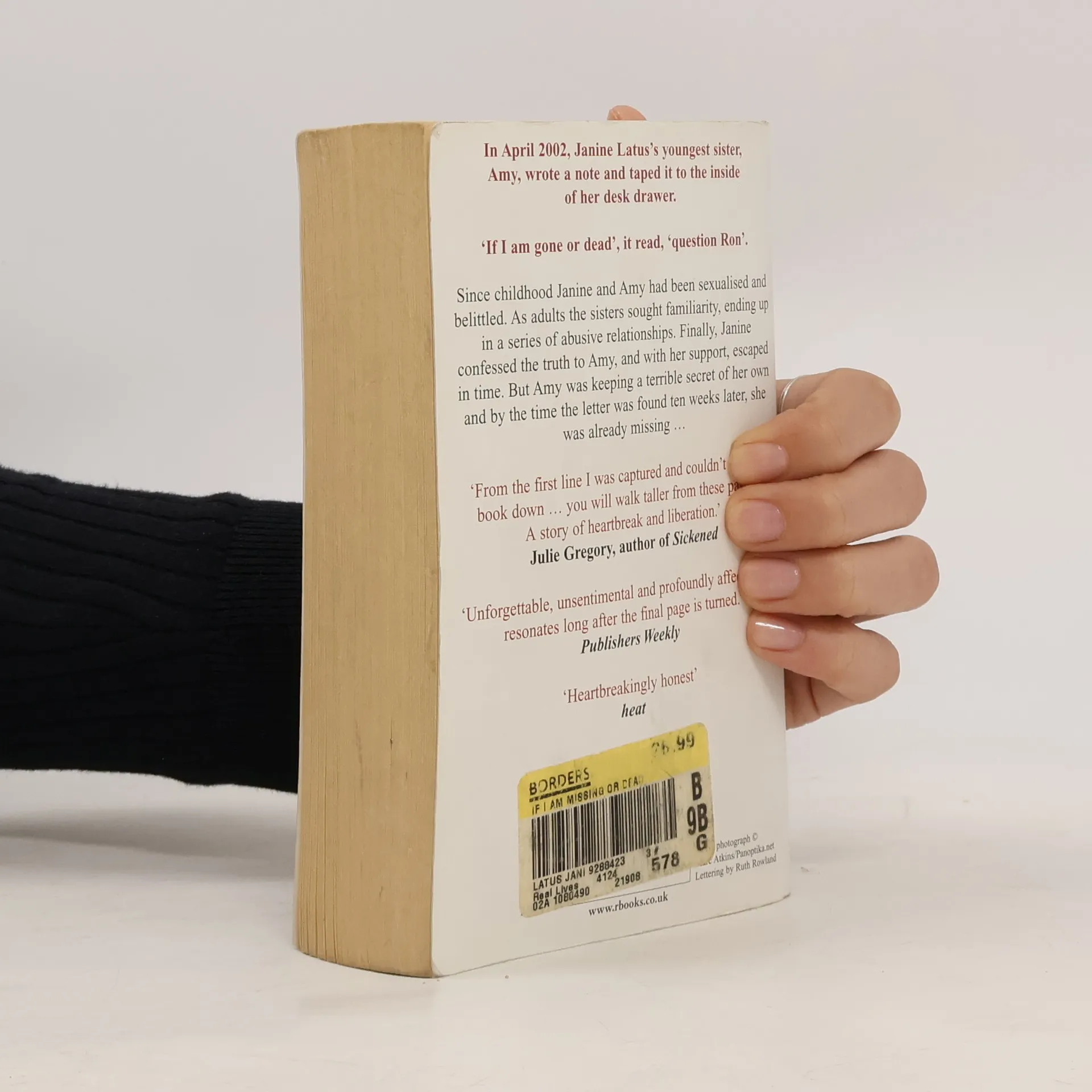 In April 2002, Janine Latus's youngest sister Amy wrote a note and taped it to the inside of her desk drawer. It took more than two weeks to find Amy's body, wrapped in a tarpaulin and buried at a building site. Finally, Janine faced her demons and, with Amy's support, escaped in time. But Amy was keeping a terrible secret of her own ...