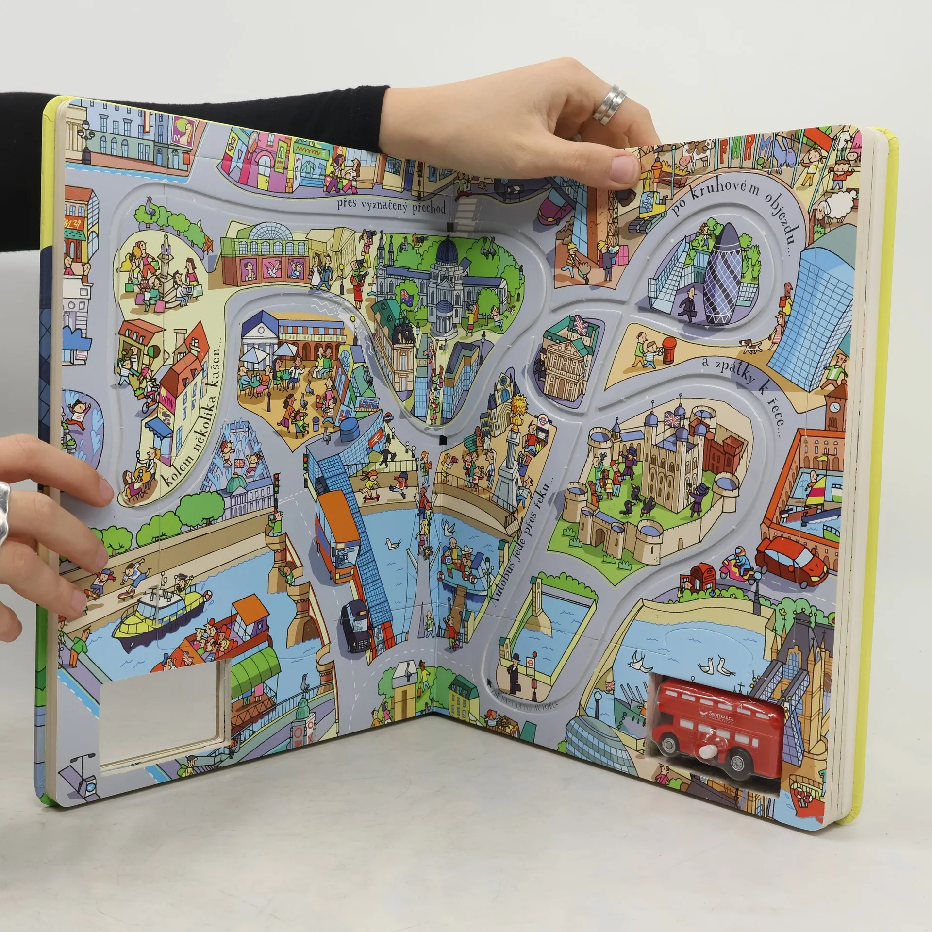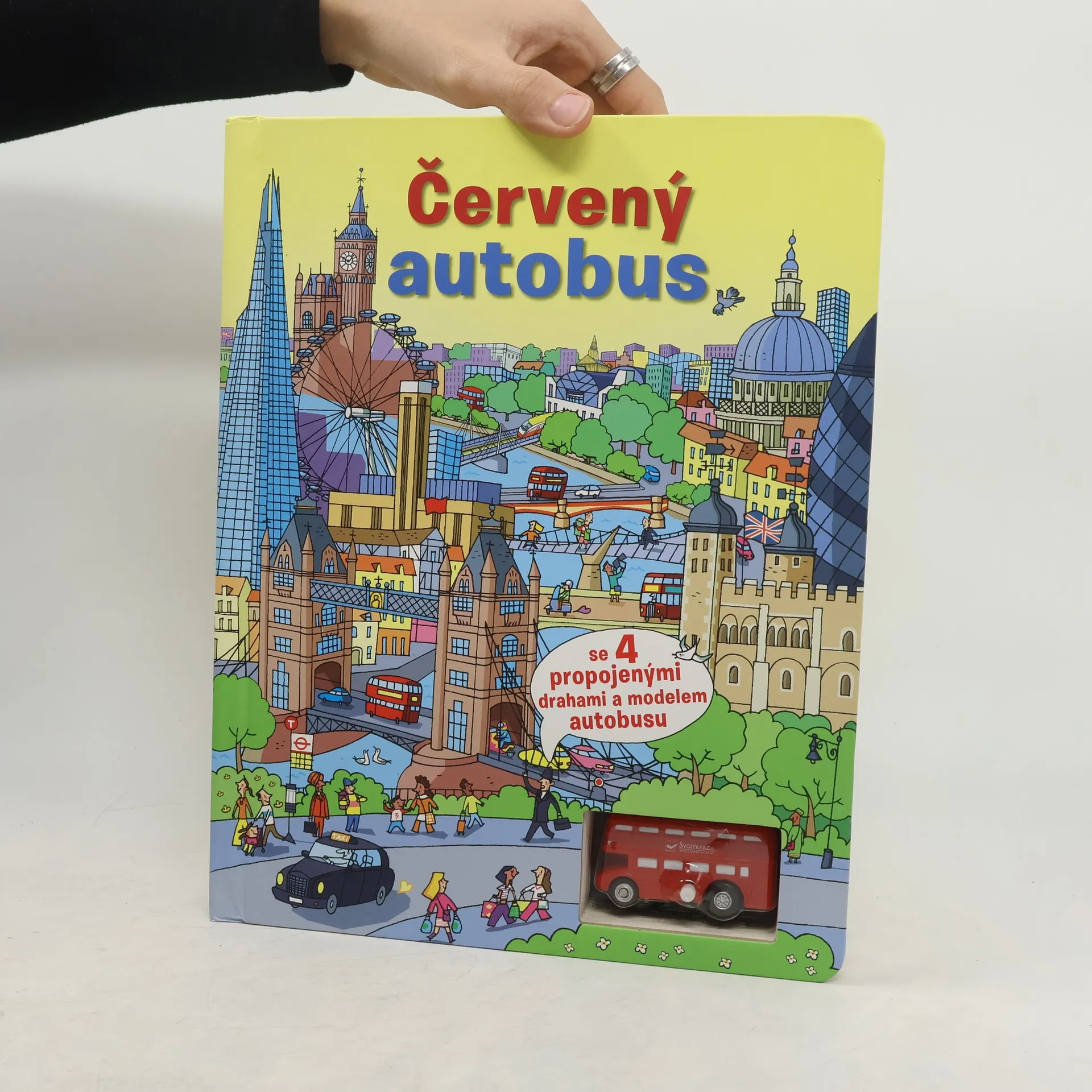 S touto zábavnou knížkou pro děti se 4 propojitelnými drahami a hračkou můžete sledovat červený autobus na jeho cestě.Stačí ho jen natáhnout a položit na dráhu. Červený autobus zastavil a naložil pasažéry, kteří čekali na zastávce. S touto zábavnou knížkou pro děti se 4 drahami a natahovací hračkou jej můžeme sledovat na objevné cestě velkoměstem – Londýnem. Všude je toho spousta k vidění – lidé, stavby, dopravní prostředky. Rozjeďte se s ním okolo parku, kolem zoo, přes přechody a mosty, kolem lunaparku, restaurací, galerie i rušného tržiště zpět na autobusovou zastávku – stačí jen autobus natáhnout, položit ho na dráhu a pustit na některou ze čtyř vyznačených drah. Pro ještě větší zábavu lze jednotlivé díly drah z knihy vyjmout a snadným propojením vytvořit obrovskou klikatou vyhlídkovou trasu. Tak vzhůru za dobrodružstvím!