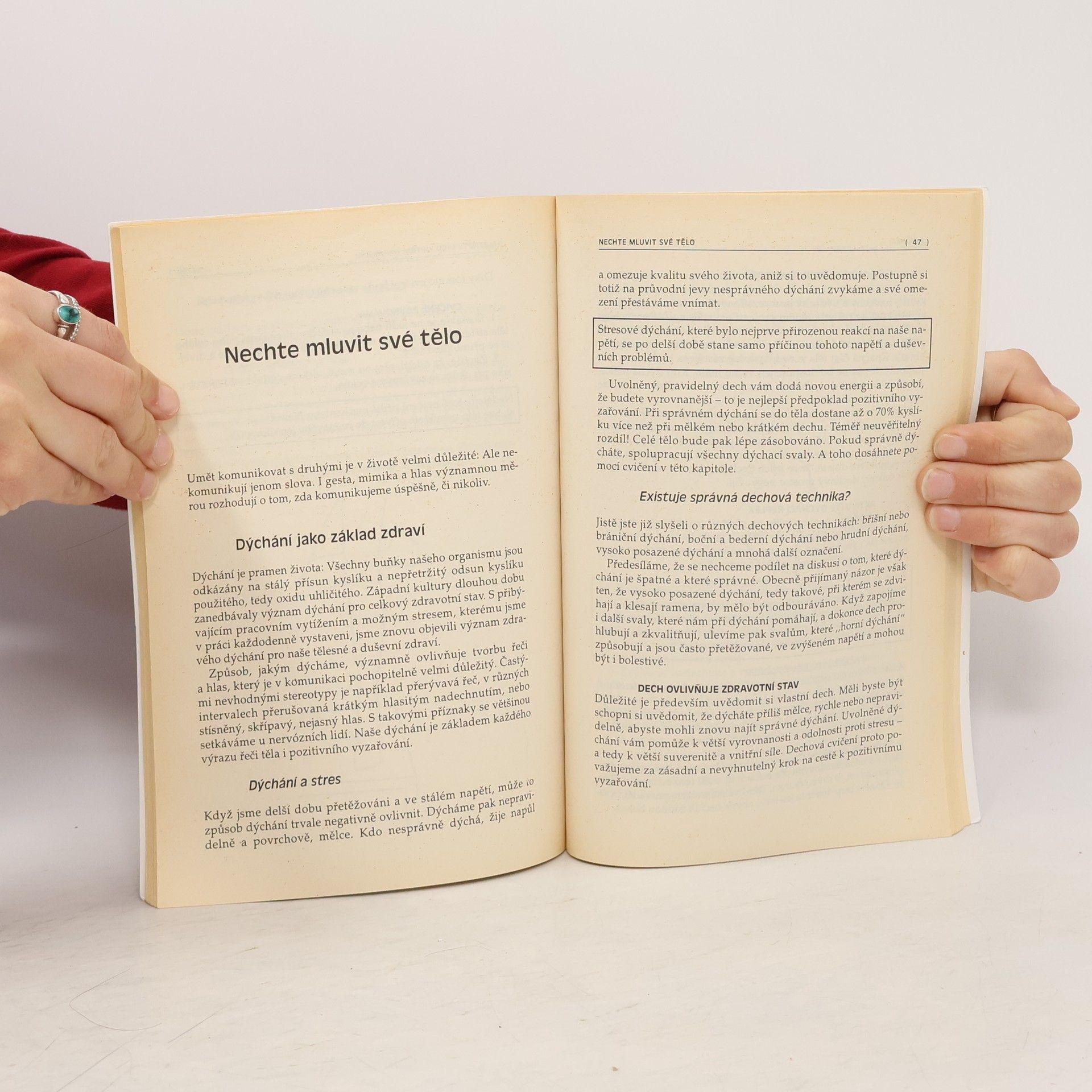 Tato kniha může navést či inspirovat čtenáře k tomu, jak získat suverénnější a uvolněný postoj v různých životních situacích a potažmo s ním ovlivnit a pozitivně posílit osobní charisma. K tomuto nelehkému cíli se zde směřuje přes sebepoznávání a objevování vlastního těla. Praktické rady a jednoduché, ale efektní cviky zaměřené na uvolněné držení těla ve stoji i v sedě, správné dýchání, hlas, mimiku apod. pomáhají lépe poznat a pochopit sebe samého a nalézt vnitřní rovnováhu. To jsou základní předpoklady pozitivního osobního vyzařování i charismatického a suverénního vystupování, které může v řadě situací život usnadnit a zkvalitnit