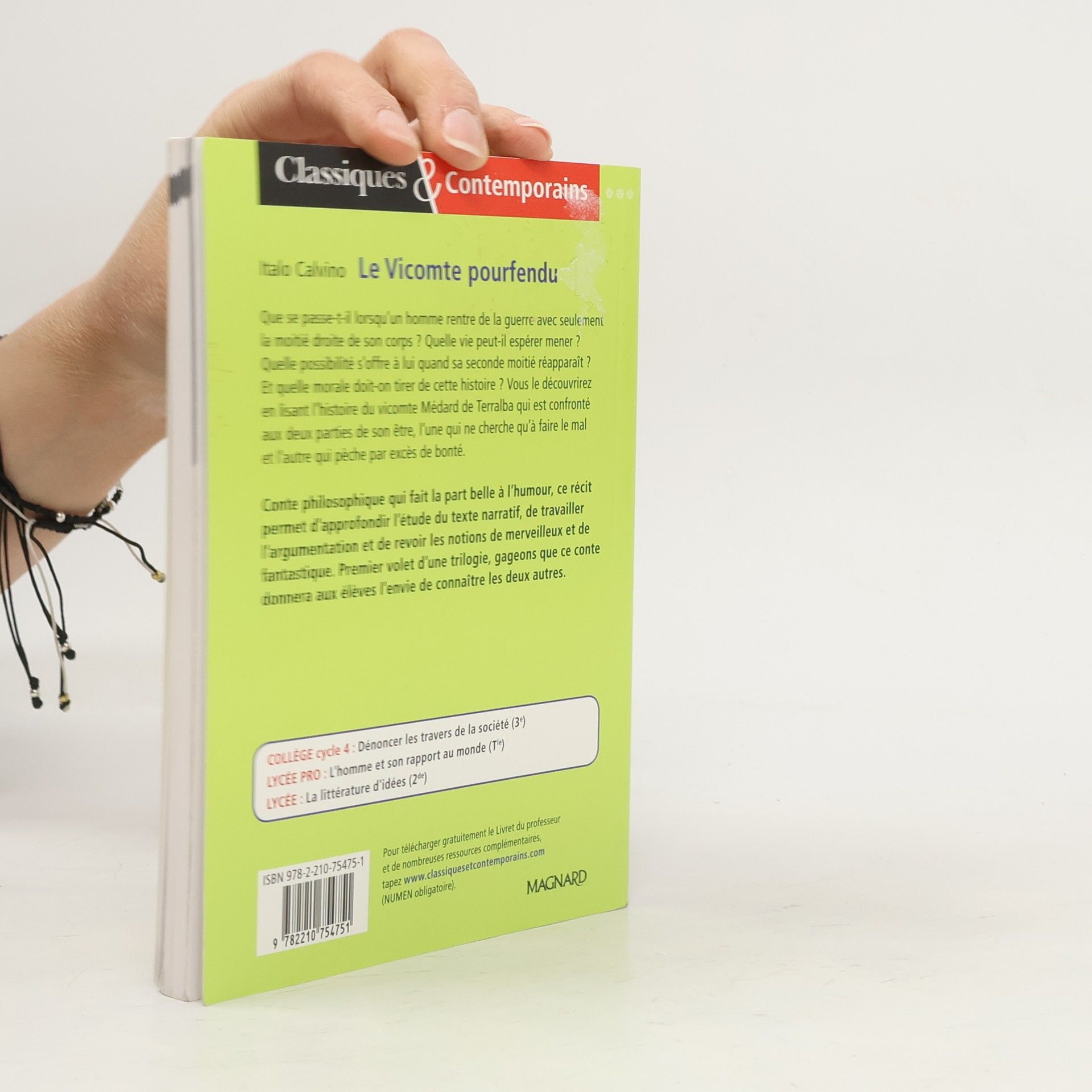 Co się dzieje, gdy mężczyzna wraca z wojny z tylko prawą połową ciała? Jakie życie może wieść? Jaka możliwość jest mu zaoferowana, gdy jego druga połowa pojawi się ponownie? A jaki morał powinniśmy wyciągnąć z tej historii? Odkryjesz to, czytając historię wicehrabiego Médard de Terralba, który konfrontuje się z dwiema częściami swojej istoty, jedną, która dąży tylko do czynienia zła, a drugą, która grzeszy nadmiarem dobroci. Ta filozoficzna opowieść, w której poczesne miejsce zajmuje humor, pozwala pogłębić studium tekstu narracyjnego, pracować nad argumentacją i zrewidować pojęcia cudowności i fantastyki. Pierwsza część trylogii, możemy się założyć, że ta opowieść da uczniom chęć poznania dwóch pozostałych
