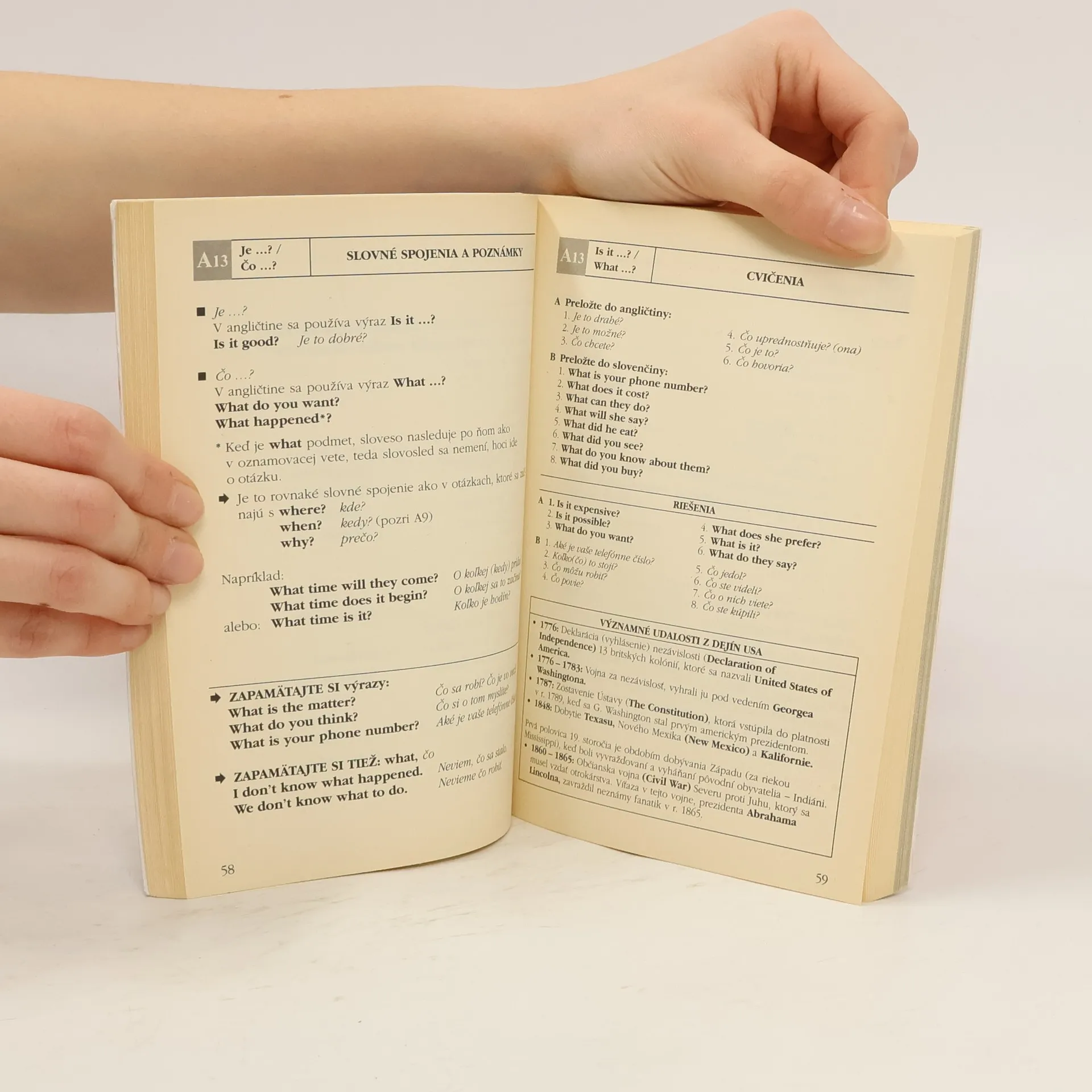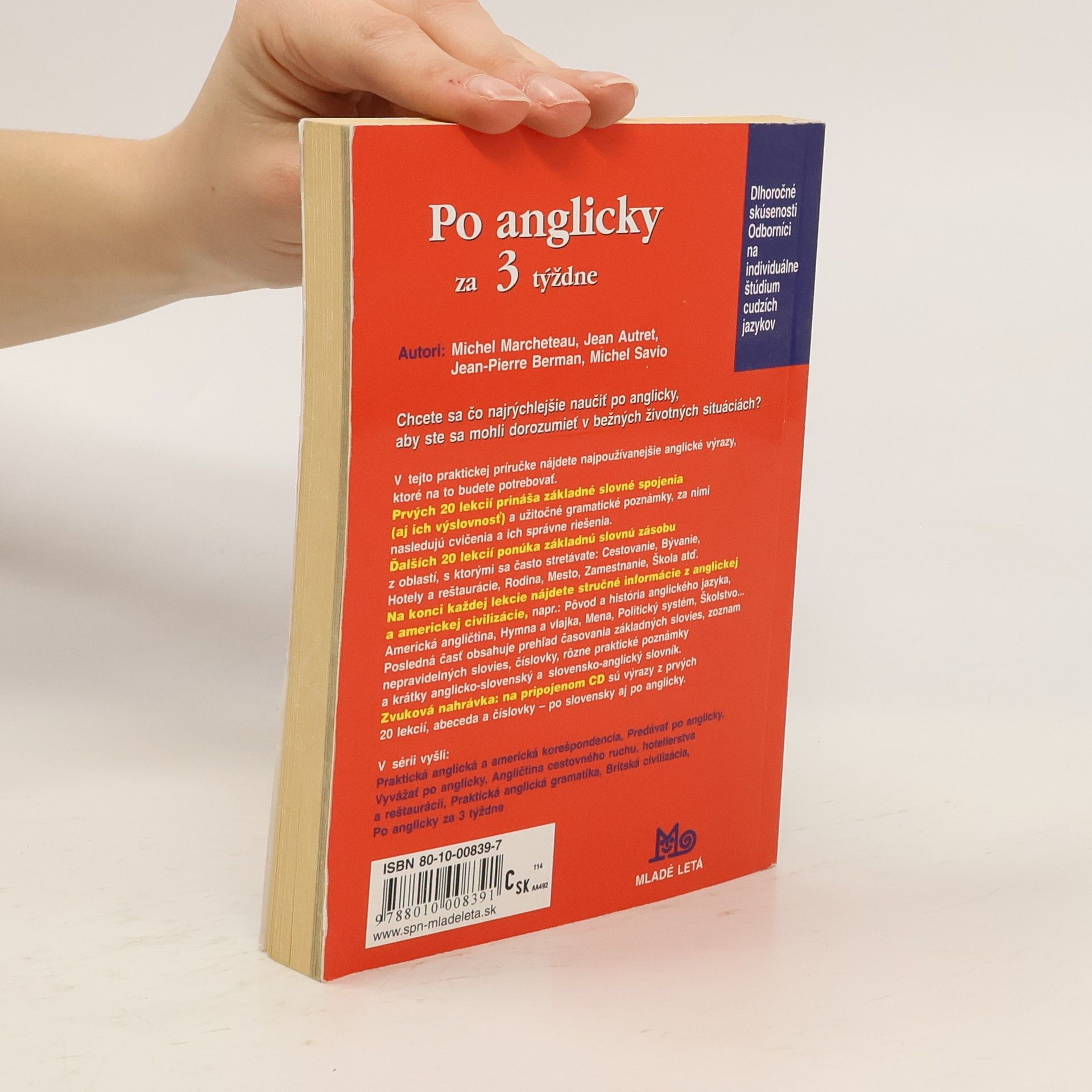 Chcete sa rýchlo naučiť angličtinu na bežné situácie? Táto praktická jazyková príručka obsahuje najpoužívanejšie anglické výrazy, ktoré potrebujete. Kniha nevyžaduje žiadne predchádzajúce jazykové alebo gramatické znalosti. Prvých 20 lekcií (A1 – A20) sa zameriava na základné slovné spojenia a gramatické poznámky, doplnené cvičeniami a správnymi riešeniami. Obsahuje často používané výrazy ako: som, mám, chcel by som, koľko...?, ako...?, prečo...? Každá lekcia je vybavená potrebnými gramatickými vysvetleniami a cvičeniami s okamžitou kontrolou. Všetky výrazy sú aj na zvukovej nahrávke. Ďalších 20 lekcií (B1 – B20) ponúka základnú slovnú zásobu z oblastí ako Cestovanie, Bývanie, Hotely a reštaurácie, Rodina, Mesto, Zamestnanie a Škola. Na konci každej lekcie sú stručné informácie o anglickej a americkej civilizácii, ako napríklad pôvod anglického jazyka a politický systém. Záver knihy obsahuje prehľad časovania základných slovies, zoznam nepravidelných slovies a krátky anglicko-slovenský a slovensko-anglický slovník. Zvuková nahrávka na priloženom CD je použiteľná na CD prehrávači aj v počítači.