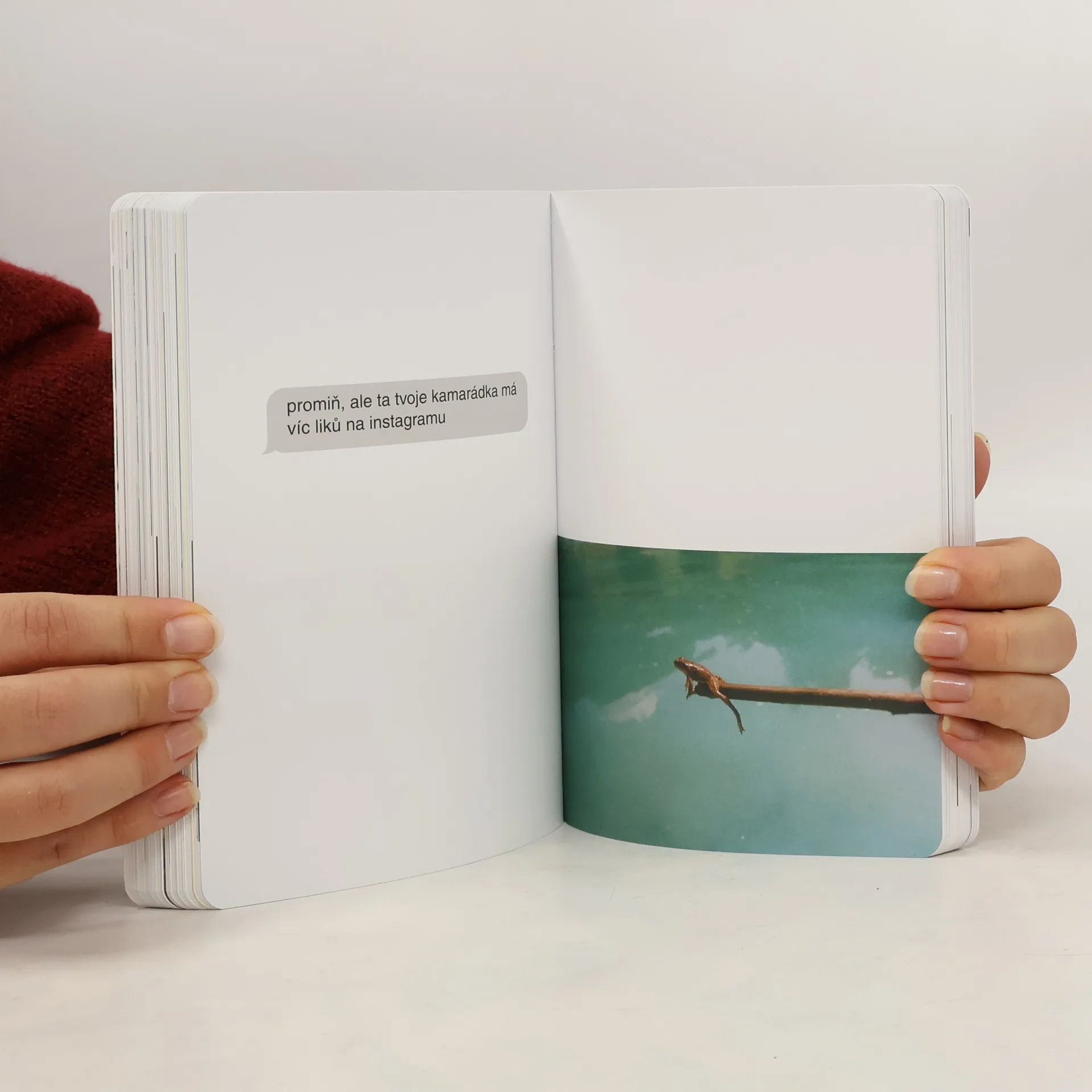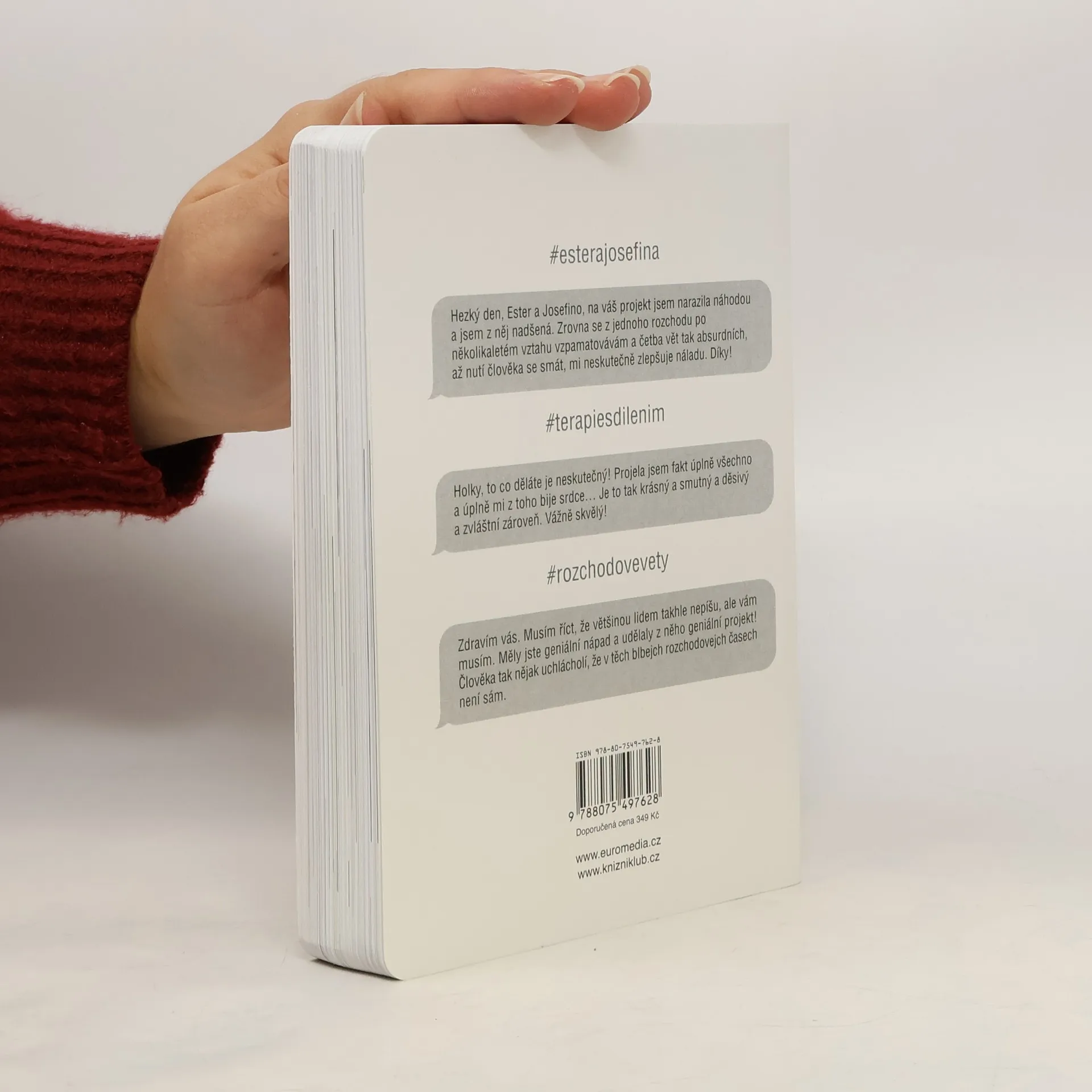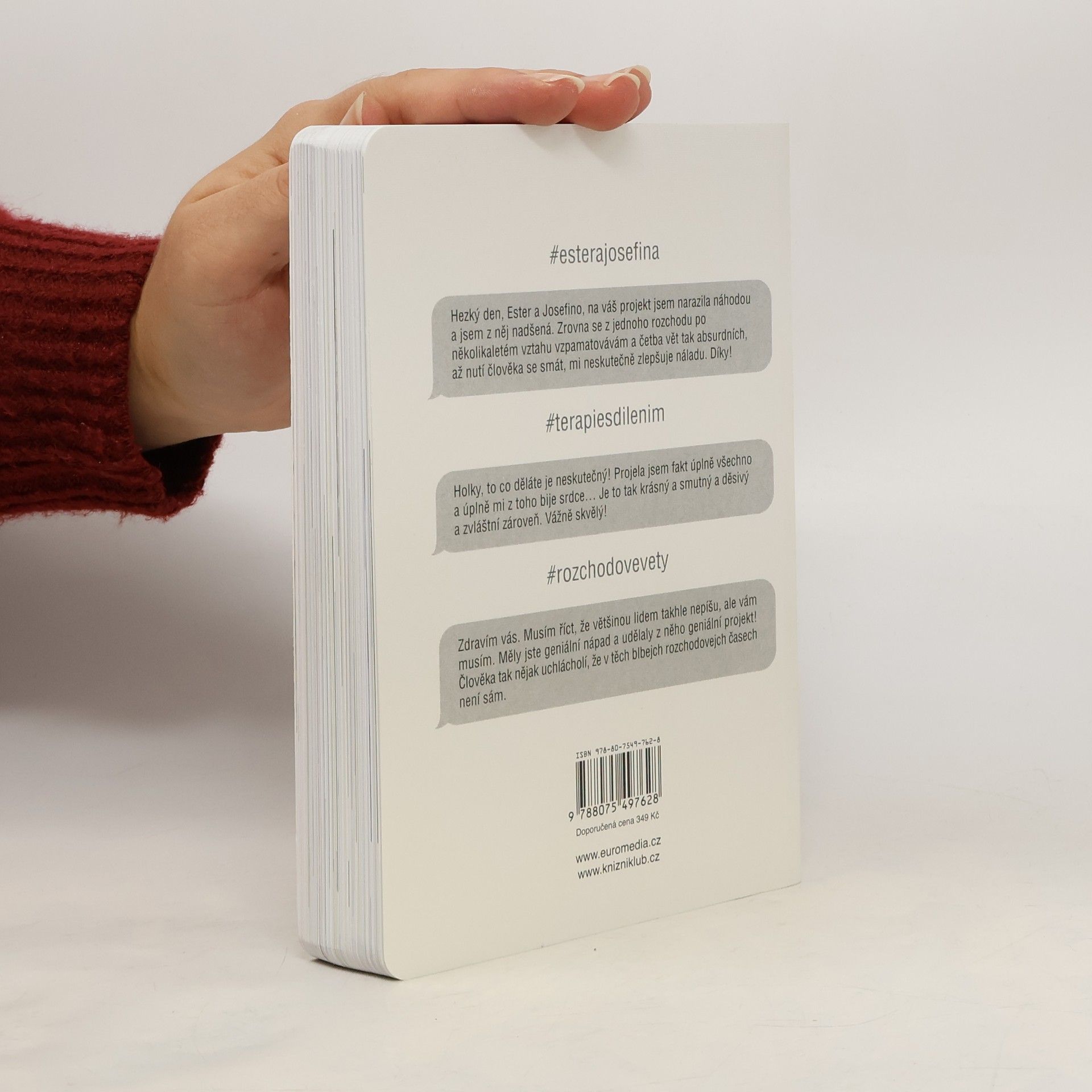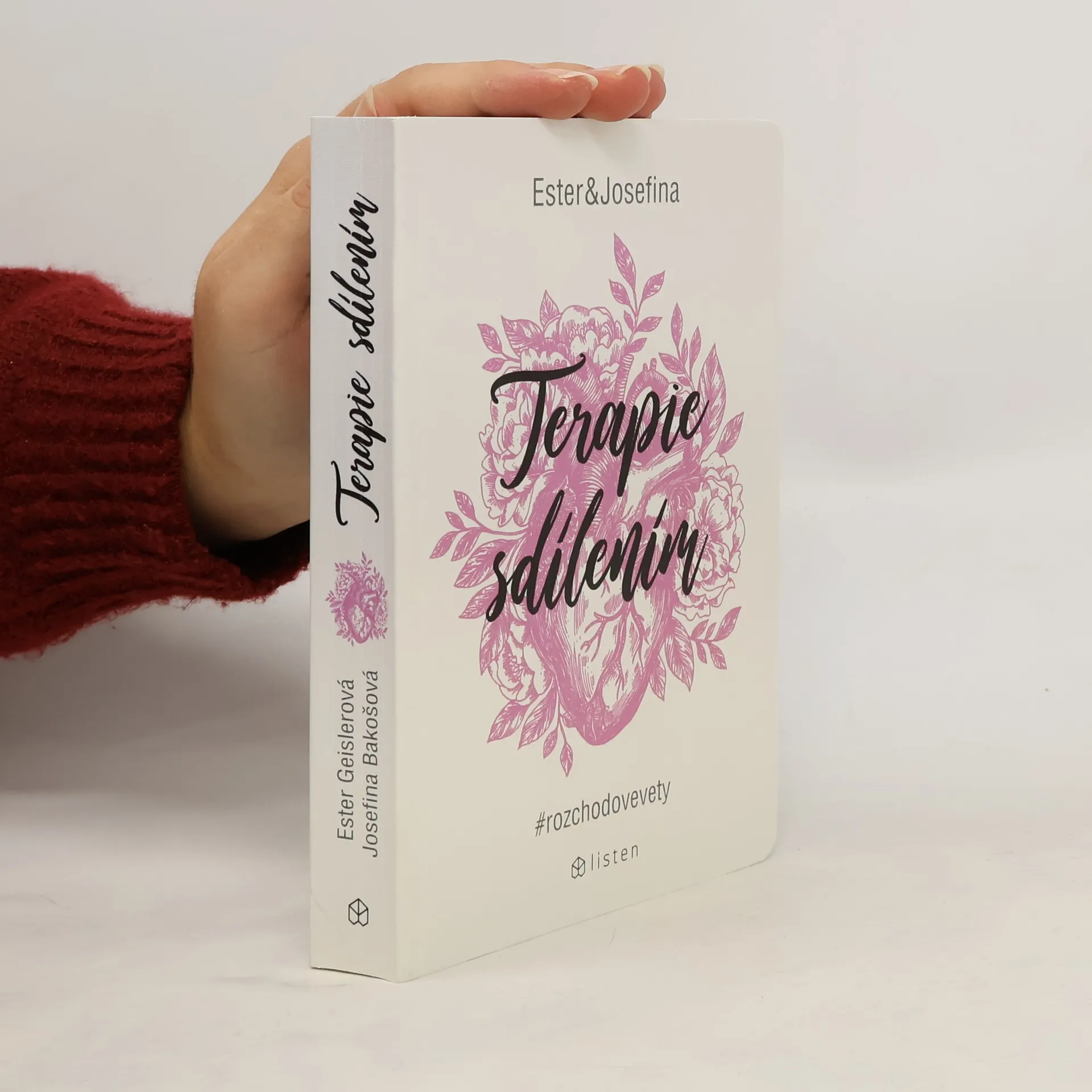 Za projektem Terapie sdílením, aktuální internetovou senzací, stojí kreativní dvojice Ester Geislerová a Josefina Bakošová. Před několika měsíci vystavily na svých sociálních sítích několik mrazivých, a zároveň cynický úsměv vzbuzujících vět, kterými se jistý muž rozešel s jejich kamarádkou. Toto malé gesto spustilo lavinu; během následujících týdnů jim čtenáři začali posílat své rozchodové věty a hashtag „terapie sdilenim“ se stal doslova kultovním. Kniha je věrným obrazem autentického prostředí internetových chatů a messengerů, kde se dnes tak často odehrávají trpké konce vztahů. Sebrané věty fungují opravdu jako svébytná terapie; při četbě a úlevném smíchu si člověk rád připomene, že tak zle na tom přece jen ještě není. Kniha je doplněna texty obou autorek, esejí mediálního teoretika Tomáše Dvořáka, osobními fotkami, vzkazy a dalšími materiály Ester a Josefiny.