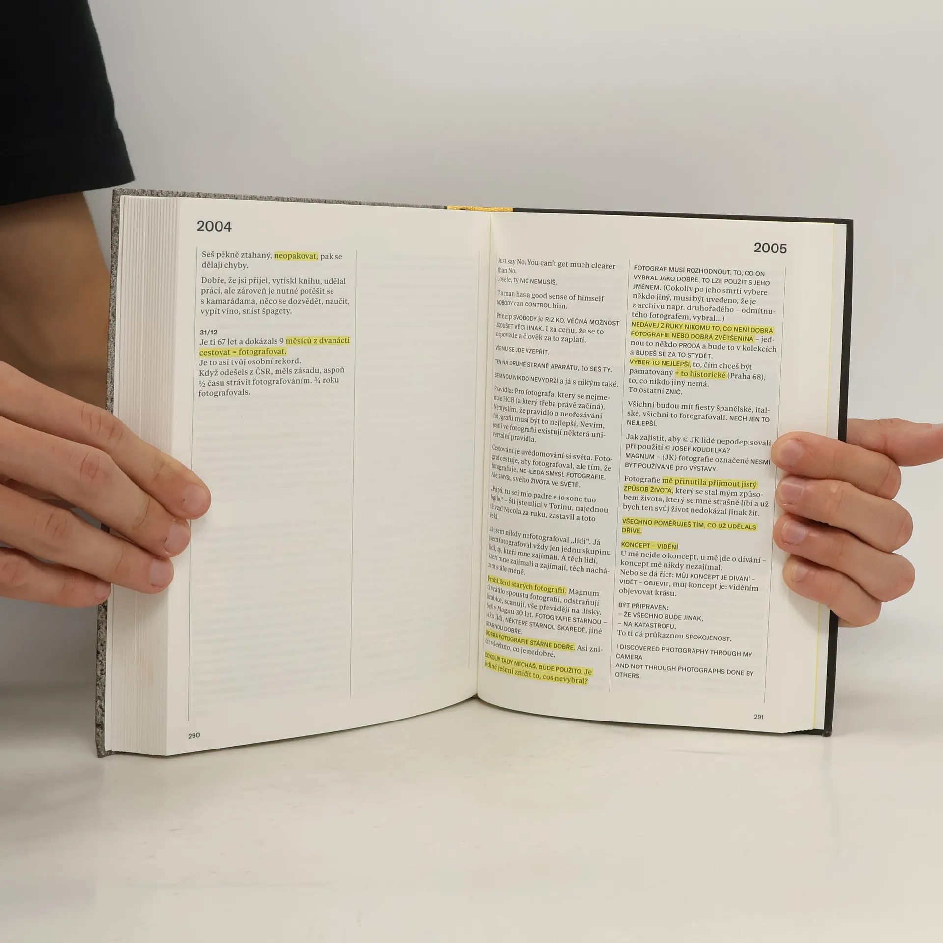 Kniha přináší výběr textů z 68 deníků, které si fotograf Josef Koudelka (* 1938) vedl v průběhu posledních 51 let. Doplněn je přetisky dvojstránek rukopisů deníků a dosud nepublikovanými fotografiemi. Koudelkovy zápisky jsou velkým zdrojem informací o jeho životě a tvorbě i o světové fotografii od konce 60. let do současnosti. Ve zkratkách si zde zaznamenával komentáře k tvorbě osobností, jako byli Henri Cartier-Bresson, Robert Frank, René Burri, William Klein, Jeff Wall, Thomas Struth, Martin Parr, nakladatel a editor Robert Delpire, kurátoři John Szarkowski a Anna Fárová, teoretik John Berger a řada dalších. Deníky je možné číst též jako příběh exulanta, který hledá svou roli v cizím prostředí a nechce obětovat to jediné, co ztrátou domova získal – svobodu. A v neposlední řadě je to též kniha o přátelství, vztazích se ženami, lásce k dětem a o tom, jak pomocí fotografie člověk rámuje svůj život.