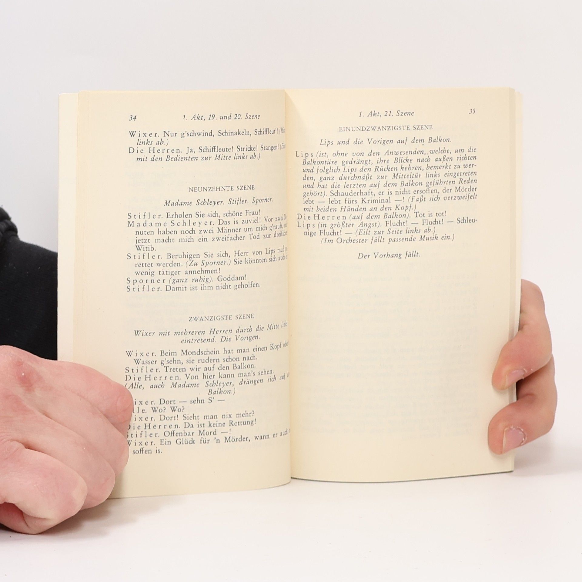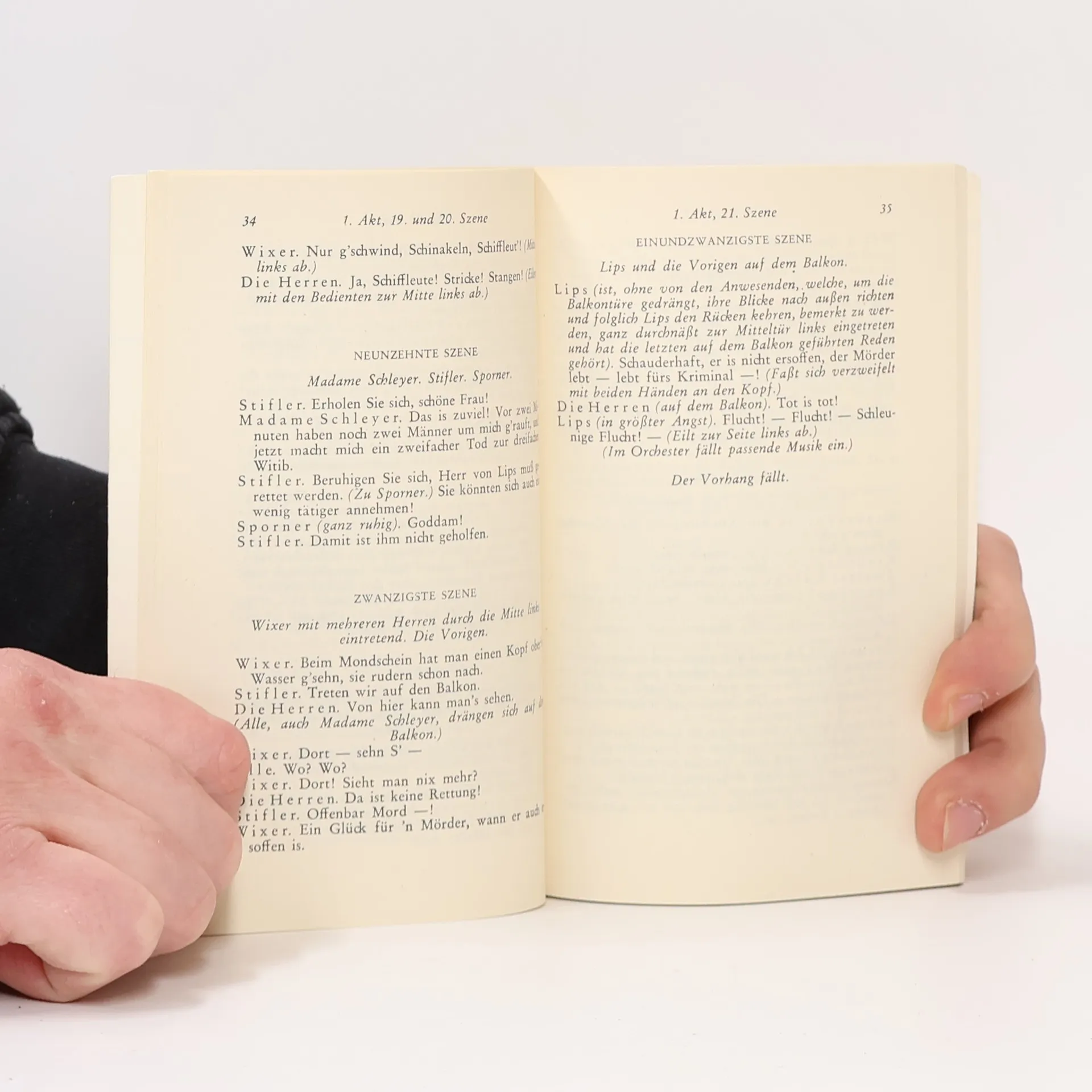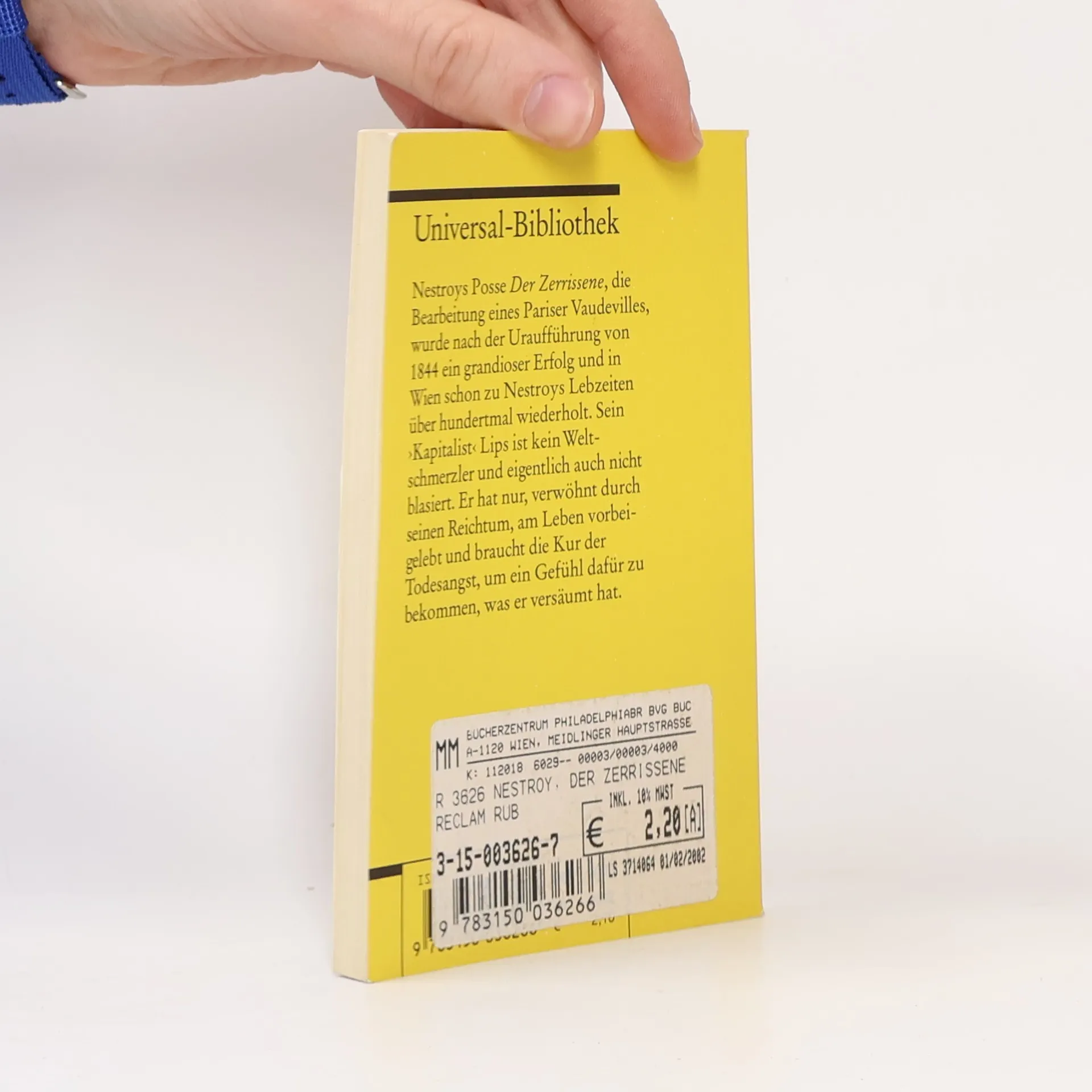Nestroys Posse Der Zerrissene , die Bearbeitung eines Pariser Vaudevilles, wurde nach der Uraufführung von 1844 ein grandioser Erfolg und in Wien schon zu Nestroys Lebzeiten über hundertmal wiederholt. Sein ›Kapitalist‹ Lips ist kein Weltschmerzler und eigentlich auch nicht blasiert. Er hat nur, verwöhnt durch seinen Reichtum, am Leben vorbeigelebt und braucht die Kur der Todesangst, um ein Gefühl dafür zu bekommen, was er versäumt hat.