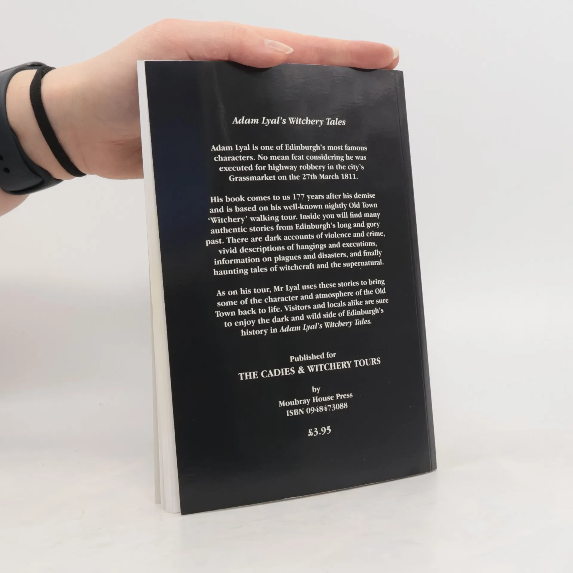 Adam Lyal is fast becoming one of Edinburgh's most famous characters. No mean feat considering he was executed for highway robbery in the city's Grassmarket on the 27th March 1811.His book comes to us 177 years after his demise and is based on his well-known nightly Old Town 'Witchery' walking tour. Inside you will find many authentic stories from Edinburgh's long and gory past. There are dark accounts of violence and crime, vivid descriptions of hangings and executions, information on plagues and disasters, and finally haunting tales of witchcraft and the supernatural.As on his tour, Mr Lyal uses these stories to bring some of the character and atmosphere of the Old Town back to life. Visitors and locals alike are sure to enjoy the dark and wild side of Edinburgh's history in Adam Lyal's Witchery Tales