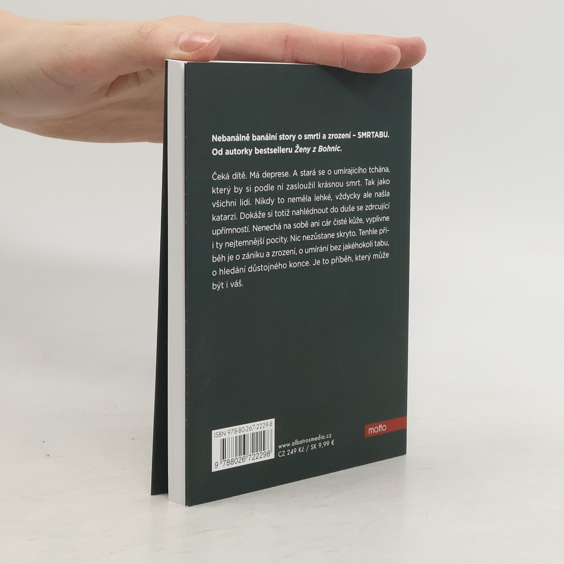 Nebanálně banální story o smrti a zrození – SMRTABU. Od autorky bestselleru Ženy z Bohnic. Čeká dítě. Má deprese. A stará se o umírajícího tchána, který by si podle ní zasloužil krásnou smrt. Tak jako všichni lidi. Nikdy to neměla lehké, vždycky ale našla katarzi. Dokáže si totiž nahlédnout do duše se zdrcující upřímností. Nenechá na sobě ani cár čisté kůže, vyplivne i ty nejtemnější pocity. Nic nezůstane skryto. Tenhle příběh je o zániku a zrození, o umírání bez jakéhokoli tabu, o hledání důstojného konce. Je to příběh, který může být i váš. Mluvíme o ní, ale nic o ní nevíme. Bojíme se jí, a tak ji vytěsňujeme. Přejeme si, aby byla milosrdná. Řeč je o smrti, o tabu jménem smrt. Edna Nová, autorka knihy Ženy z Bohnic, napsala zpověď o umírání, o blížící se smrti svého tchána v momentě, kdy sama očekává narození syna, o životě, který opisuje kruh. Hlavní hrdinka pečuje o starého umírajícího muže, prožívá náročné těhotenství a velmi obnaženě zpracovává téma, které nazývá „smrtabu“ – příběh, který se týká nás všech.