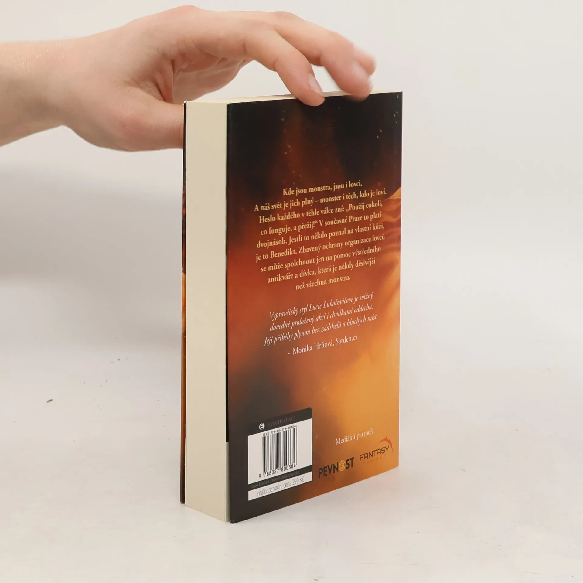 Kde jsou monstra, jsou i lovci. A náš svět je jich plný – monster i těch, kdo je loví. Heslo každého v téhle válce zní: „Použij cokoli, co funguje, a přežij!“ V současné Praze to platí dvojnásob. Jestli to někdo poznal na vlastní kůži, je to Benedikt. Zbavený ochrany organizace lovců se může spolehnout jen na pomoc výstředního antikváře a dívku, která je někdy děsivější než všechna monstra. Vypravěčský styl Lucie Lukačovičové je svižný, dovedně proložený akcí i chvilkami oddechu. Její příběhy plynou bez zádrhelů a hluchých míst. – Monika Hrňová, Sarden.cz