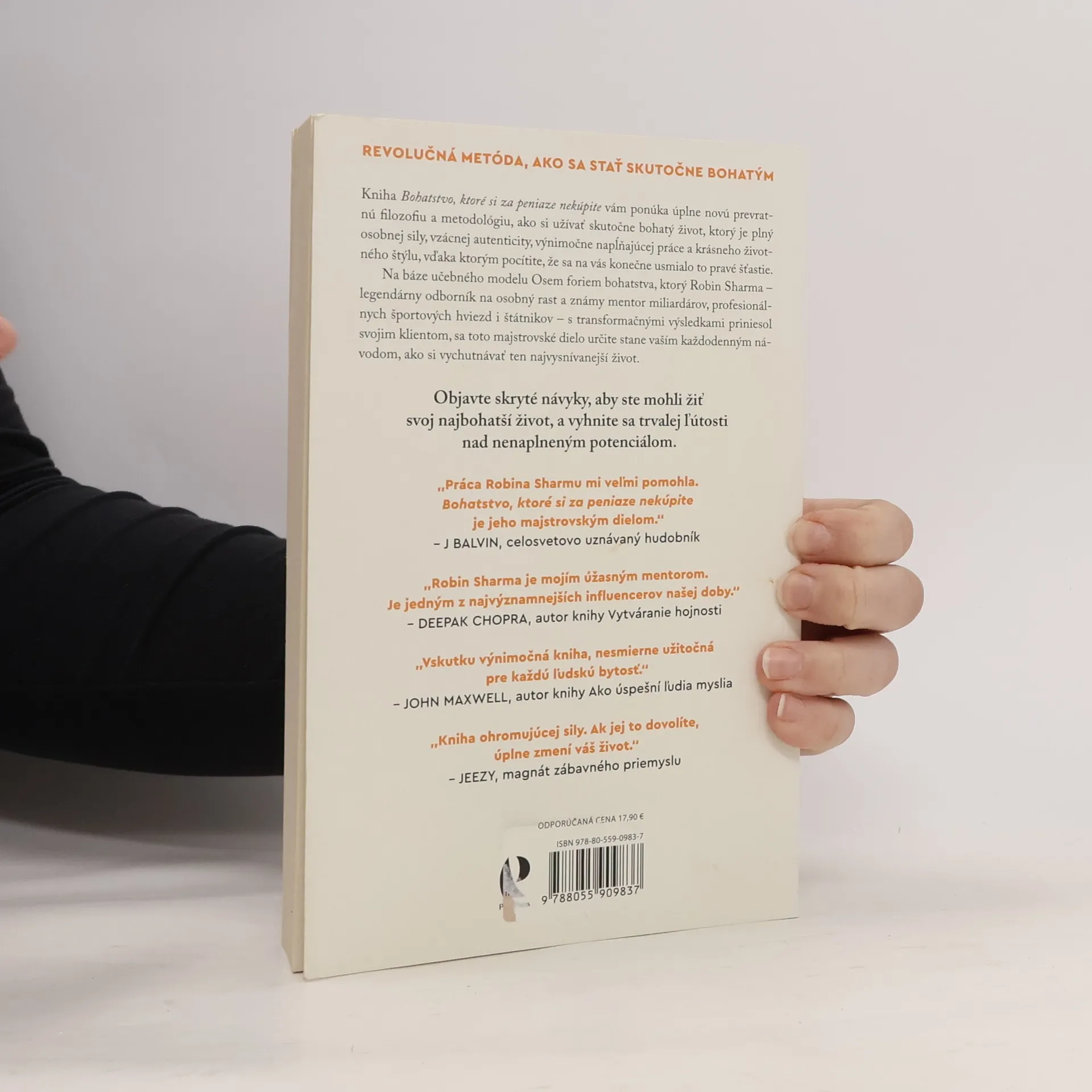 Kniha Bohatstvo, ktoré si za peniaze nekúpite ponúka úplne novú prevratnú filozofiu a metodológiu, ako si užívať skutočne bohatý život, ktorý je plný osobnej sily, vzácnej autenticity, výnimočne napĺňajúcej práce a krásneho životného štýlu, vďaka ktorým pocítite, že sa na vás konečne usmialo to pravé šťastie. Je plná originálnych postrehov, praktických nástrojov a transformačných taktík a zásadne zvýši vašu pozitivitu, produktivitu, prosperitu a každodenný vnútorný pokoj. Na báze učebného modelu Osem foriem bohatstva, ktorý Robin Sharma s transformačnými výsledkami priniesol svojim klientom, sa toto majstrovské dielo určite stane vaším každodenným návodom, ako si vychutnávať ten najvysnívanejší život.