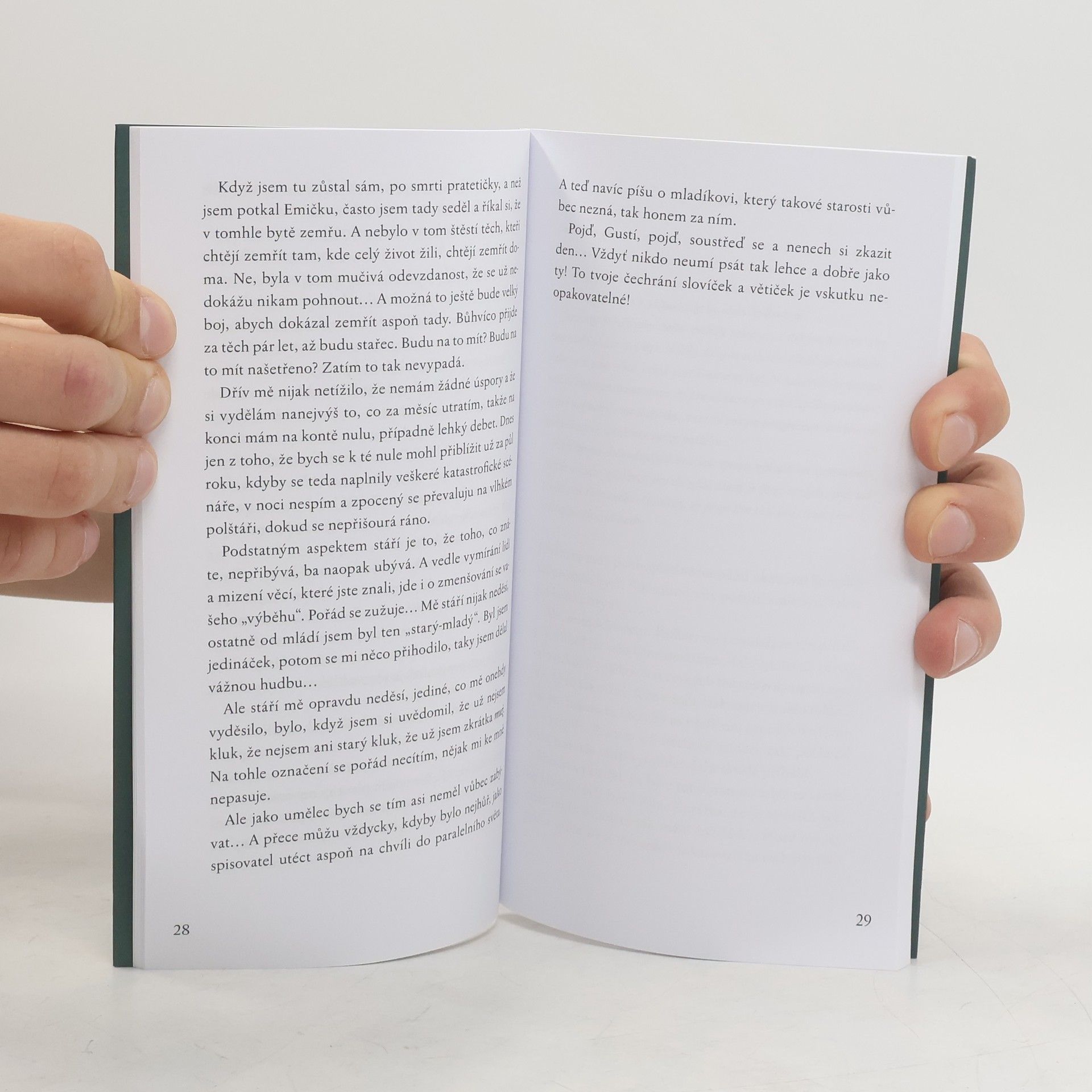 Seznamte se, hlavní hrdina novely Poslední voják lásky se jmenuje Gustík. Gustík je sirotek trpící zvláštní poruchou: „ Vlastně neumím prožívat přítomnost. Vždycky pro mě všechno existuje teprve ve chvíli, kdy to ztratím, kdy na to můžu už jen vzpomínat. “ Gustíka sice nyní potkalo nečekané štěstí, nová láska, ale není si jist tím, zda není přece jen příliš pozdě, jelikož se už patrně ocitl v druhém poločase svého života. Gustík je spisovatel, a tak velmi často potřebuje být sám. Navíc teď musí přijímat i podivné zakázky, protože uživit dva, když je člověk neúspěšný autor, to dá skutečně zabrat.