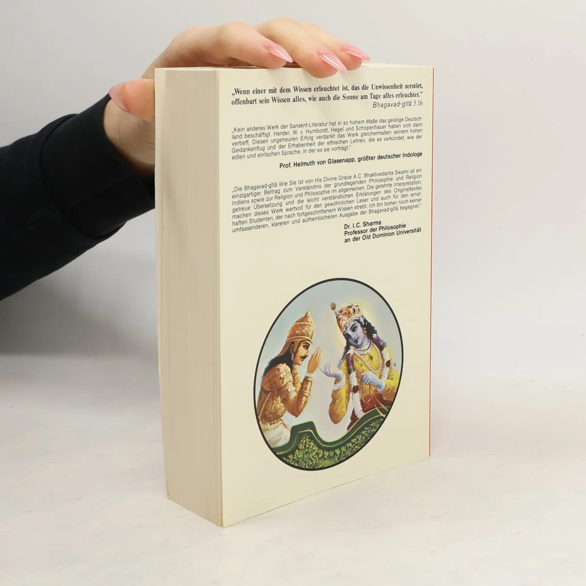 Die Bhagavad-gita (wörtlich: der «Gesang Gottes») ist der bedeutendste und bekannteste Klassiker der indischen Literatur. Sie bildet den Kern der gesamten vedischen Weisheit und enthält eine zeitlose Botschaft von universaler Gültigkeit – eine Botschaft, die alle Religionen und Philosophien der Welt miteinschliesst. Die Bhagavad-gita ist ein Dialog zwischen Krishna, dem Höchsten Herrn, und Seinem vertrauten Freund und Schüler Arjuna. In 700 Versen offenbart Krishna die göttliche Weisheit von Yoga, Karma, Reinkarnation, Meditation, Selbstverwirklichung und Gotteserkenntnis. Krishnas Worte richten sich an alle Menschen, die ihre unwandelbare spirituelle Natur, das letztliche Ziel ihres Daseins und ihre ewige Beziehung zu Gott wiedererkennen möchten. Die vorliegende Bhagavad-gita stellt für den spirituell Suchenden wie auch für den Studenten der Philosophie und Indologie ein Standardwerk dar. Sie beinhaltet: Original-Sanskritverse mit lateinischer Transliteration • vollständige deutsche Übersetzung aller 700 Verse • ausführliche Erläuterungen • umfassendes Glossar mit Erklärungen der wichtigsten Sanskritbegriffe • Anleitung zur Aussprache des Sanskrit • umfangreiches Vers- und Stichwortverzeichnis