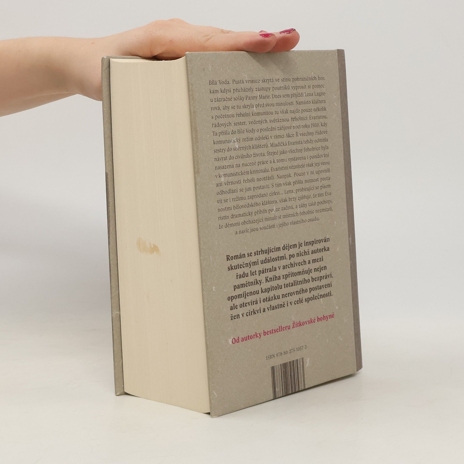 Dlouho očekávaný román Bílá Voda vypráví strhující příběh, jehož hlavní hrdinkou je Lena Lagnerová. Ta přichází do kostela v Bílé Vodě, pusté horské vesnici, kde se nachází zázračná soška Panny Marie. Lena tu nachází jen pár řádových sester, které má na starost řeholnice Evarista. Ta spolu s nimi dorazila do vesnice poslední zářijové noci roku 1950, kdy byly všechny řádové sestry odvedeny komunistickým režimem do sběrných táborů.