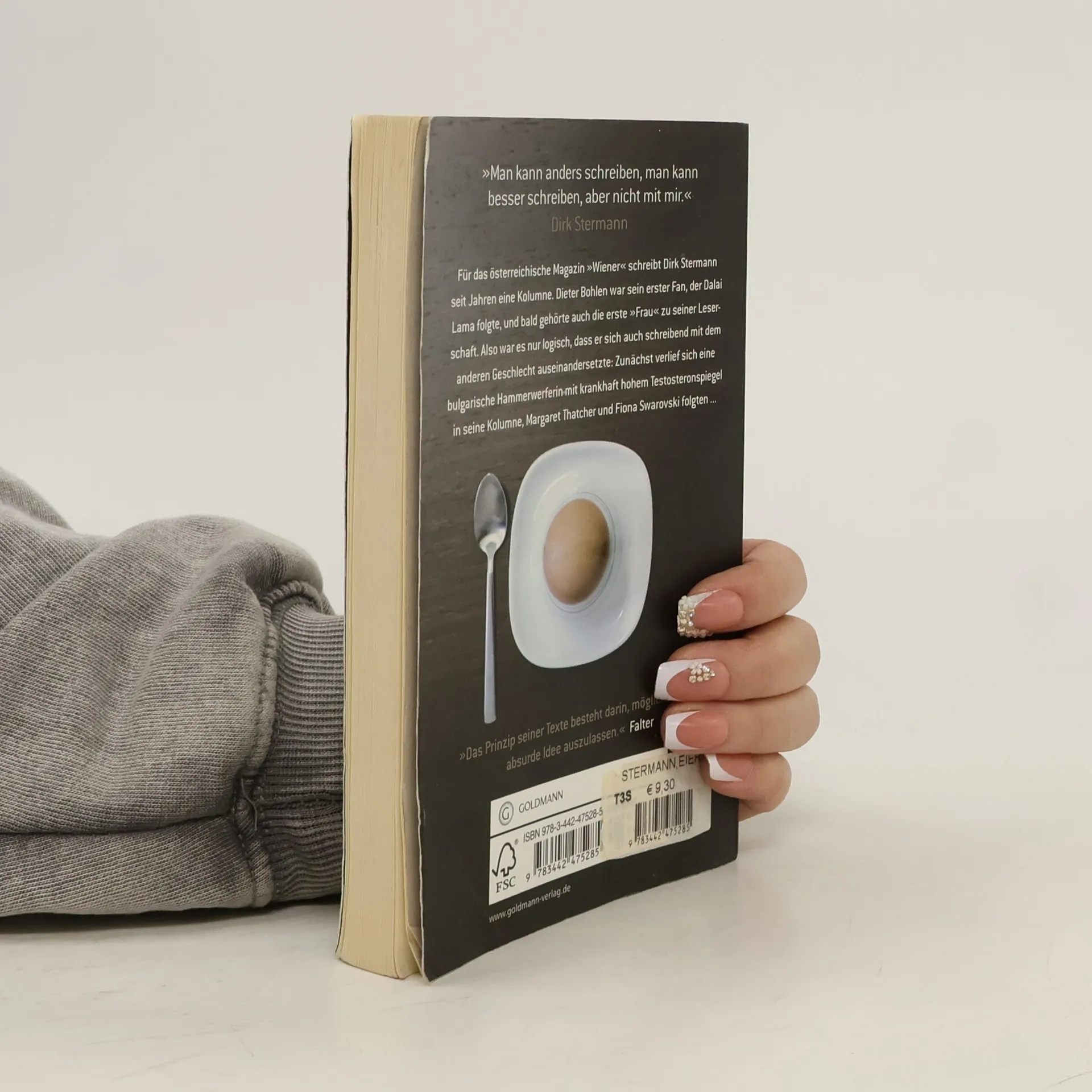 Für das österreichische Männermagazin „Wiener“ schreibt Dirk Stermann seit Jahren die Kolumne auf der letzten Seite jeder Ausgabe. Eine Auswahl dieser witzigen bis skurrilen Texte versammelt der Band „Eier“ – garniert mit 14 echten Eiern und erweitert um ein paar „Bonus-Tracks“. Zum Nachlesen und Neuentdecken: Stermanns Kolumnen, die ihn nach seiner Aussage „wenig Zeit und Aufwand kosten, dem Leser aber interessante und ulkige Minuten garantieren“.