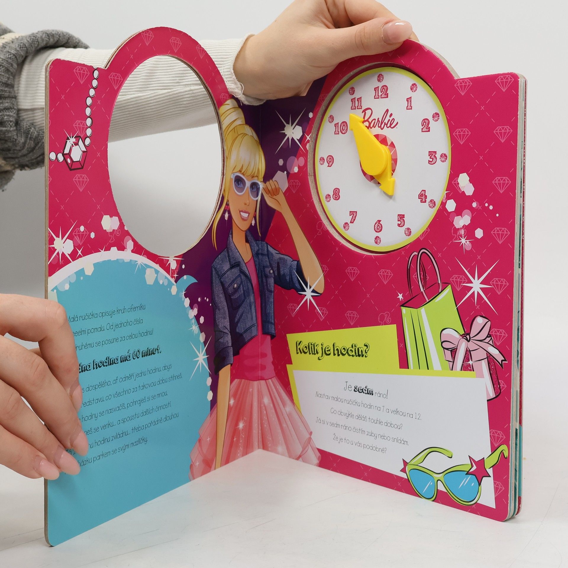 Ahoj! Jsem Barbie a mám pro tebe novou knížku. Naučím tě s ní znát hodiny. Dozvíš se, kolik vteřin má minuta, kolik hodin má den. Prozradím ti, co dělám v 9 hodin ráno i to, kolik času potřebu je moje kočička, aby udělala pěkný nepořádek na stole. Prima zábavu!
