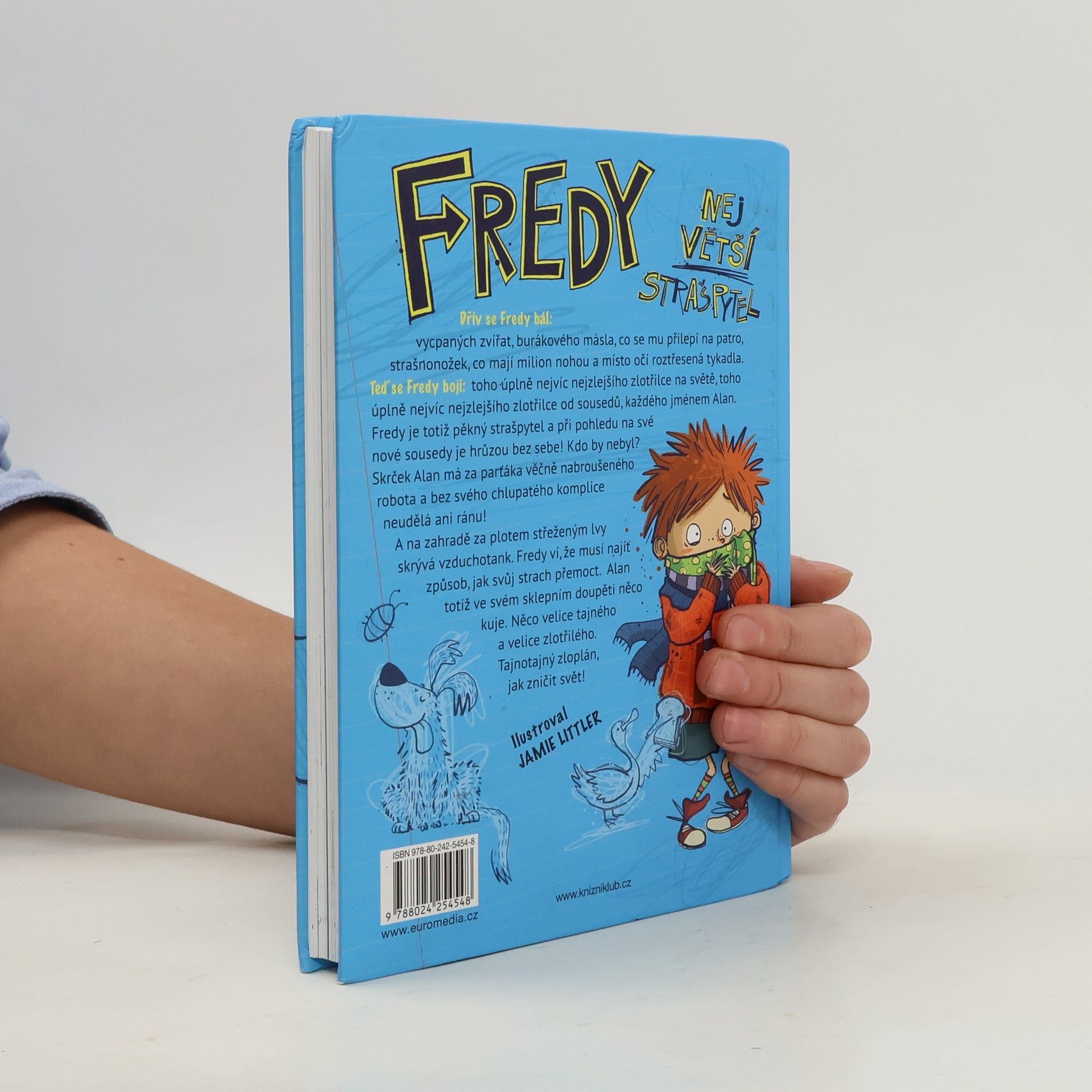 Dřív se Wilf bál: vycpaných zvířat, burákového másla, co se mu přilepí na patro, strašnonožek, co mají milion nohou a místo očí roztřesená tykadla. Teď se Wilf bojí: toho úplně nejvíc nejzlejšího zlotřilce na světě, toho úplně nejvíc nejzlejšího zlotřilce od sousedů, každého jménem Alan. Wilf je totiž pěkný strašpytel a při pohledu na své nové sousedy je hrůzou bez sebe! Kdo by nebyl? Skrček Alan má za parťáka věčně nabroušeného robota a bez svého chlupatého komplice neudělá ani ránu! A na zahradě za plotem střeženým lvy skrývá vzduchotank. Wilf ví, že musí najít způsob, jak svůj strach přemoct. Alan totiž ve svém sklepním doupěti něco kuje. Něco velice tajného a velice zlotřilého. Tajnotajný zloplán, jak zničit svět!