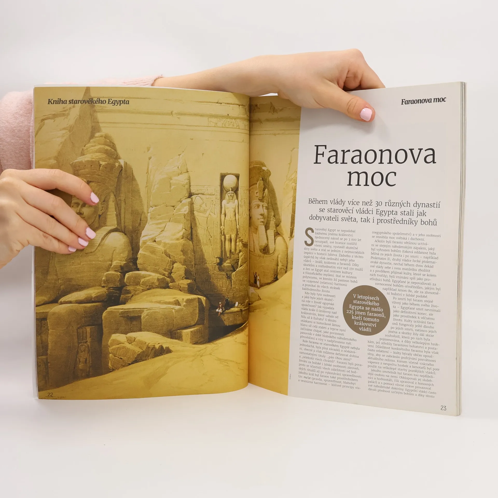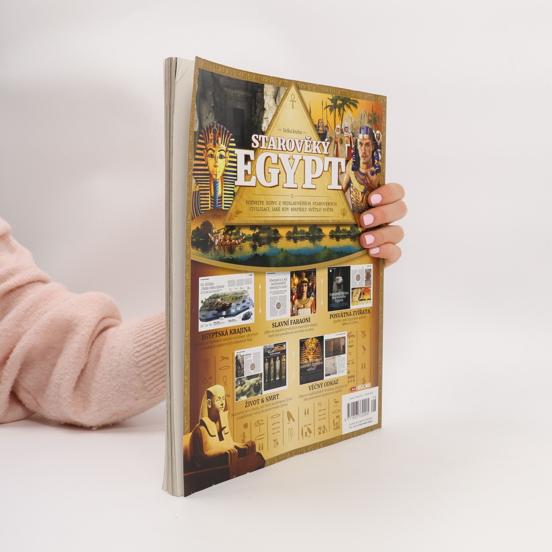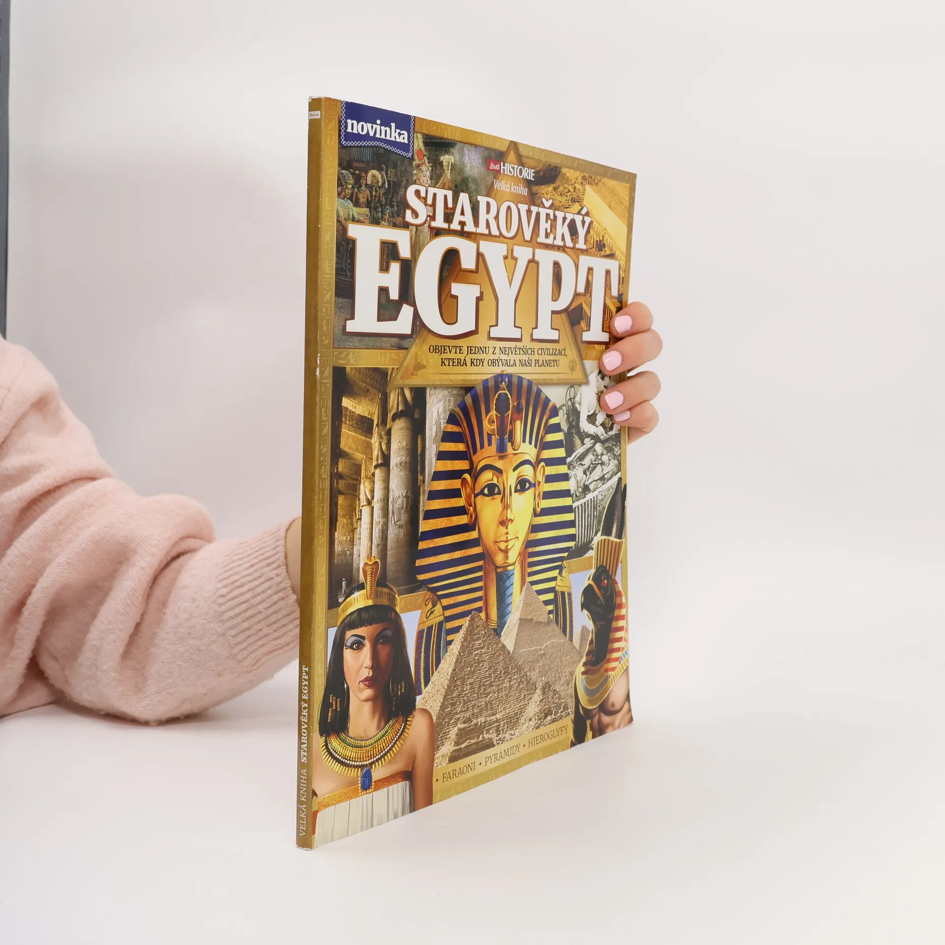 V roce 1922 ohromil svět velkolepý objev. Lidé ze všech koutů planety napjatě sledovali, jak Howard Carter pomalu odhaloval bohatství nově nalezené Tutanchamonovy hrobky. Svět zasáhla egyptománie. Rituály a víra této vysoce rozvinuté společnosti se znovu dostaly do centra dění. Byl to ten nejzásadnější zlom v egyptologii od nalezení Rosettské desky Napoleonovými muži a jejího rozluštění na začátku 19. století. Ve Velké knize starověkého Egypta se přesuneme v čase a projdeme se po břehu Nilu, abychom zjistili, proč se z této společnosti stala jedna z nejmocnějších starověkých civilizací. Představíme ty nejslavnější i nechvalně proslulé faraony, podíváme se na úžas budící pomníky, které byly vztyčeny na jejich počest, a přiblížíme náboženské principy, které v Egyptě řídily každodenní život. Odhalíme hrůzu nahánějící pohřební rituály, jež zajišťovaly bezpečnou cestu do posmrtného života, a rozkódujeme hieroglyfy, které zdobí dochované chrámy i papyry – a to vše díky dechberoucím a zasvěceným textům, ilustracím a fotografiím. Přeneste se s námi do starověkého Egypta!