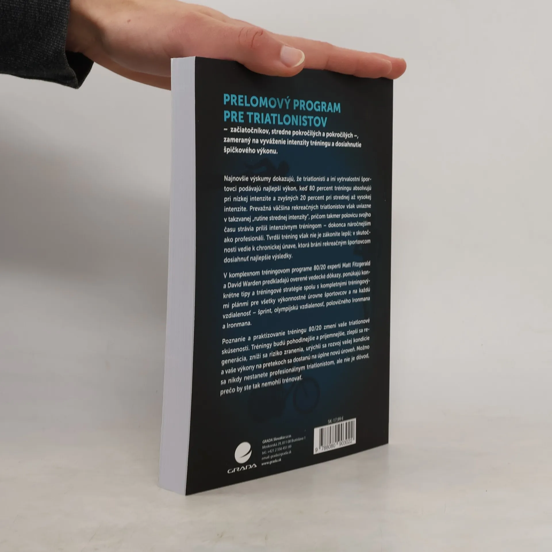 PRELOMOVÝ PROGRAM PRE TRIATLONISTOV – začiatočníkov, stredne pokročilých a pokročilých – zameraný na vyváženie intenzity tréningu a dosiahnutie špičkového výkonu. Najnovšie výskumy dokazujú, že triatlonisti a iní vytrvalostní športovci podávajú najlepší výkon, keď 80 percent tréningu absolvujú pri nízkej intenzite a zvyšných 20 percent pri strednej až vysokej intenzite. Prevažná väčšina rekreačných triatlonistov však uviazne v takzvanej „rutine strednej intenzity“, pričom takmer polovicu svojho času strávia príliš intenzívnym tréningom – dokonca náročnejším ako profesionáli. Tvrdší tréning však nie je zákonite lepší; v skutočnosti vedie k chronickej únave, ktorá bráni rekreačným športovcom dosiahnuť najlepšie výsledky. V komplexnom tréningovom programe 80/20 experti Matt Fitzgerald a David Warden predkladajú overené vedecké dôkazy, ponúkajú konkrétne tipy a tréningové stratégie spolu s kompletnými tréningovými plánmi pre všetky výkonnostné úrovne športovcov a na každú vzdialenosť – šprint, olympijskú vzdialenosť, polovičného Ironmana a Ironmana. Poznanie a praktizovanie tréningu 80/20 zmení vaše triatlonové skúsenosti. Tréningy budú pohodlnejšie a príjemnejšie, zlepší sa regenerácia, zníži sa riziko zranenia, urýchli sa rozvoj vašej kondície a vaše výkony na pretekoch sa dostanú na úplne novú úroveň. Možno sa nikdy nestanete profesionálnym triatlonistom, ale nie je dôvod, prečo by ste tak nemohli trénovať.
