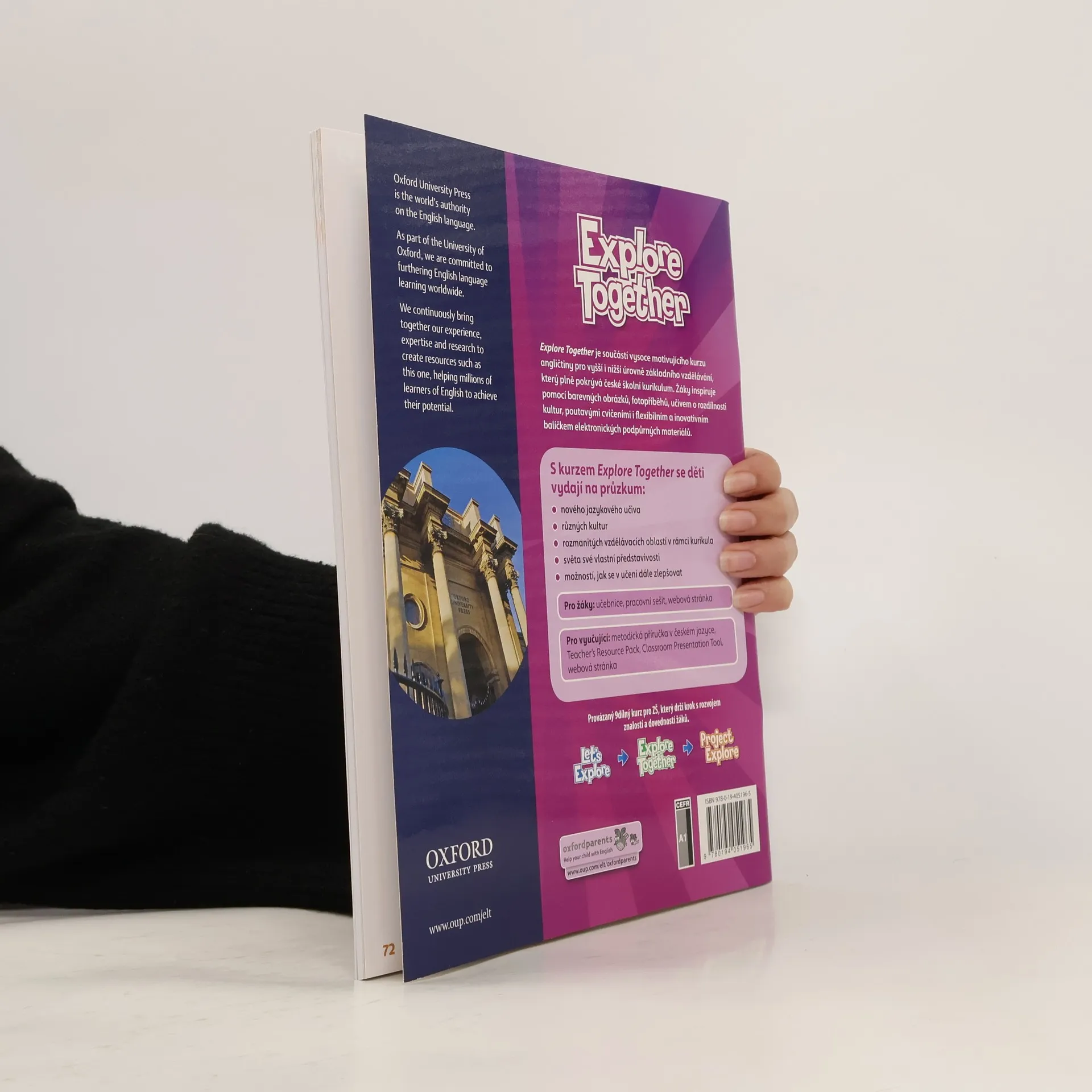 Série Let’s Explore a Explore Together podporují schopnost žáků chápat dnešní globalizovaný svět a pracují na rozvoji jejich hodnot a postojů. • žákům pomáhají lekce Numbers, festivalové lekce a stránky Explore more! • jazyk je vyučován zábavnou formou s pomocí různých postav a příběhů • Classroom Presentation Tool – obsahuje animované verze příběhů, videa ke kultuře a poslechové aktivity • pracovní listy ke kultuře, sebehodnoticí materiály a karty se slovní zásobou ke stažení Explore Together 1 je doplněn o Starter Booklet pro ty, kteří s angličtinou teprve začínají. Explore série je kompletní řada učebnic (1. – 9. ročník), která postupuje v souladu s vývojem žáků, a poskytuje tak odpovídající úroveň obtížnosti a podpory pro každou etapu základního vzdělávání. Vydejte se na cestu od Let’s Explore přes Explore Together až po Project Explore.