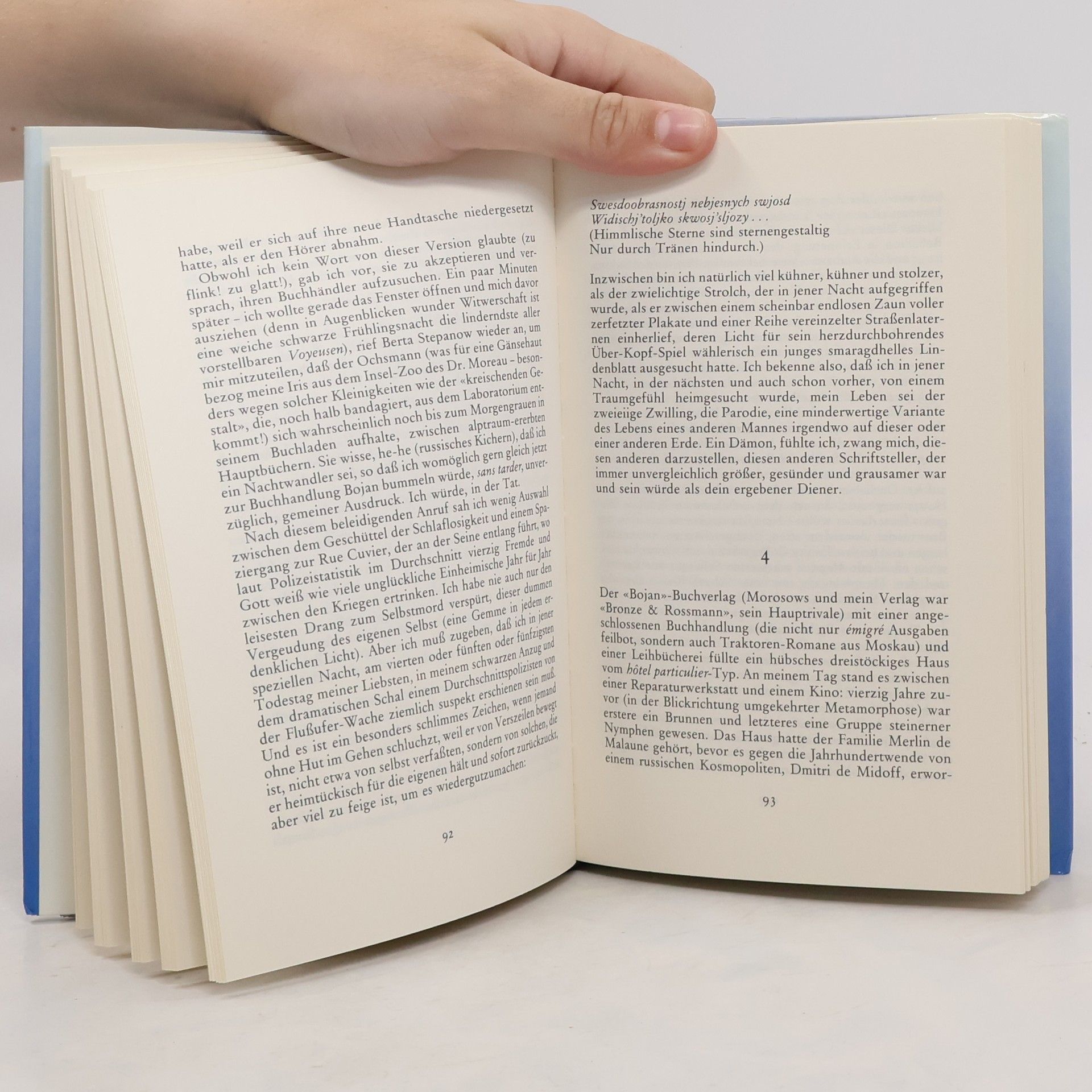 Der im vorrevolutionären Russland geborene Autor Vadim Vadimowitsch N. hat lebenslang an den Folgen seiner nicht ganz geklärten, aber hohen Abkunft und seiner künstlerischen Seele zu tragen. Ein Linksrechts-Tick, der in seiner Vorstellung jede Kehrtwendung vereitelt, bringt ihm die Orientierung so sehr durcheinander, dass er sich für verrückt halten muss. Vielleicht hängt seine «geistige Krankheit, mit der Mahnung seiner Großtante Baronin Bredow, geborene Tolstoi, zusammen, bei der er aufwuchs: «Sieh doch die Harlekins!» — «Was für Harlekins? Wo?» — «Oh, überall. Rings um dich herum. Bäume und Wörter sind Harlekins. Erfinde die Welt! Erfinde Wirklichkeit!» Dies nun befolgt unser Autor bis zum Exzess...