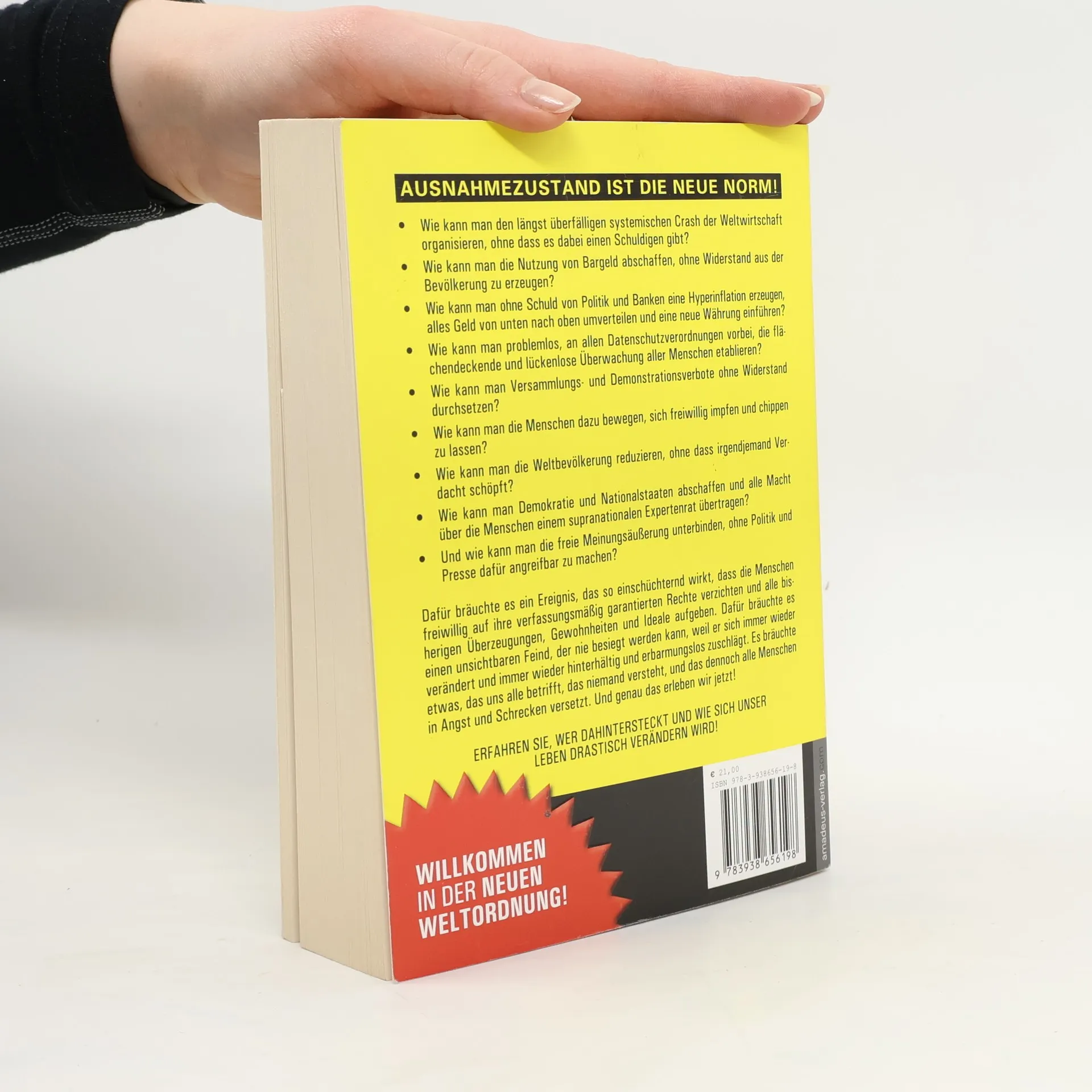 Der Ausnahmezustand ist die neue Norm! Wie kann man den systemischen Crash der Weltwirtschaft organisieren, ohne einen Schuldigen zu benennen? Wie lässt sich Bargeld abschaffen, ohne Widerstand zu erzeugen? Wie kann man Hyperinflation erzeugen, Geld umverteilen und eine neue Währung einführen, ohne dass Politik und Banken dafür verantwortlich gemacht werden? Wie etabliert man flächendeckende Überwachung, ohne Datenschutzverordnungen zu beachten? Wie setzt man Versammlungs- und Demonstrationsverbote durch, ohne auf Widerstand zu stoßen? Wie motiviert man Menschen, sich freiwillig impfen und chippen zu lassen? Wie reduziert man die Weltbevölkerung, ohne Verdacht zu erregen? Wie schafft man Demokratie und Nationalstaaten ab und überträgt die Macht an einen supranationalen Expertenrat? Und wie unterbindet man die freie Meinungsäußerung, ohne dafür angreifbar zu sein? Ein einschüchterndes Ereignis ist nötig, damit die Menschen freiwillig auf ihre Rechte verzichten und ihre Überzeugungen aufgeben. Ein unsichtbarer Feind, der sich ständig verändert und Angst verbreitet, ist erforderlich. Genau das erleben wir jetzt! Erfahren Sie, wer dahintersteckt und wie sich unser Leben drastisch verändern wird!