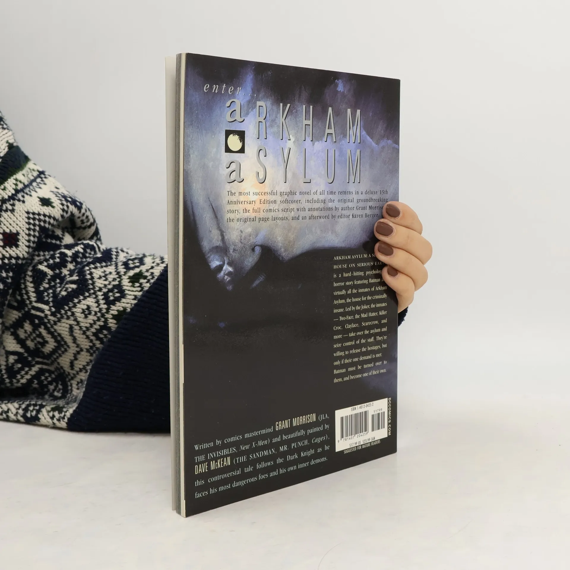 In this groundbreaking, painted graphic novel, the inmates of Arkham Asylum have taken over Gotham's detention center for the criminally insane on April Fools' Day, demanding Batman in exchange for their hostages. Accepting their demented challenge, Batman is forced to live and endure the personal hells of the Joker, Scarecrow, Poison Ivy, Two-Face, and many other sworn enemies in order to save the innocents and retake the prison. During his run through this absurd gauntlet, the Dark Knight's own sanity is placed in jeopardy. This special anniversary edition trade paperback also reproduces the original script with annotations by Morrison and editor Karen Berger.