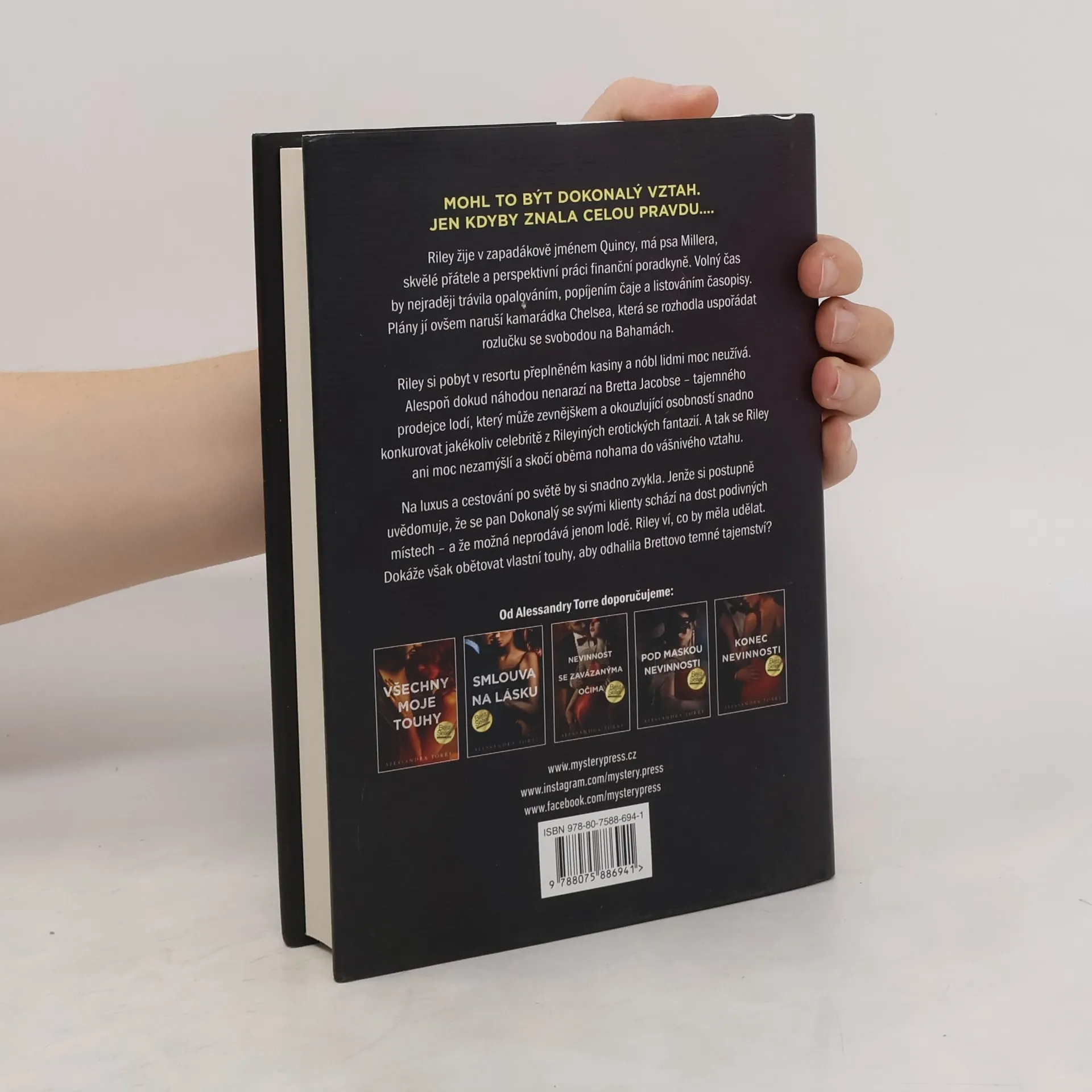 SKANDÁLNÍ EROTICKÁ ROMANCE OD AUTORKY BESTSELLERU SMLOUVA NA LÁSKU... Riley žije v zapadákově jménem Quincy, má psa Millera, skvělé přátele a perspektivní práci finanční poradkyně. Volný čas by nejraději trávila opalováním, popíjením čaje a listováním časopisy. Plány jí ovšem naruší kamarádka Chelsea, která se rozhodla uspořádat rozlučku se svobodou na Bahamách. Riley si pobyt v resortu přeplněném kasiny a nóbl lidmi moc neužívá. Alespoň dokud náhodou nenarazí na Bretta Jacobse – tajemného prodejce lodí, který může zevnějškem a okouzlující osobností snadno konkurovat jakékoliv celebritě z Rileyiných erotických fantazií. A tak se Riley ani moc nezamýšlí a skočí oběma nohama do vášnivého vztahu. Na luxus a cestování po světě by si snadno zvykla. Jenže si postupně uvědomuje, že se pan Dokonalý se svými klienty schází na dost podivných místech – a že možná neprodává jenom lodě. Riley ví, co by měla udělat. Dokáže však obětovat vlastní touhy, aby odhalila Brettovo temné tajemství?