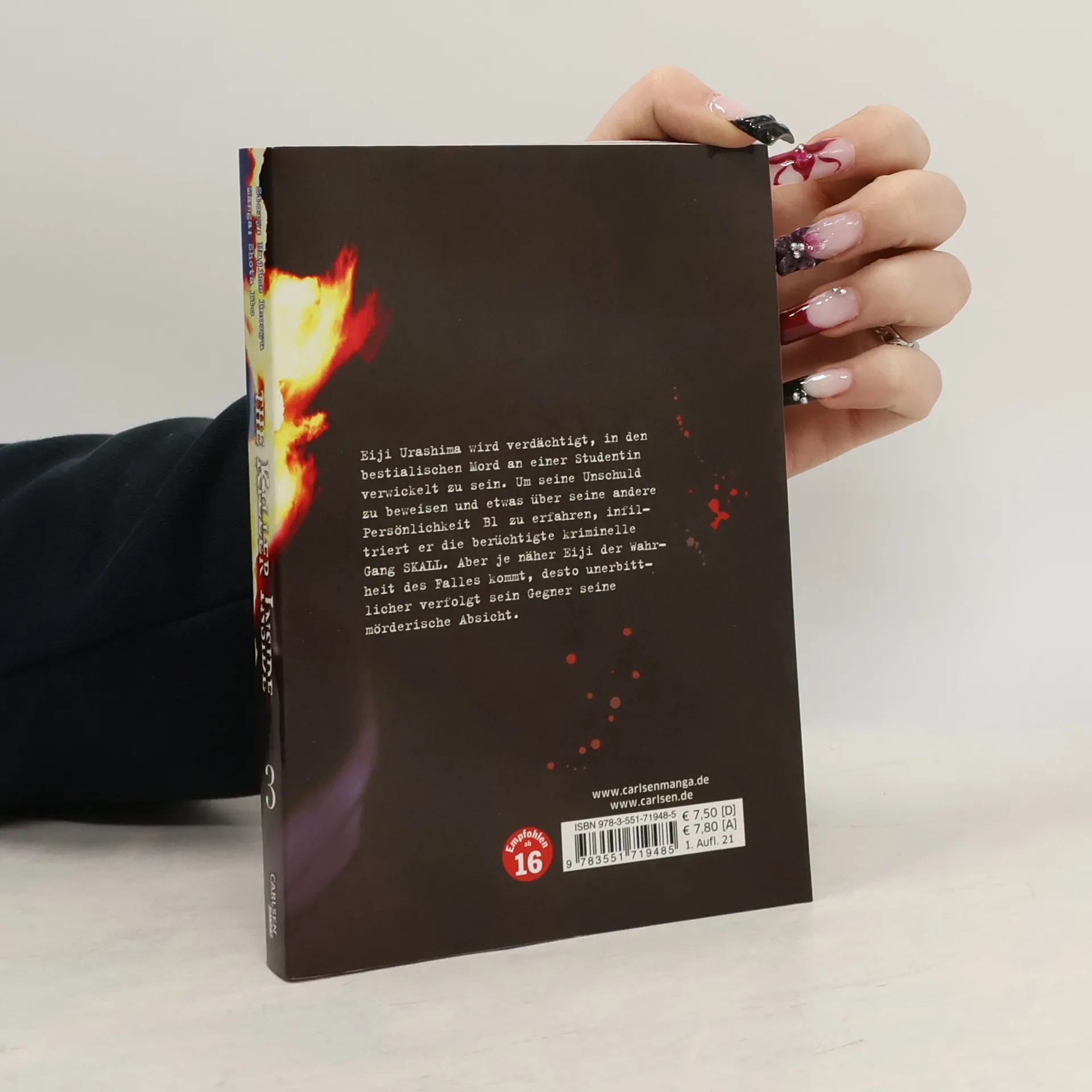 Dieser spannende und mitreißende Psychothriller mit Horrorelementen lässt einen an allem zweifeln – und an jedem! Auf den ersten Blick scheint Eiji ein ganz normaler Student zu sein, doch er hat ein Geheimis: sein verstorbener Vater war ein berüchtigter Serienmörder, der für seine extreme Grausamkeit bekannt war. Eines Tages wacht Eiji neben einem schönen fremden Mädchen auf, das anscheinend in ihn verliebt ist und behauptet, seine Freundin zu sein, doch eigenartigerweise kann er sich nicht an sie erinnern. Die letzten Tage scheinen wie aus seinem Gedächtnis gelöscht, und es fühlt sich an, als hätte jemand anders die Kontrolle übernommen. Zur selben Zeit findet die örtliche Polizei eine aufs Übelste verstümmelte Leiche, und für sie besteht kein Zweifel: Eijis Vater ist zurück... doch kann das wirklich sein? Das erwartet dich in diesem Band: Eiji Urashima wird verdächtigt, in den bestialischen Mord an einer Studentin verwickelt zu sein. Um seine Unschuld zu beweisen und etwas über seine andere Persönlichkeit »B1« zu erfahren, infiltriert er die berüchtigte kriminelle Gang SKALL. Aber je näher Eiji der Wahrheit des Falles kommt, desto unerbittlicher verfolgt sein Gegner seine mörderische Absicht. Für Fans von Monster, Doubt, The Promised Neverland und Death Note.