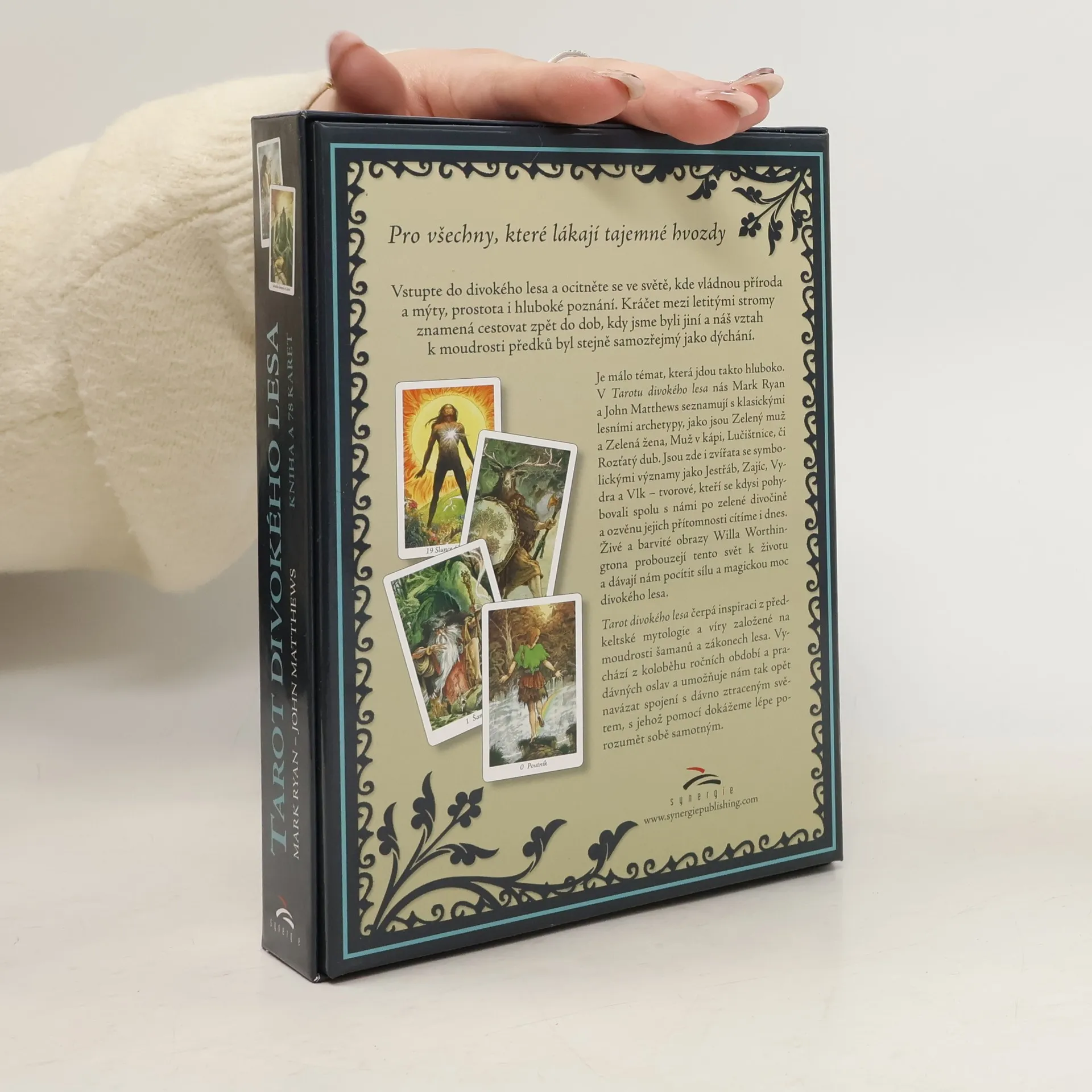 Pro všechny, které lákají tajemné hvozdy Vstupte do divokého lesa a ocitněte se ve světě, kde vládnou příroda a mýty, prostota i hluboké poznání. Kráčet mezi letitými stromy znamená cestovat zpět do dob, kdy jsme byli jiní a náš vztah k moudrosti předků byl stejně samozřejmý jako dýchání. Je málo témat, která jdou takto hluboko. V Tarotu divokého lesa nás Mark Ryan a John Matthews seznamují s klasickými lesními archetypy, jako jsou Zelený muž a Zelená žena, Muž v kápi, Lučištnice, či Rozťatý dub. Jsou zde i zvířata se symbolickými významy jako Jestřáb, Zajíc, Vydra a Vlk – tvorové, kteří se kdysi pohybovali spolu s námi po zelené divočině a ozvěnu jejich přítomnosti cítíme i dnes. Živé a barvité obrazy Willa Worthingtona probouzejí tento svět k životu a dávají nám pocítit sílu a magickou moc divokého lesa. Tarot divokého lesa čerpá inspiraci z předkeltské mytologie a víry založené na moudrosti šamanů a zákonech lesa. Vychází z koloběhu ročních období a pradávných oslav a umožňuje nám tak opět navázat spojení s dávno ztraceným světem, s jehož pomocí dokážeme lépe porozumět sobě samotným.