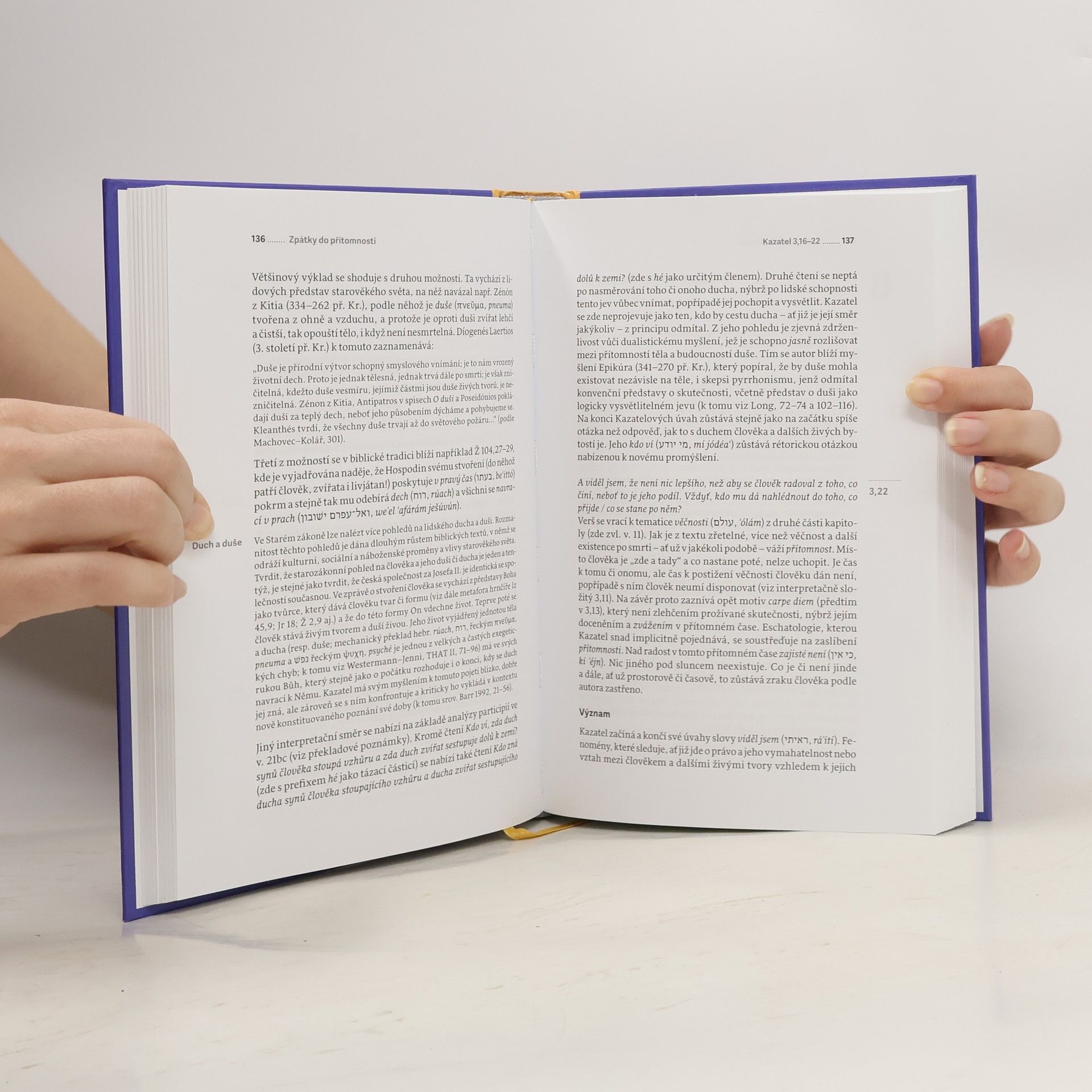 Ve Starém zákoně i v celé Bibli snad není kniha, jež by tak pronikavým způsobem odrážela dobu svého vzniku, navíc dobu, která se v mnohém podobá té dnešní. Jde o teologické a zároveň i hluboce filozofické pojednání. Kazatel se zamýšlí nad otázkami lidské existence, jejího smyslu, poslání, ale i konce. Zejména se pak ptá, jakou roli v tom všem hraje Bůh, co je dobro a jakým způsobem dosáhnout moudrosti. Argumentace je dramatická, víceznačná a v mnohém překvapivě věrně zrcadlí uvažování nad dnešní dobou – hledání jistoty v nejistém čase „globalizovaného“ světa, kde jedna verze skutečnosti soupeří s druhou a žádné není dána přednost. Tento komentář vychází z kritických edic Leningradského kodexu a současně přihlíží k dalším textovým tradicím, a to jak starověkým, tak i novodobým překladům. Cíl komentáře je trojí: Jednak se obrací k textu v jeho nejstarší dostupné podobě a porovnává jej s jinými starověkými textovými tradicemi. Druhý směr se soustřeďuje na výklad, tak jak se o něj pokoušeli a pokoušejí rozmanité vyznavačské tradice. Třetí směr se dotýká aktualizace, tj. interpretace textu v přítomném čase.