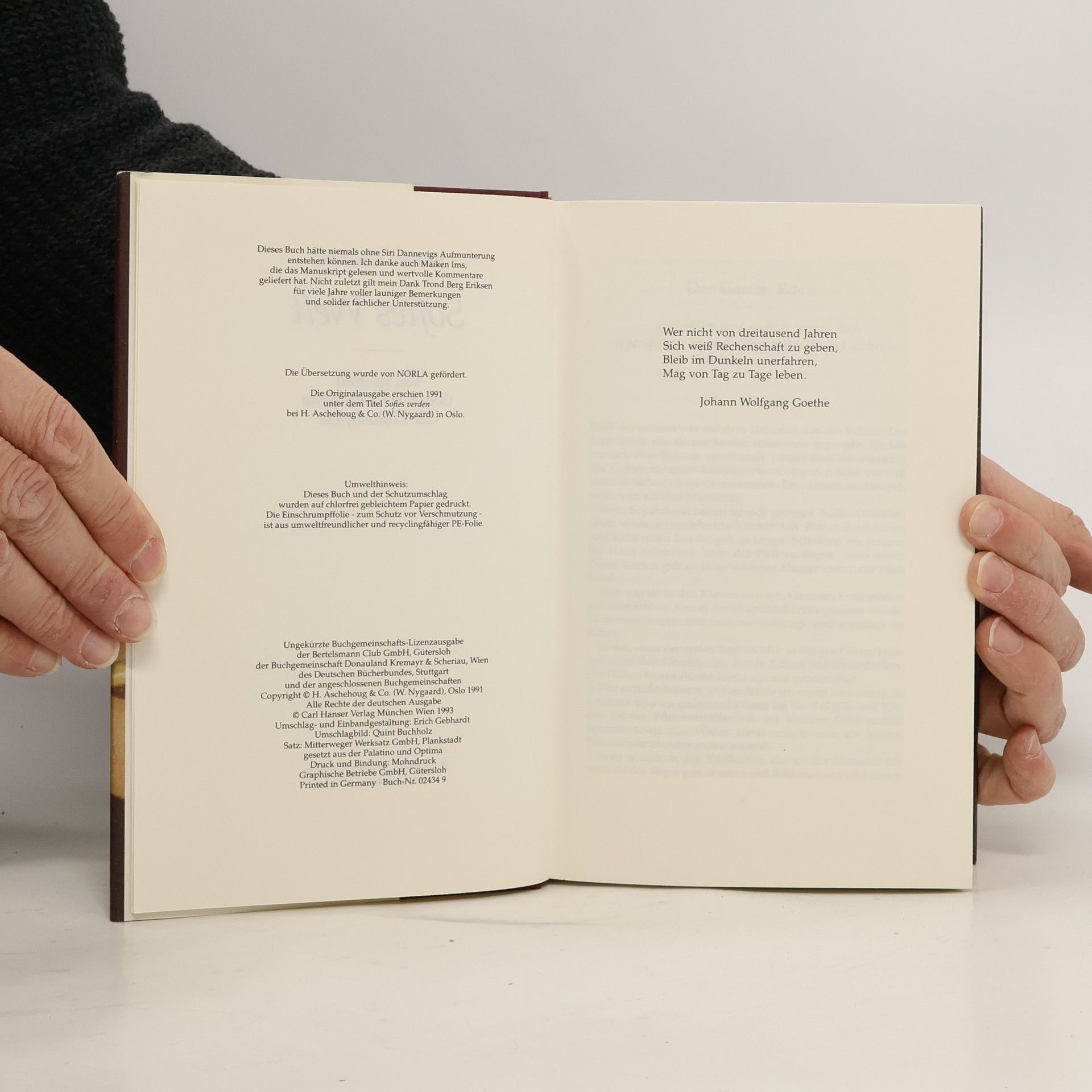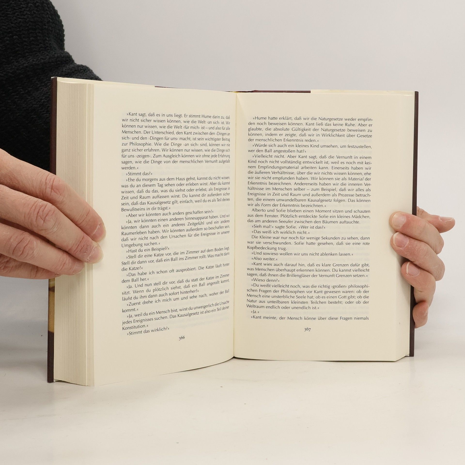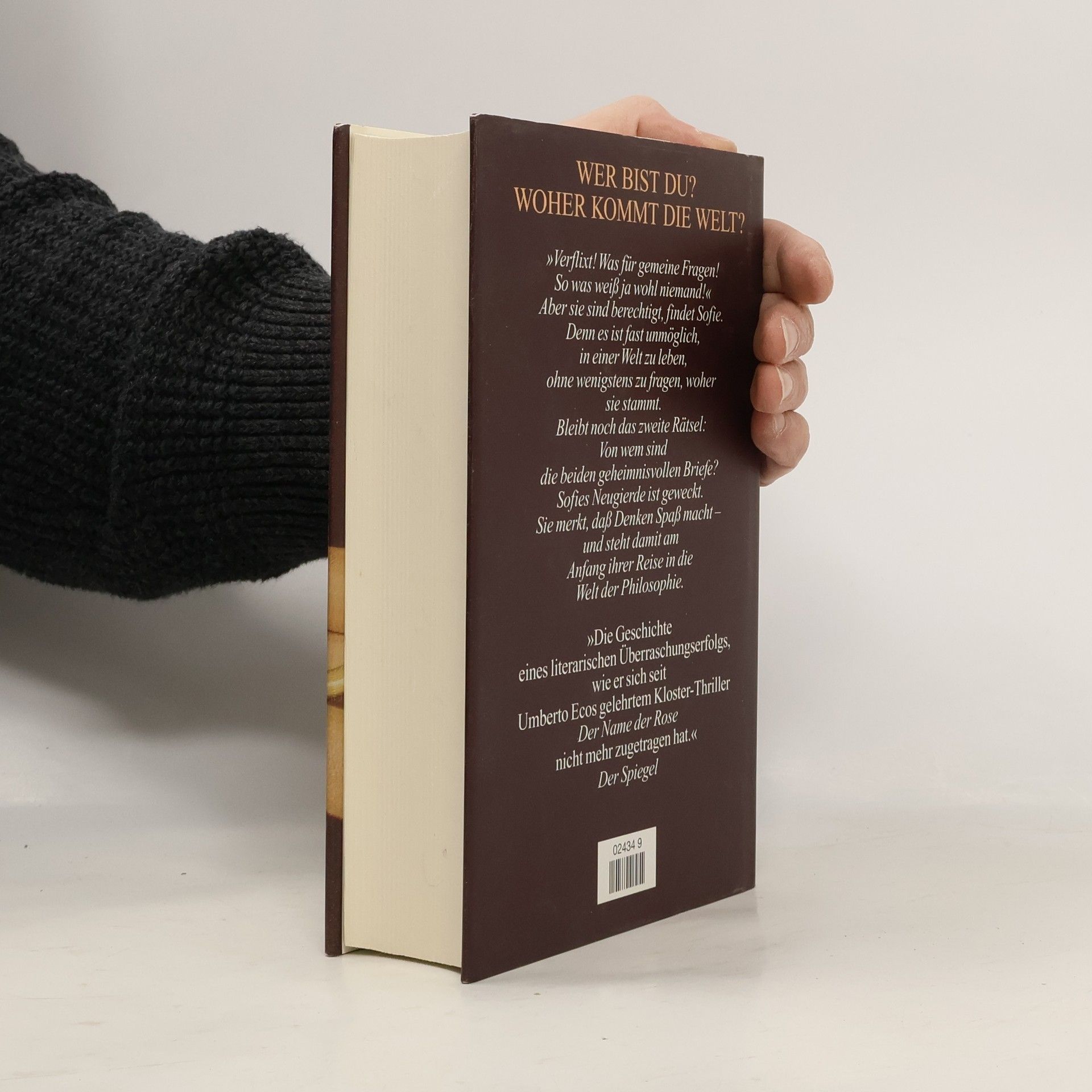 »Ein dickes Buch, mit spitzen Fingern angefaßt und mit Begeisterung zugeklappt: ein großer Wurf im wörtlichen wie übertragenen Sinn.« Die Zeit Mysteriöse Briefe landen im Briefkasten der 15jährigen Sofie Amundsen in Oslo. Was sollen diese Fragen: »Wer bist du?«, »Was ist ein Mensch?« und »Woher kommt die Welt?«. Sofie ist irritiert. Die Briefe werden ausführlicher und entführen sie in die abenteuerliche und geheimnisvolle Gedankenwelt der großen Philosophen. Ihr unbekannter Briefeschreiber erzählt Sofie die Geschichte Europas, der Antike, des Mittelalters und der Renaissance und dann nimmt die Geschichte eine unglaubliche Wendung.