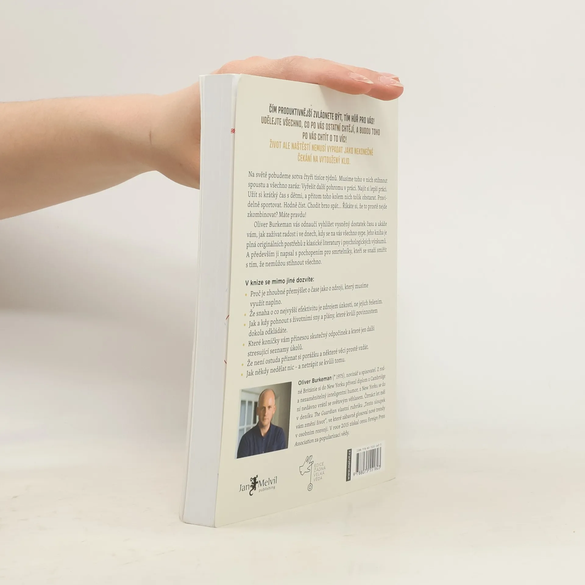 Na světě pobudeme sotva čtyři tisíce týdnů. Musíme toho v nich stihnout spoustu a všechno zaráz: Vyřešit další pohromu v práci. Najít si lepší práci. Užít si krátký čas s dětmi, a přitom toho kolem nich tolik obstarat. Pravidelně sportovat. Hodně číst. Chodit brzo spát... Říkáte si, že to prostě nejde zkombinovat? Máte pravdu! Oliver Burkeman vás odnaučí vyhlížet vysněný dostatek času a ukáže vám, jak zažívat radost i ve dnech, kdy se na vás všechno sype. Jeho kniha je plná originálních postřehů z klasické literatury i psychologických výzkumů. A především ji napsal s pochopením pro smrtelníky, kteří se snaží smířit s tím, že nemůžou stihnout všechno. V knize se mimo jiné dozvíte: - Proč je zhoubné přemýšlet o čase jako o zdroji, který musíme využít naplno. - Že snaha o co nejvyšší efektivitu je zdrojem úzkostí, ne jejich řešením. - Jak a kdy pohnout s životními sny a plány, které kvůli povinnostem dokola odkládáte. - Které koníčky vám přinesou skutečný odpočinek a které jen další stresující seznamy úkolů. - Že není ostuda přiznat si porážku a některé věci prostě vzdát. - Jak někdy nedělat nic – a netrápit se kvůli tomu.