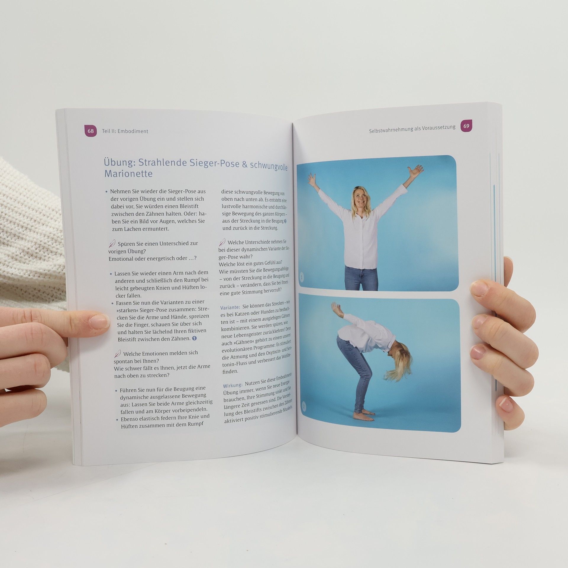 Wie Ihr Körper Ihre Stimmung hebt Stress und psychische Belastungen wirken direkt auf unseren Körper. Das Herz schlägt wild, der Magen krampft und die Muskeln verspannen sich. Genauso funktioniert der umgekehrte Weg: Unsere Körperhaltung, Gestik und Mimik beeinflussen unsere Stimmung. Dieses Zusammenspiel verbirgt sich hinter dem Begriff "Embodiment". Körper und Psyche beeinflussen sich gegenseitig. Und das können wir bewusst für uns nutzen. Indem wir bestimmte Haltungen einnehmen oder eine Bewegung ausführen, können wir unser Denken und Fühlen positiv verändern. Dieser Ansatz wird heute gezielt in der Psychotherapie eingesetzt, um z.B. Depressionen zu behandeln. Mit den vielfältigen Embodiment-Übungen werden Sie selbst aktiv, stärken Ihre Selbstwirksamkeit und heben Ihre Stimmung. Egal ob aktiv stehend, rollend sitzend oder beschwingt gehend. Sie haben es in der Hand!