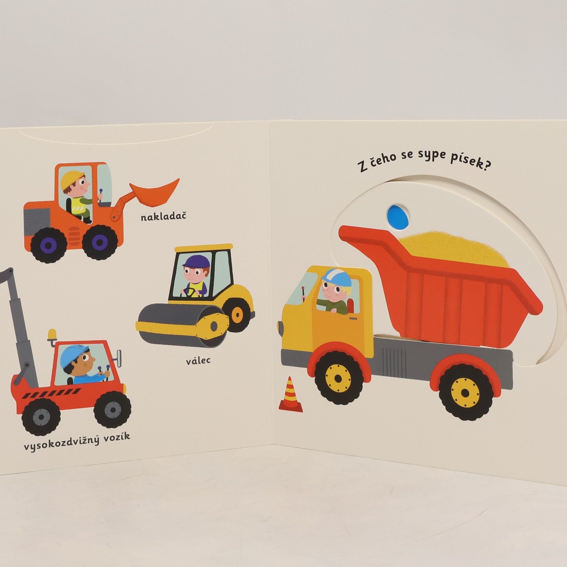 Rozeznávej stavební stroje! Leporelo pro nejmenší děti s posuvnými prvky a pestrými ilustracemi. Který stroj nabírá do lžíce zeminu? Co se sype z míchačky? Jak je vysoký jeřáb? Pojmenuj vše, co se nachází na stavbě, a objevuj svět kolem sebe. Pestrobarevné ilustrace a posuvné prvky v tomto leporelu rozšiřují dětskou slovní zásobu zábavnou formou. Pohyblivé elementy v této knize rozvíjí jemnou motoriku dítěte a přispívají k živosti ilustrací. Knížka s prvky Montessori.