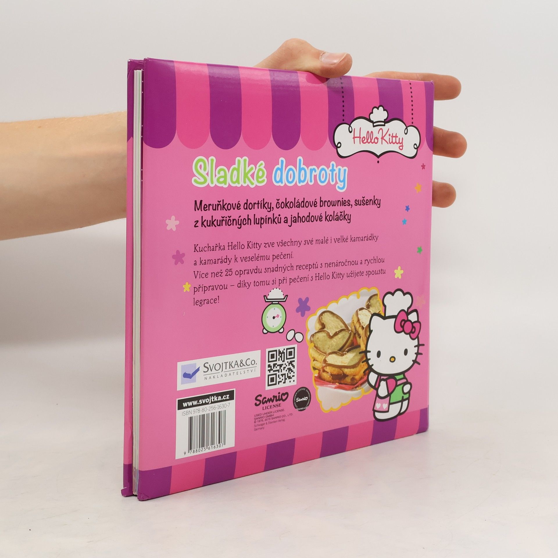 Kuchařka Hello Kitty zve všechny své malé i velké kamarádky a kamarády k veselému pečení sladkých dobrot. Knížka obsahuje více než 25 snadných receptů. Meruňkové dortíky, čokoládové brownies, sušenky z kukuřičných lupínků, jahodové koláčky, čokoládový dort, strakaté sušenky, borůvková zmrzlina, bábovka, malinový pohár a další dobroty – kuchařka Hello Kitty zve všechny své malé i velké kamarádky a kamarády k veselému pečení sladkých dobrot. V knížce najdete více než 25 snadných receptů s nenáročnou a rychlou přípravou, označených podle náročnosti jako recepty pro začátečníky, pokročilé a pro mistry kuchaře. V knížce je ale i mnoho rad a tipů, od pomůcek a surovin až po rady, jak naplánovat párty. Díky tomu všemu si při pečení s Hello Kitty užijete spoustu legrace. Přejeme příjemné mlsání!