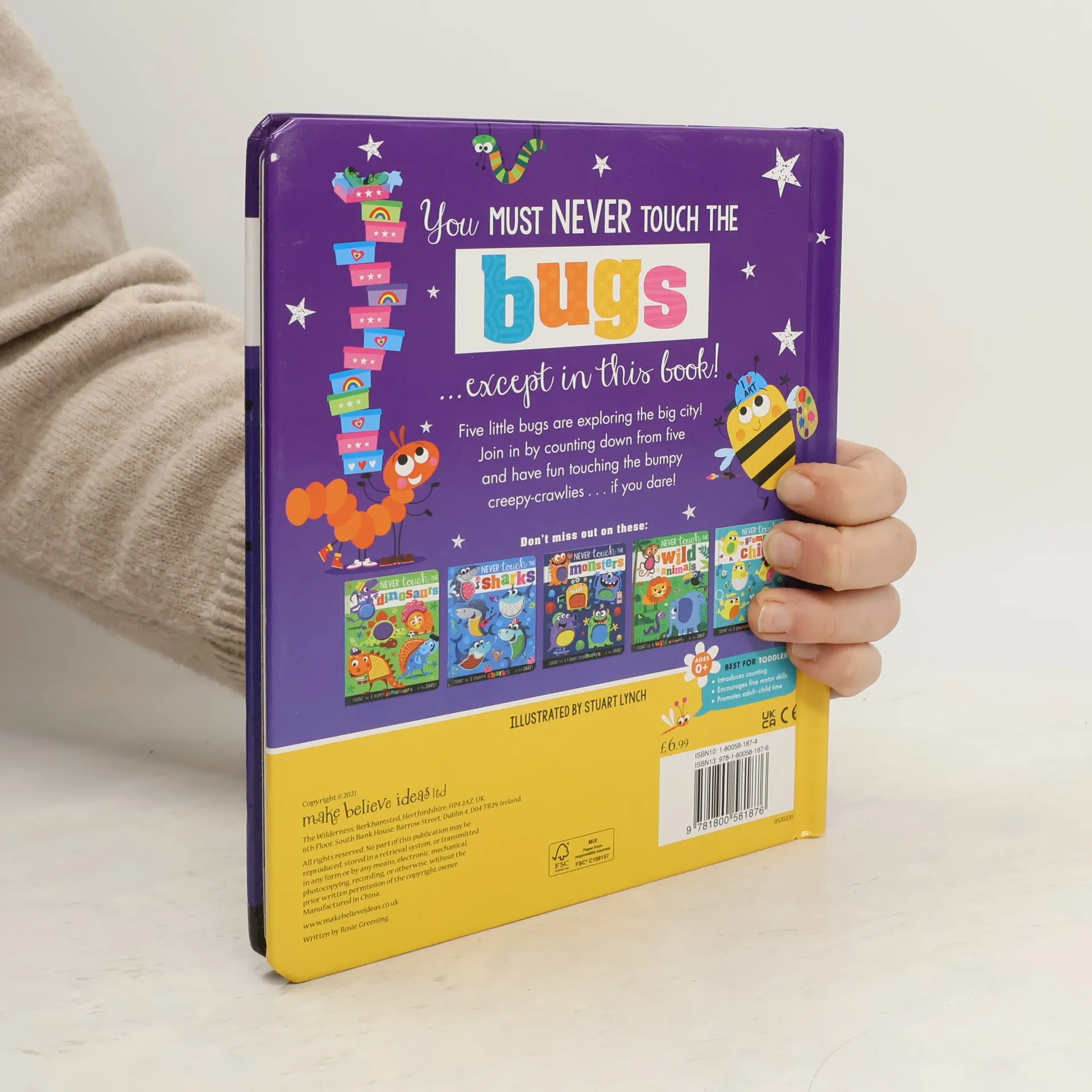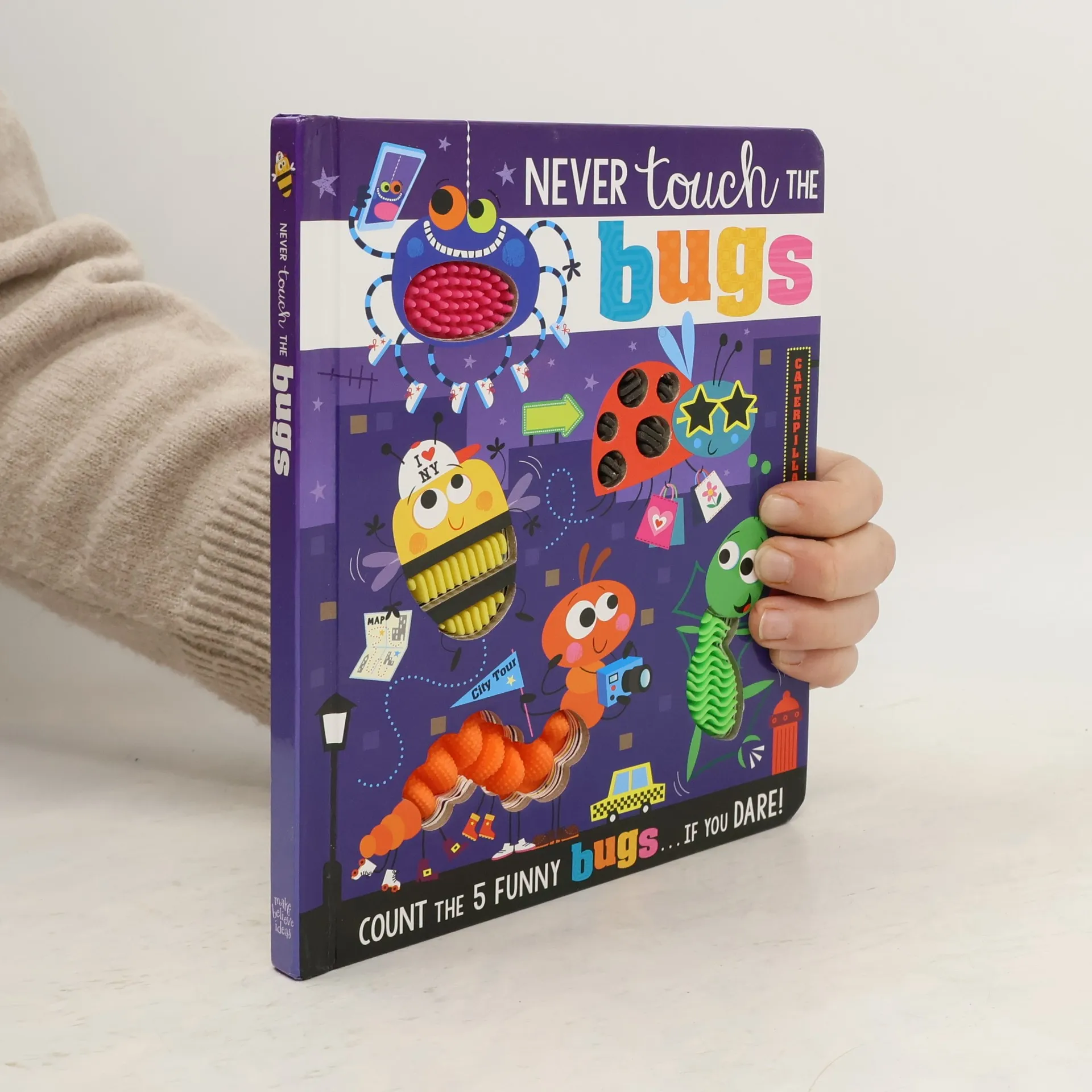 You must never touch the bugs, except in this book! This insect-themed touch-and-feel book makes learning numbers fun. Children will love counting down from five and watching the bugs disappear.