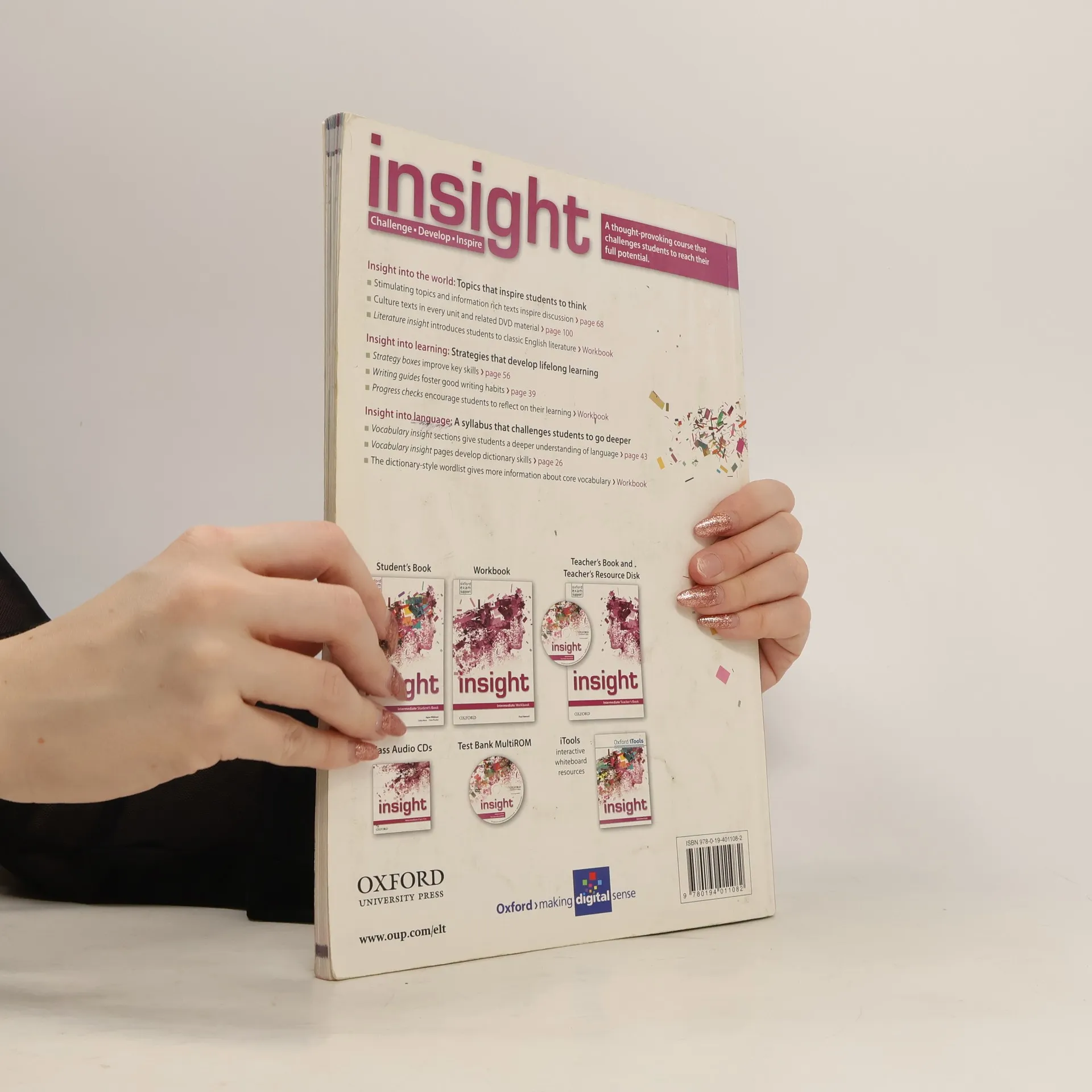 insight will challenge, develop and inspire your students.It will motivate and engage them with thought provoking topics and information rich texts which will challenge their opinions and inspire them to think critically about the world they live in.It will prepare them for a life of learning with a clear focus on developing their skills and autonomous learning habits.It will give your students a deeper awareness of how language works, furnishing them with not just the meaning of vocabulary but also the rules that govern its use, allowing your students to use it with confidence.