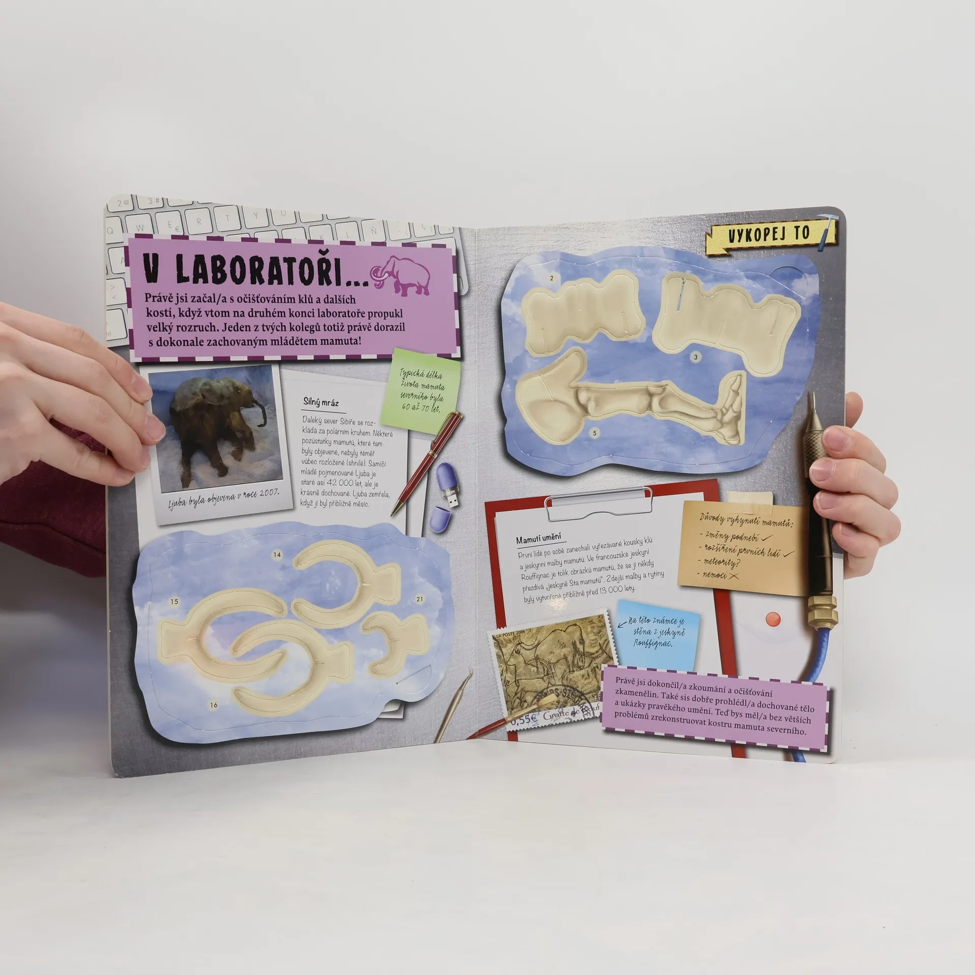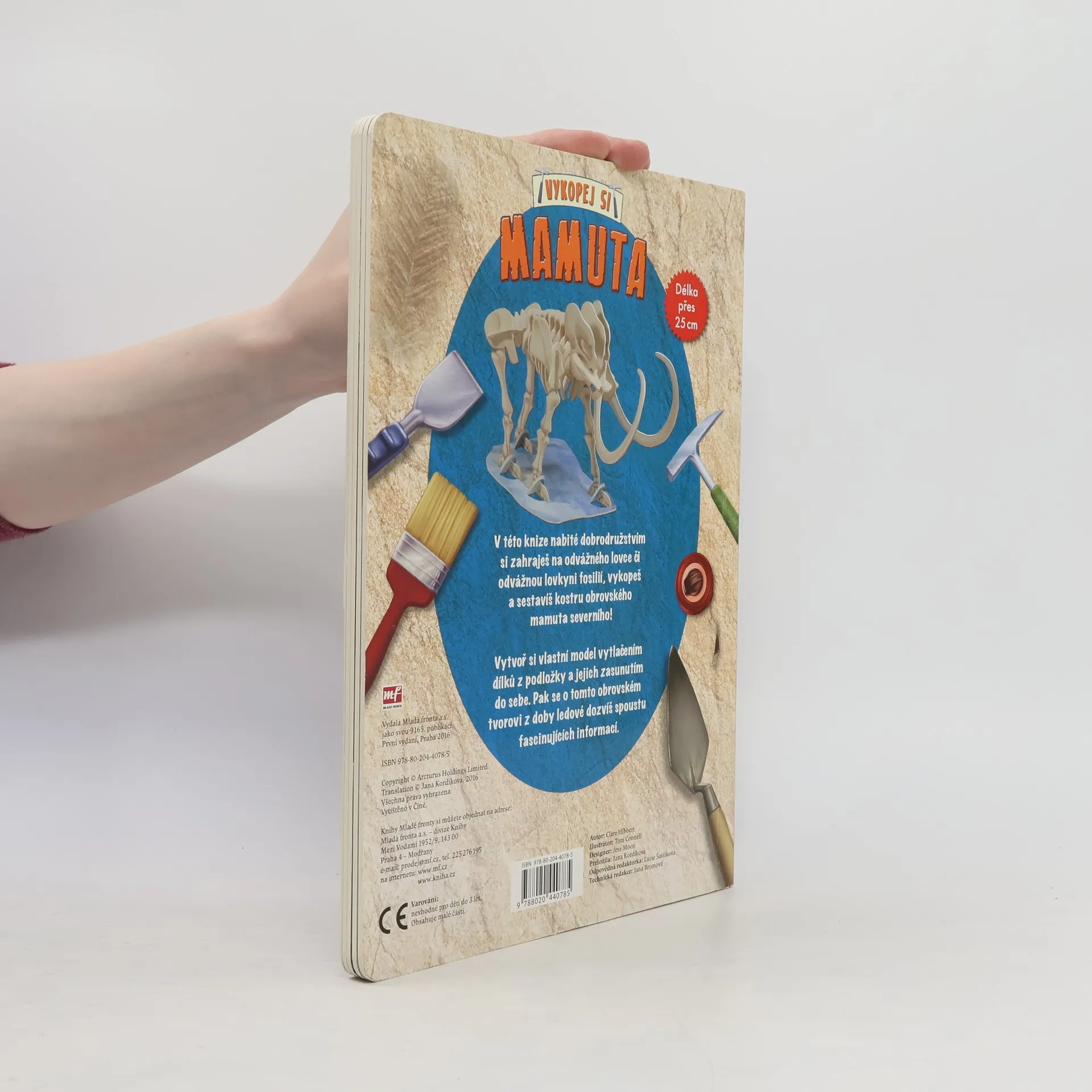 V této výjimečné knize poznáte, jak vypadá práce paleontologa v terénu i v laboratoři, projdete s ním celé dobrodružství od objevení prvních fosilních nálezů až po vystavení exponátů v muzeu. Ale čeká vás ještě mnohem víc. Vlastními silami si sestavíte kostru mamuta severního. Nikdy to nebylo jednodušší! Jednotlivé dílky lze vytlačit z podložky a lehce zasunout do sebe – vznikne model kostry delší než 25 cm. A pod ním se skrývá ještě spousta dalších informací…