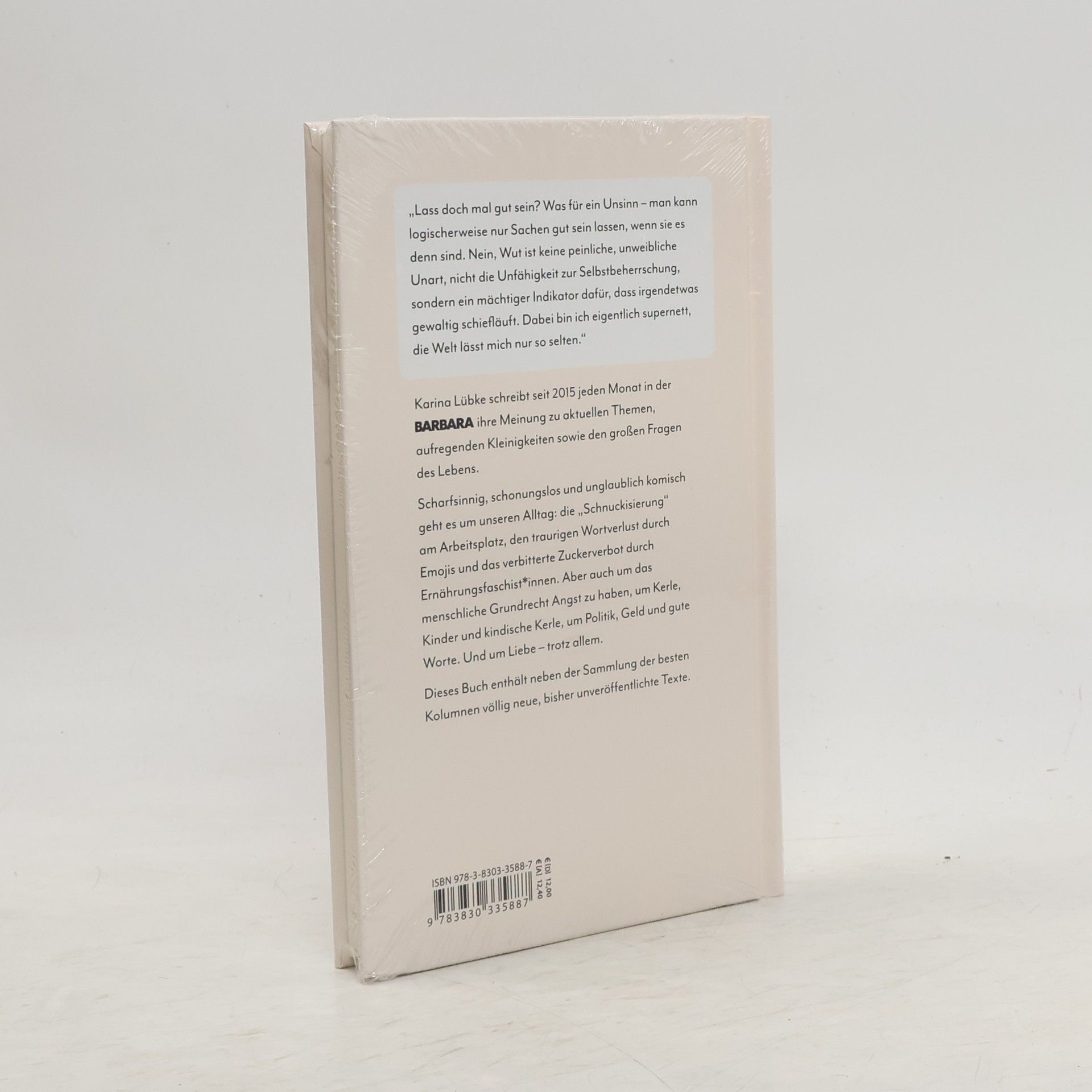 Karina Lübke schreibt seit 2015 jeden Monat ihre Meinung zu aktuellen Themen und den großen Fragen des Lebens in der BARBARA. Scharfsinnig wie -züngig und unglaublich komisch schreibt sie von der Schnuckisierung am Arbeitsplatz, über augenpenetrierende Penisfotos beim Online-Dating, bis zum verbitternden Zuckerverbot durch Ernährungsfaschisten. Es geht um bösartige Natur, den auch mit geblümten Spüllappen nicht wegzuwischenden Hass auf Hausarbeit, traurigen Wortverlust durch Emojis, das menschliche Grundrecht, Angst zu haben und um ihre verbotene Liebe zu High Heels. Es geht um Kerle und Kinder und kindische Kerle, um Politik, Gesellschaft, Geld und gute Worte. Und um Liebe – trotz allem. Dieses Buch fasst ihre besten Kolumnen zusammen und enthält neue, bisher unveröffentlichte Texte.