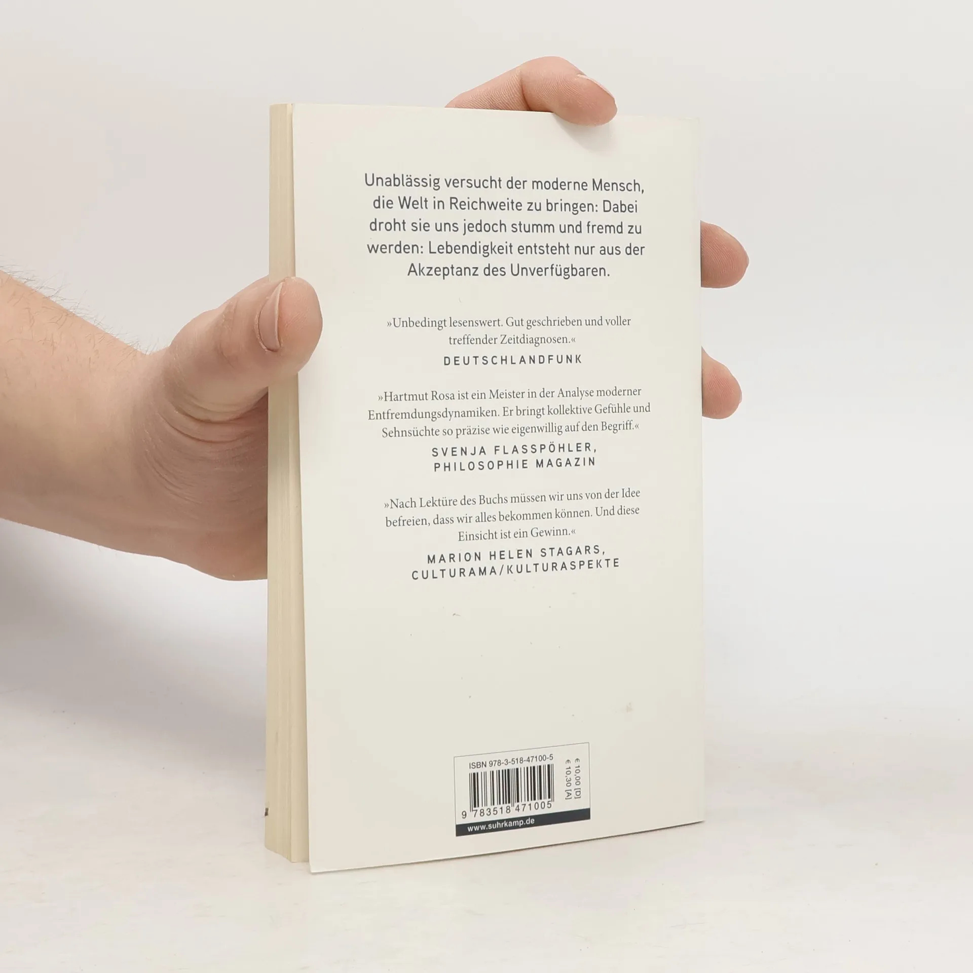 Ein fundiertes Plädoyer für eine Gesellschaft, die der Verfügbarkeit der Welt Grenzen setzt. Das zentrale Bestreben der Moderne gilt der Vergrößerung der eigenen Reichweite, des Zugriffs auf die Welt: Diese verfügbare Welt ist jedoch, so Hartmut Rosas brisante These, eine verstummte, mit ihr gibt es keinen Dialog mehr. Gegen diese fortschreitende Entfremdung zwischen Mensch und Welt setzt Rosa die Resonanz , als klingende, unberechenbare Beziehung mit einer nicht-verfügbaren Welt. Zur Resonanz kommt es, wenn wir uns auf Fremdes, Irritierendes einlassen, auf all das, was sich außerhalb unserer kontrollierenden Reichweite befindet. Das Ergebnis dieses Prozesses lässt sich nicht vorhersagen oder planen, daher eignet dem Ereignis der Resonanz immer auch ein Moment der Unverfügbarkeit.