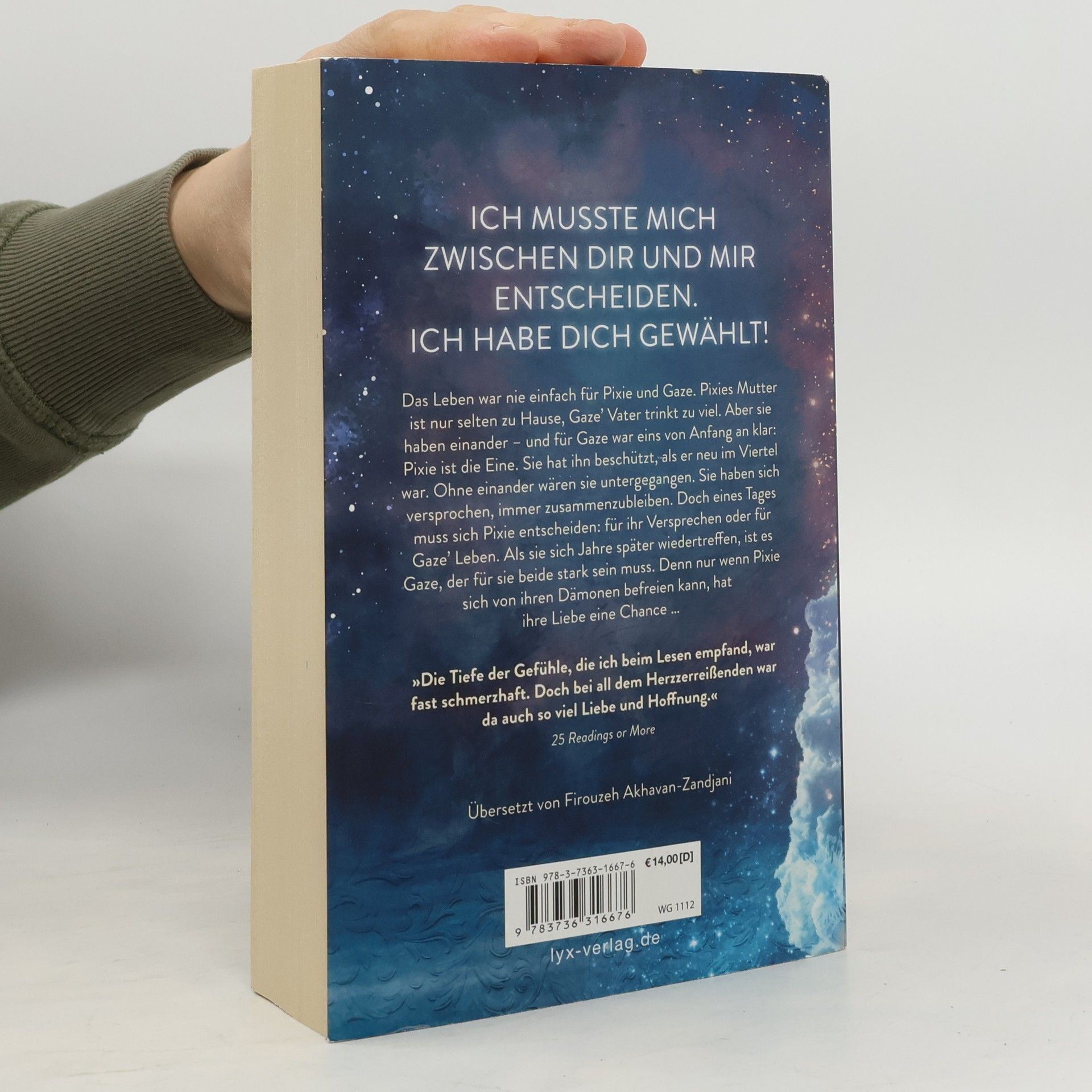 Ich musste mich zwischen dir und mir entscheiden. Ich habe dich gewählt! Das Leben war nie einfach für Pixie und Gaze. Pixies Mutter ist nur selten zu Hause, Gaze’ Vater trinkt zu viel. Aber sie haben einander - und für Gaze war eins von Anfang an klar: Pixie ist die Eine. Sie hat ihn beschützt, als er neu im Viertel war. Ohne einander wären sie untergegangen. Sie haben sich versprochen, immer zusammenzubleiben. Doch eines Tages muss sich Pixie entscheiden: für ihr Versprechen oder für Gaze’ Leben. Als sie sich Jahre später wiedertreffen, ist es Gaze, der für sie beide stark sein muss. Denn nur wenn Pixie sich von ihren Dämonen befreien kann, hat ihre Liebe eine Chance ... "Die Tiefe der Gefühle, die ich beim Lesen empfand, war fast schmerzhaft. Doch bei all dem Herzzerreißenden war da auch so viel Liebe und Hoffnung." 25 READINGS OR MORE Auftakt der dramatischen New-Adult-Dilogie
