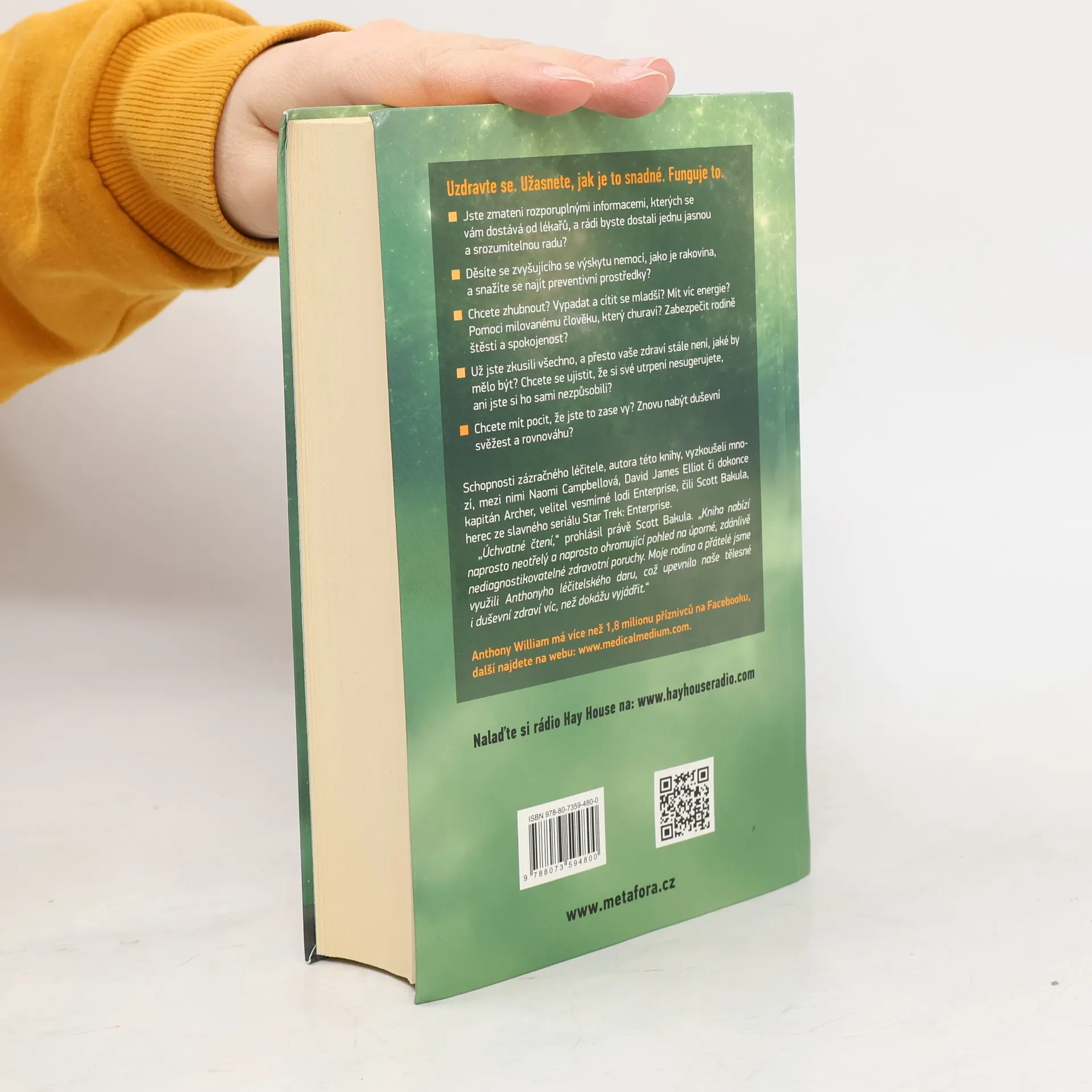 Novodobé médium odhaluje tajemství záhadných nemocí. Uzdravte se. Užasnete, jak je to snadné. Funguje to. Jste zmateni rozporuplnými informacemi, kterých se vám dostává od lékařů, a rádi byste dostali jednu jasnou, srozumitelnou radu? Děsíte se rakoviny? Chcete zhubnout? Vypadat a cítit se mladší? Mít víc energie? Nebo jste prostě nemocní a nikdo neví, co s vámi? Dokonce vám naznačují, že jste blázni a že si své potíže sugerujete. Už jste všechno zkusili, všude zašli, a přesto vám žádný doktor nepomohl. Pak jste na té správné adrese. Léčitel Anthony William zná cestu z toho začarovaného kruhu. Tam někde ve vyšších sférách jsou uložené veškeré informace. Řešení všeho. Léčebné metody, které lékařská věda objeví až pár let či dokonce desetiletí. A Anthony je zná.