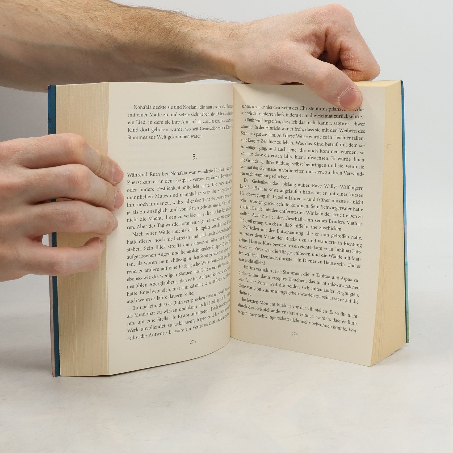 Fernab ihrer verfeindeten Familien in Hamburg soll für Ruht und Hinrich Mensing auf der Südsee-Insel Hiva Oa ein neues Leben beginnen: Hinrich möchte dort den Stamm der Hanatea zum Christentum bekehren – Berichte über Kannibalen auf der Insel hält er für übertrieben.Tatsächlich wird das junge Ehepaar freundlich aufgenommen. Ruth schließt schnell Freundschaft mit der Frau des Häuptlings und beginnt, die Sprache der Hanatea zu lernen. Das gefällt Hinrich zwar nicht besonders, andererseits gelingt es ihm aber dank Ruths Hilfe mehr als einmal, die Hanatea zu beeindrucken und zu einem geachteten Mitglied des Stammes aufzusteigen. Bald ist er überzeugt, große Fortschritte als Missionar zu machen.Als jedoch ein feindlich Stamm das Dorf überfällt, muss Hinrich erkennen, wie sehr er die alten Götter der Hanatea unterschätzt hat