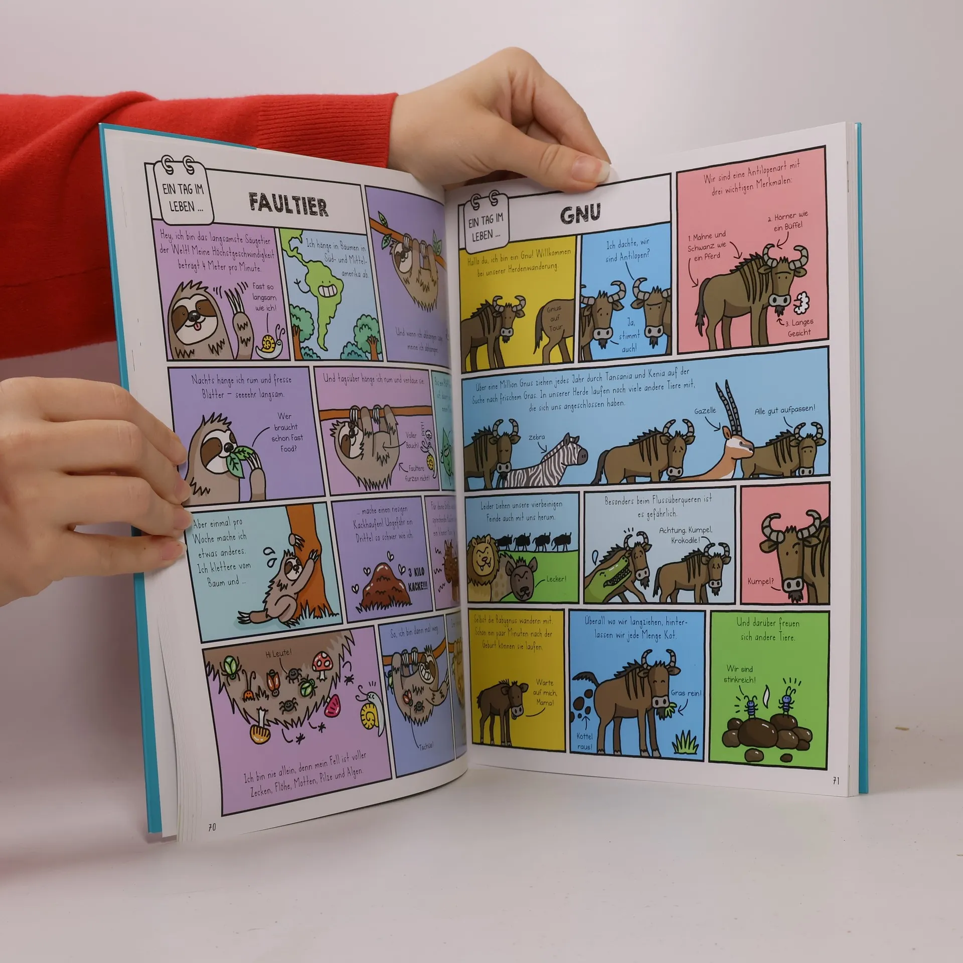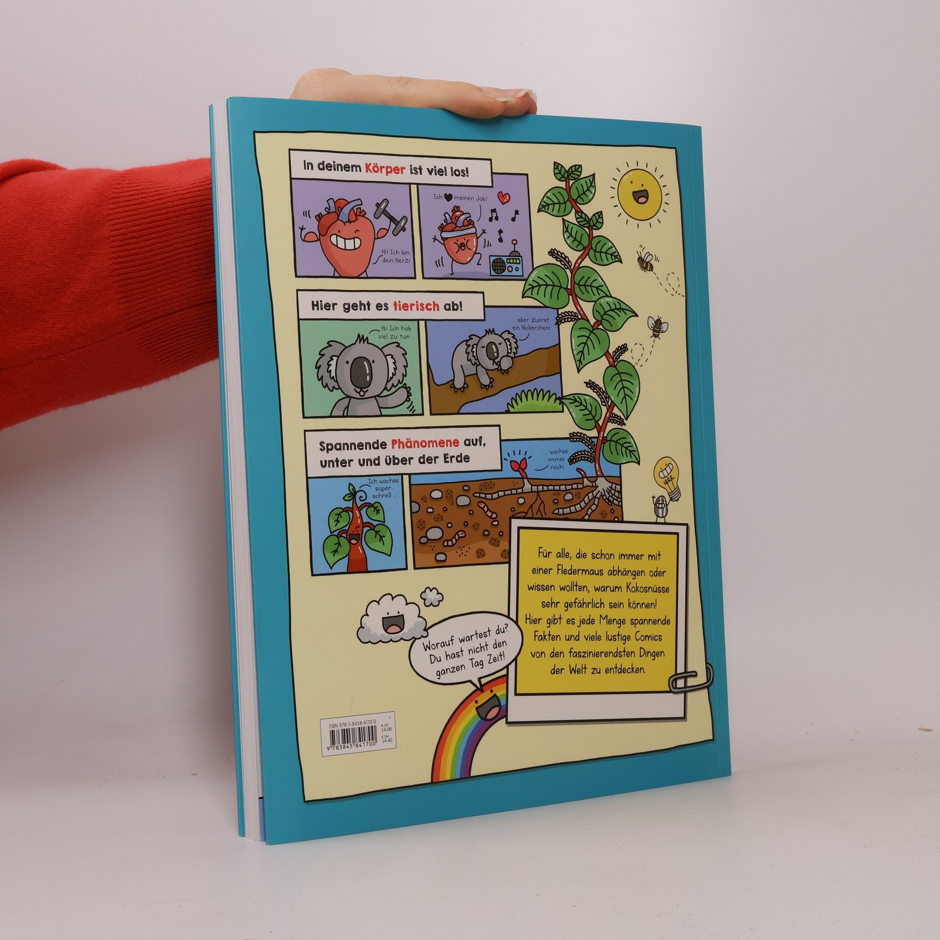 Lustiges Wissensbuch zum Leben auf der Erde (und manchmal auch darüber hinaus!) Was haben Mo, ein beißender Backenzahn, ein dreckwühlender Mistkäfer und Mister Twister gemeinsam? Es gibt sie alle in diesem supertollen Buch! Mach dich bereit für jede Menge spannende Fakten und vielen lustigen Comics von den faszinierendsten Dingen der Welt. Thema Körper: Jede Menge spannende Fakten über Popel, Pickel, Schluckauf, Pupse, Zähne, Knochen und vieles mehr Thema Tiere: Jede Menge fliegende, krabbelnde, schwimmende, laufende, kriechende, flatternde Tiere erzählen aus ihrem Leben. Thema Erde/Wissenschaft: In diesem Teil geht es um spannende Phänomene auf, unter und über der Erde. Pflanzen und Planeten, Schneeflocken, Satelliten, Bäume, Tornados ... Illustrationen: Durchgehend im Comicstil gehalten Ein Tag im Leben von ... Wenn du schon immer mit einer Fledermaus abhängen wolltest, dich mit einem Schuppentier zusammenrollen oder wissen wolltest, was eine pupsige Kackwurst den ganzen lieben langen Tag so treibt, dann schau rein – du hast nicht den ganzen Tag Zeit!
