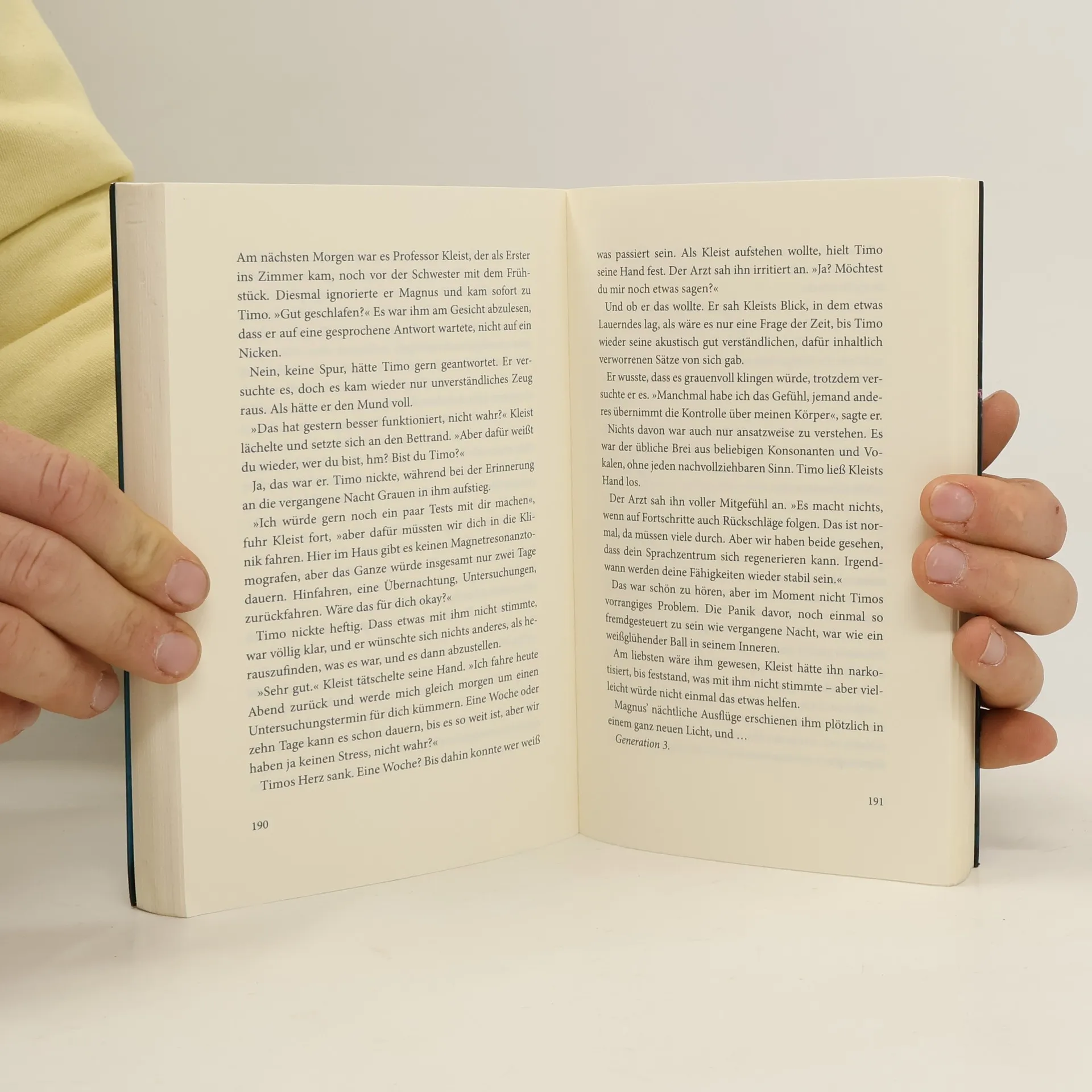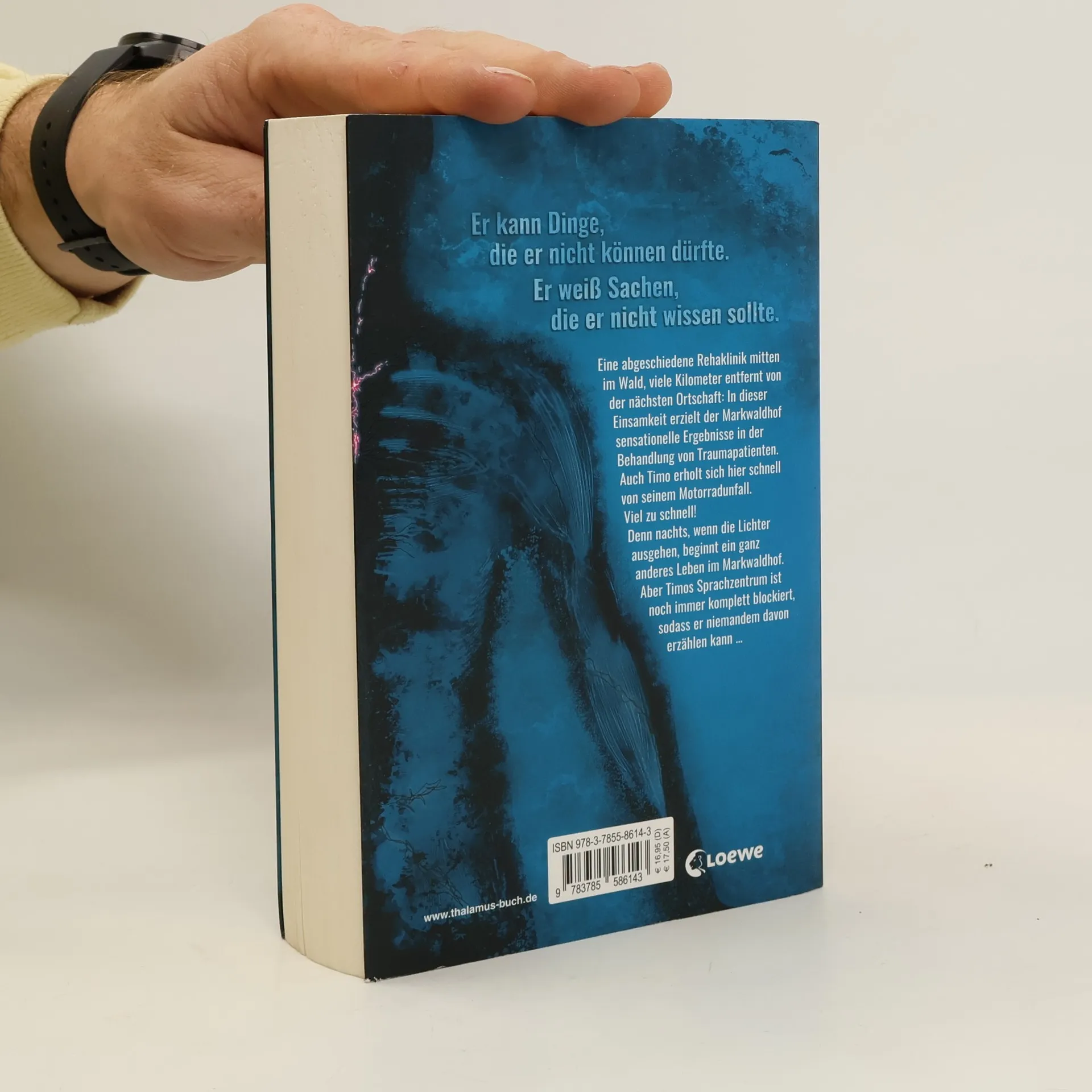 Eine abgelegene Rehaklinik ist Schauplatz des Med-Thrillers von Bestseller-Autorin Ursula Poznanski . Diesmal denkt die ehemalige Medizinjournalistin Chancen und Gefahren der modernen Hirnforschung konsequent weiter und trifft wieder einmal einen Nerv – buchstäblich! Ein schwerer Motorradunfall katapultiert den siebzehnjährigen Timo aus seinem normalen Leben und fesselt ihn für Monate ans Krankenbett. Auf dem Markwaldhof, einem Rehabilitationszentrum, soll er sich von seinen Knochenbrüchen und dem Schädelhirntrauma erholen. Aber schnell stellt Timo fest, dass sich merkwürdige Dinge im Haus abspielen: Der Junge, mit dem er sich das Zimmer teilt, gilt als Wachkomapatient und hoffnungsloser Fall, doch nachts läuft er herum, spricht – und droht Timo damit, ihn zu töten, falls er anderen davon erzählt. Eine Sorge, die unbegründet ist, denn Timos Sprachzentrum ist schwer beeinträchtigt, seine Feinmotorik erlaubt ihm noch nicht niederzuschreiben, was er erlebt. Und allmählich entdeckt er an sich selbst Fähigkeiten, die neu sind. Er kann Dinge, die er nicht können dürfte. Weiß von Sachen, die er nicht wissen sollte …