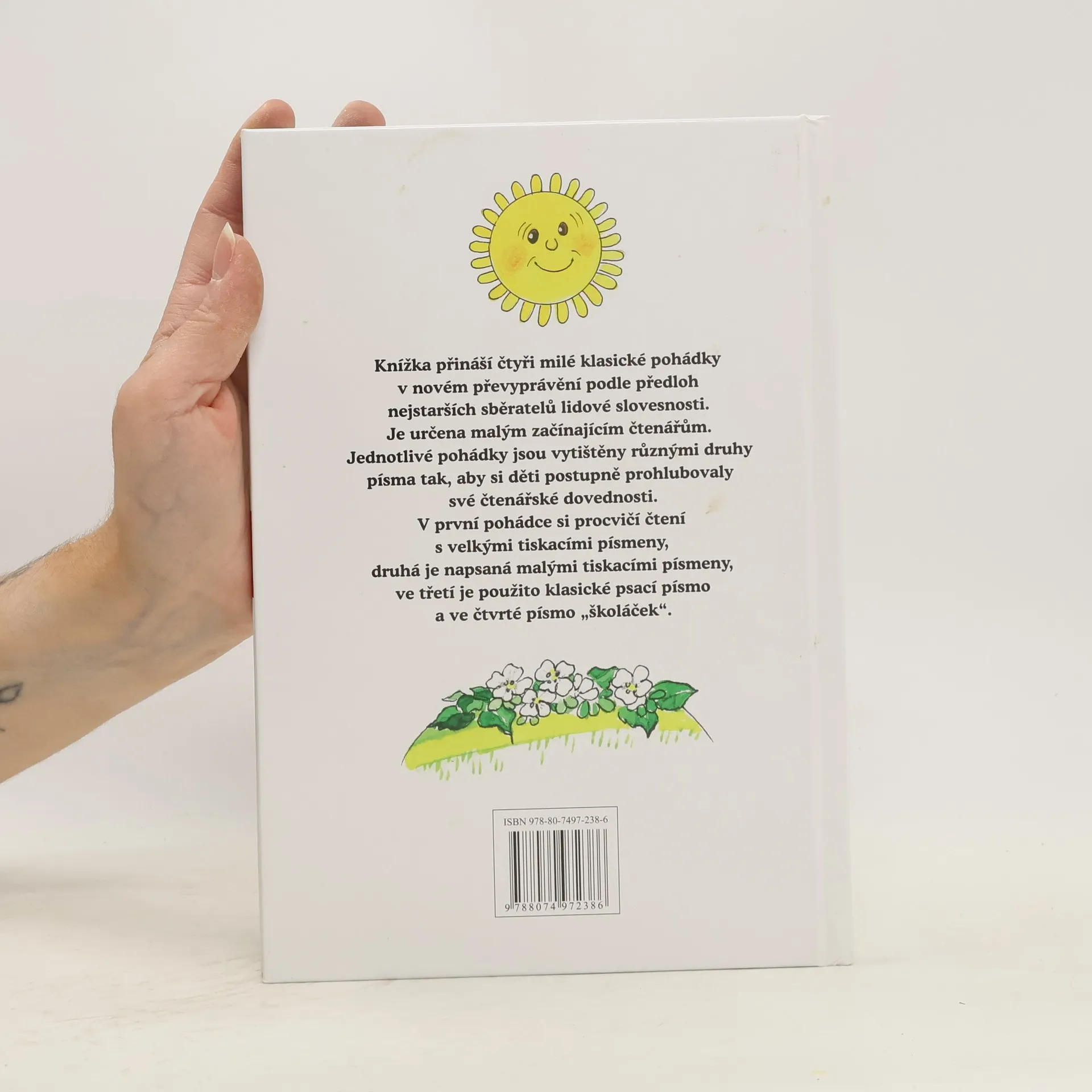 Knížka přináší čtyři milé klasické pohádky v novém převyprávění podle předloh nejstarších sběratelů lidové slovesnosti. Je určena malým začínajícím čtenářům. Jednotlivé pohádky jsou vytištěny různými druhy písma tak, aby si děti postupně prohlubovaly své čtenářské dovednosti. V první pohádce si procvičí čtení s velkými tiskacími písmeny, druhá je napsaná malými tiskacími písmeny, ve třetí je použito klasické psací písmo a ve čtvrté písmo „školáček“.