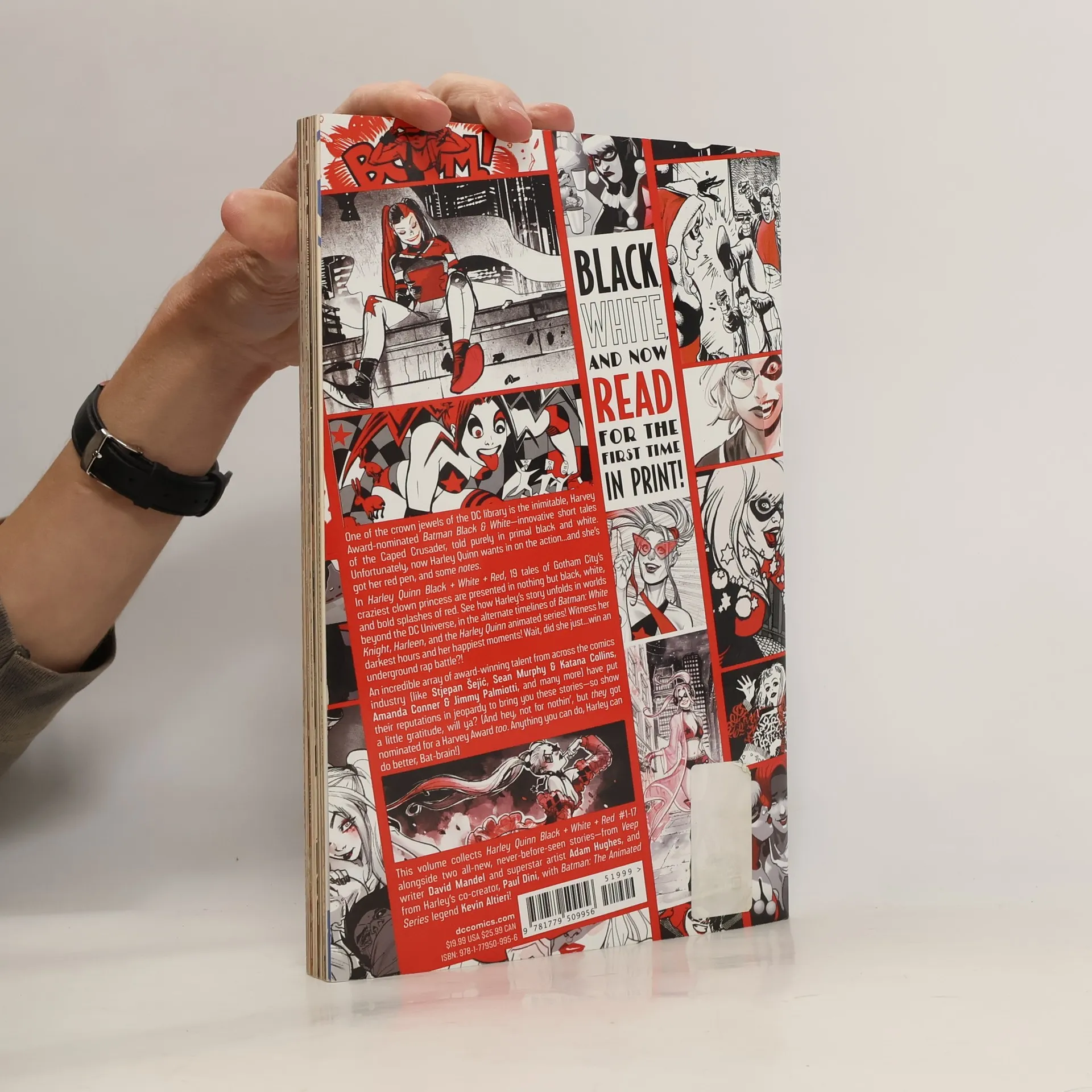 Black, white, and now READ for the first time in print! One of the crown jewels of the DC library is the inimitable, Harvey Award-nominated Batman Black & White—innovative short tales of the Caped Crusader, told purely in primal black and white. Unfortunately, now Harley Quinn wants in on the action...and she's got her red pen, and some notes. In Harley Quinn Black + White + Red, 19 tales of Gotham City's craziest clown princess are presented in nothing but black, white, and bold splashes of red. See how Harley's story unfolds in worlds beyond the DC Universe, in the alternate timelines of Batman: White Knight, Harleen, and the Harley Quinn animated series! Witness her darkest hours and her happiest moments! Wait, did she just...win an underground rap battle?! An incredible array of award-winning talent from across the comics industry (like Stjepan Šejić, Sean Murphy & Katana Collins, Amanda Conner & Jimmy Palmiotti, and many more) have put their reputations in jeopardy to bring you these stories—so show a little gratitude, will ya? (And hey, not for nothin', but they got nominated for a Harvey Award too. Anything you can do, Harley can do better, Bat-brain! This volume collects Harley Quinn Black + White + Red #1-17, alongside two all-new, never-before-seen stories—from Veep writer David Mandel and superstar artist Adam Hughes, and from Harley's co=creator, Paul Dini, with Batman: The Animated Series legend Kevin Altieri!