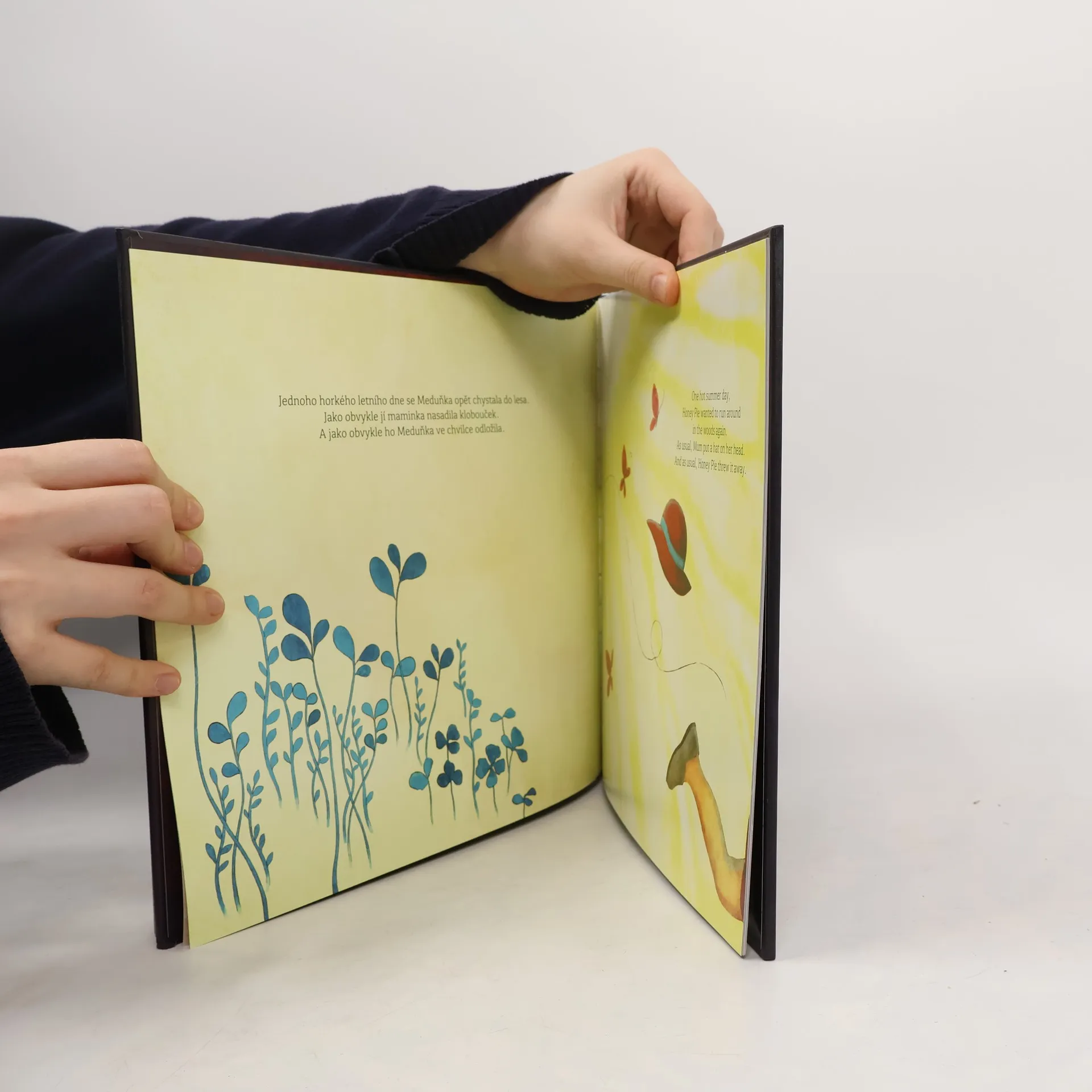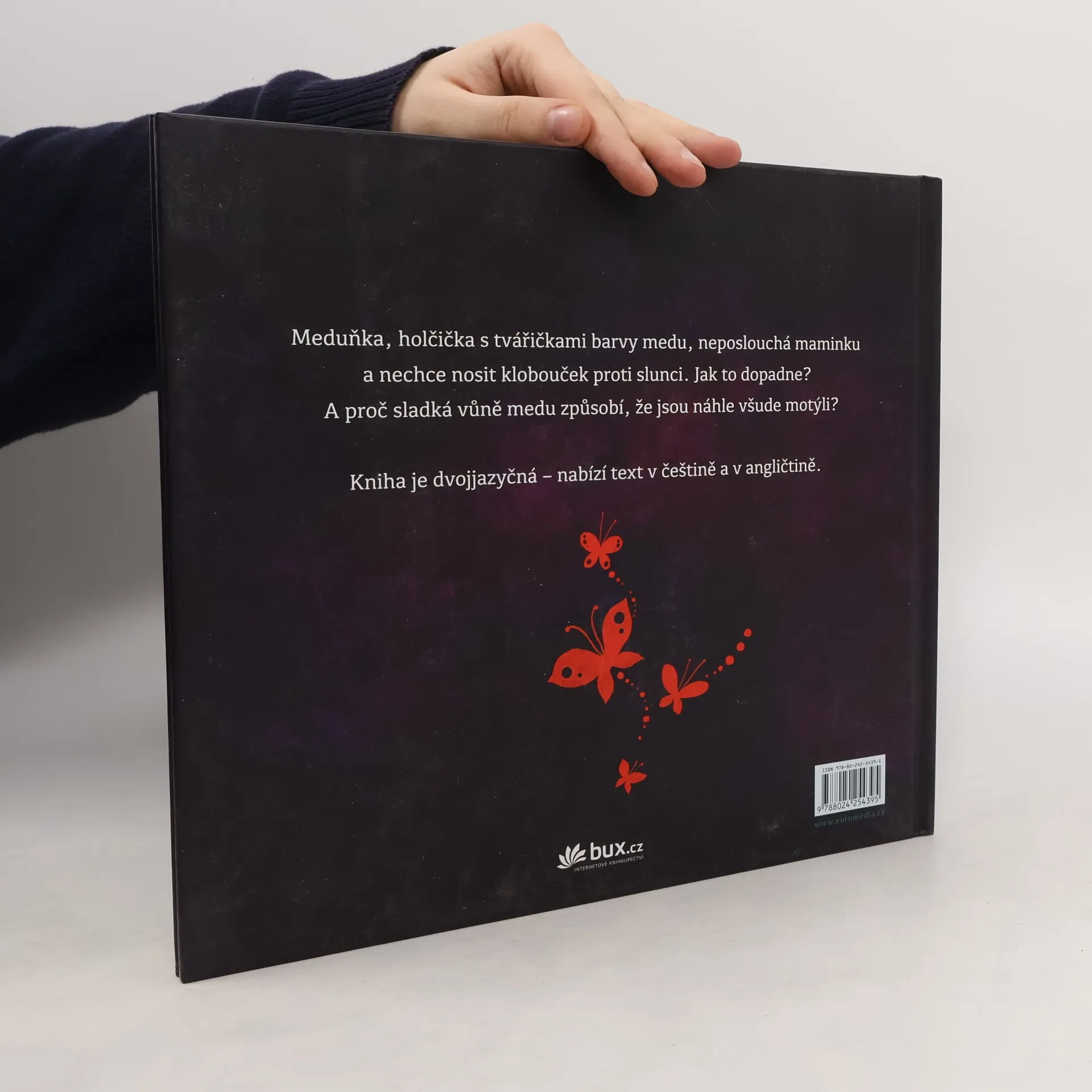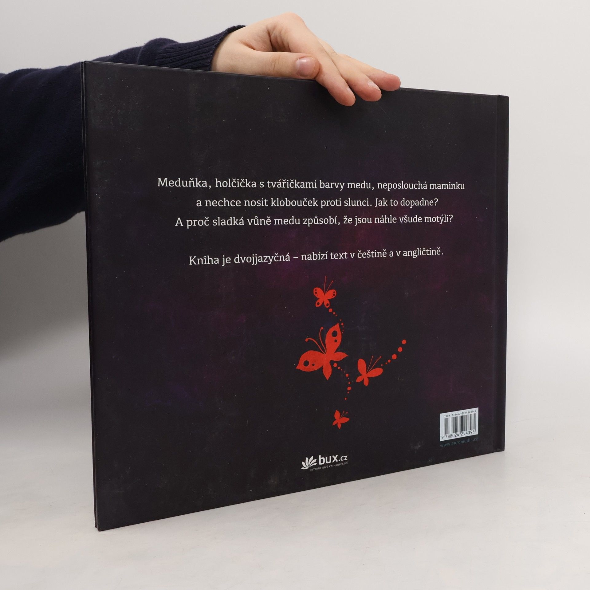 Půvabná knížka pro nejmenší děti na první pohled upoutá obálkou s 3D efektem a poetickými ilustracemi, které spolu s hřejivým příběhem vytvářejí téměř snovou atmosféru. Meduňka, která si ráda hraje venku, nedbá maminčiných rad, aby na slunci nosila klobouček. A tak jednoho letního dne, když na sluníčku usne v trávě… Copak se přihodí? Proč sladká vůně medu způsobí, že jsou náhle všude motýli?… Kniha vychází dvojjazyčně – nabízí paralelní text v češtině a v angličtině.